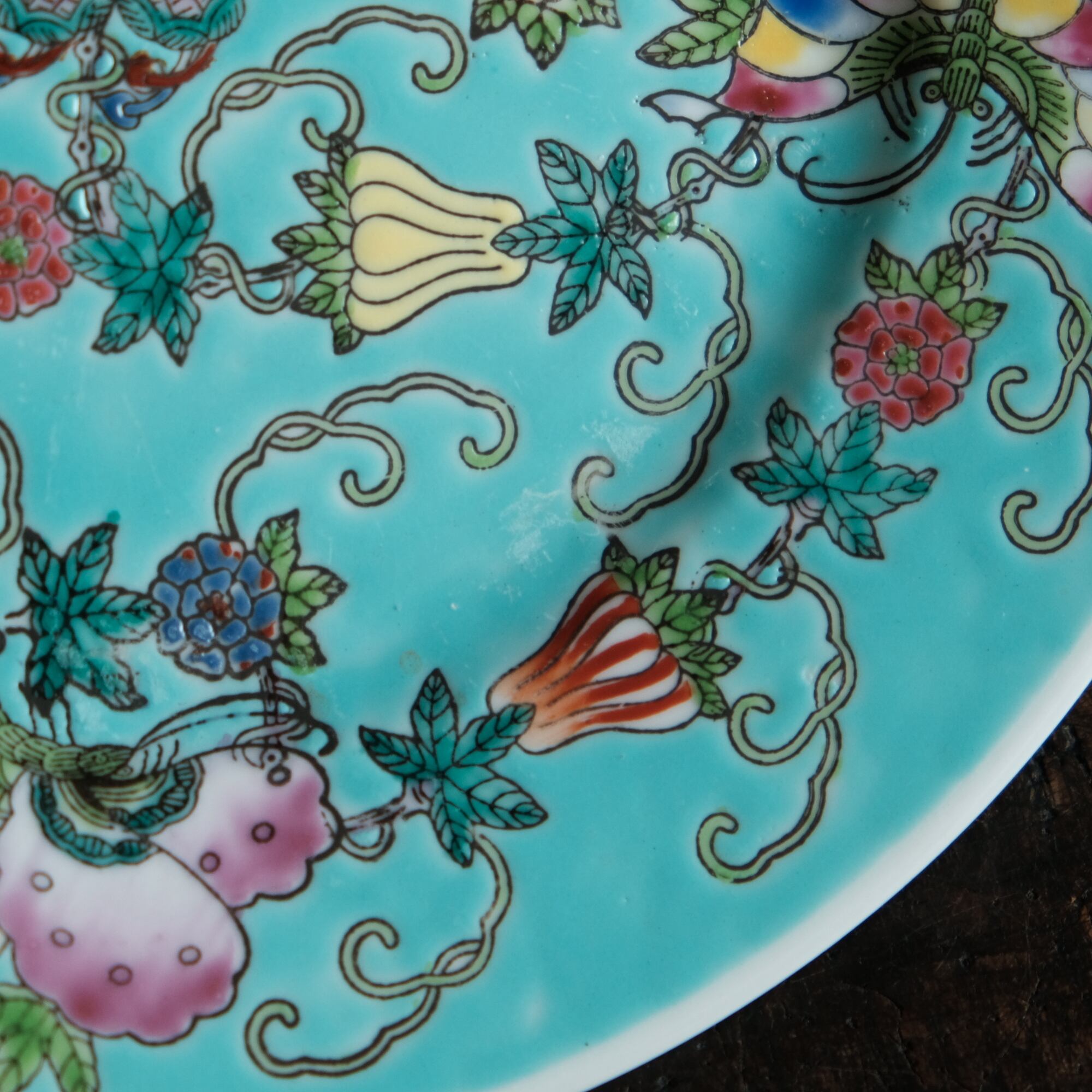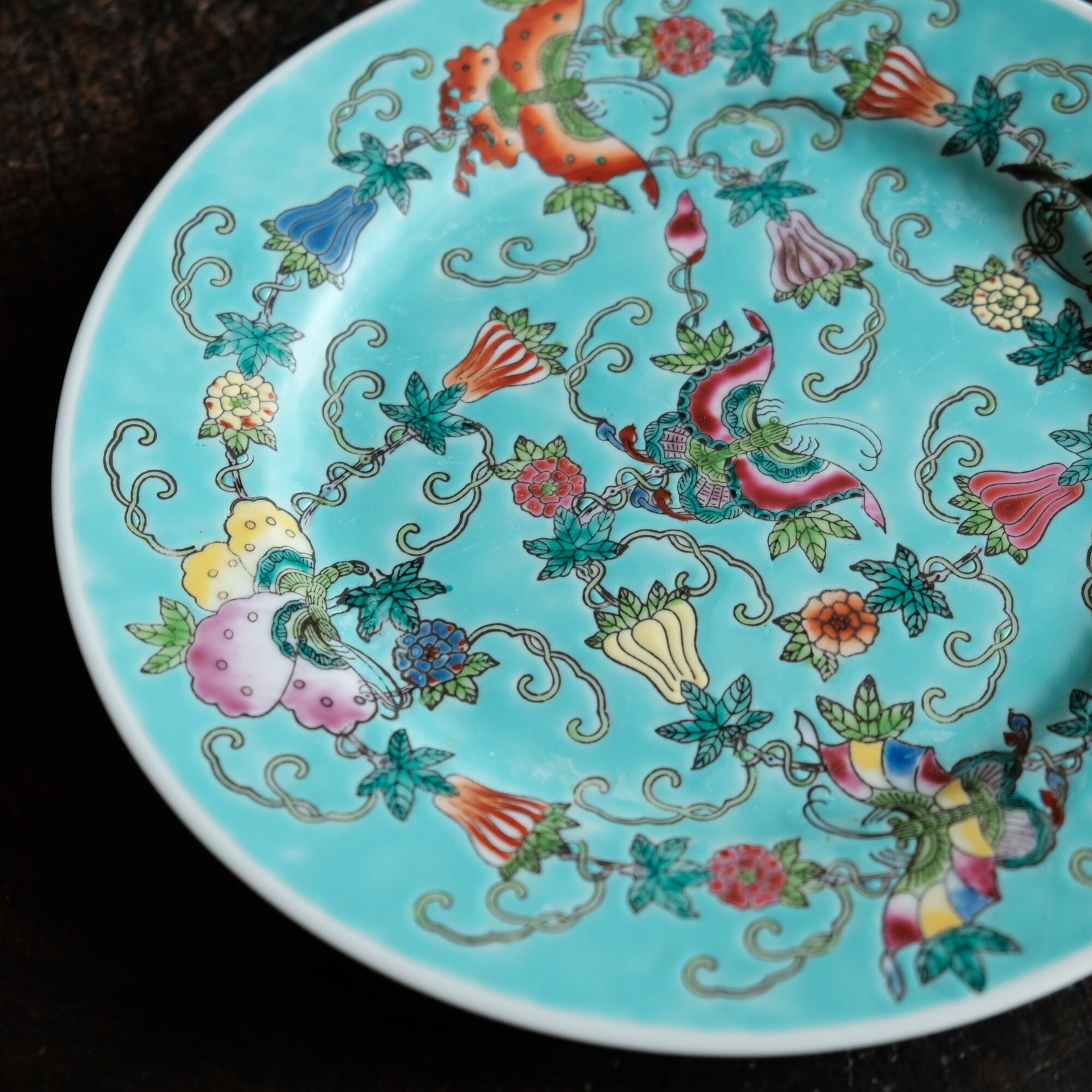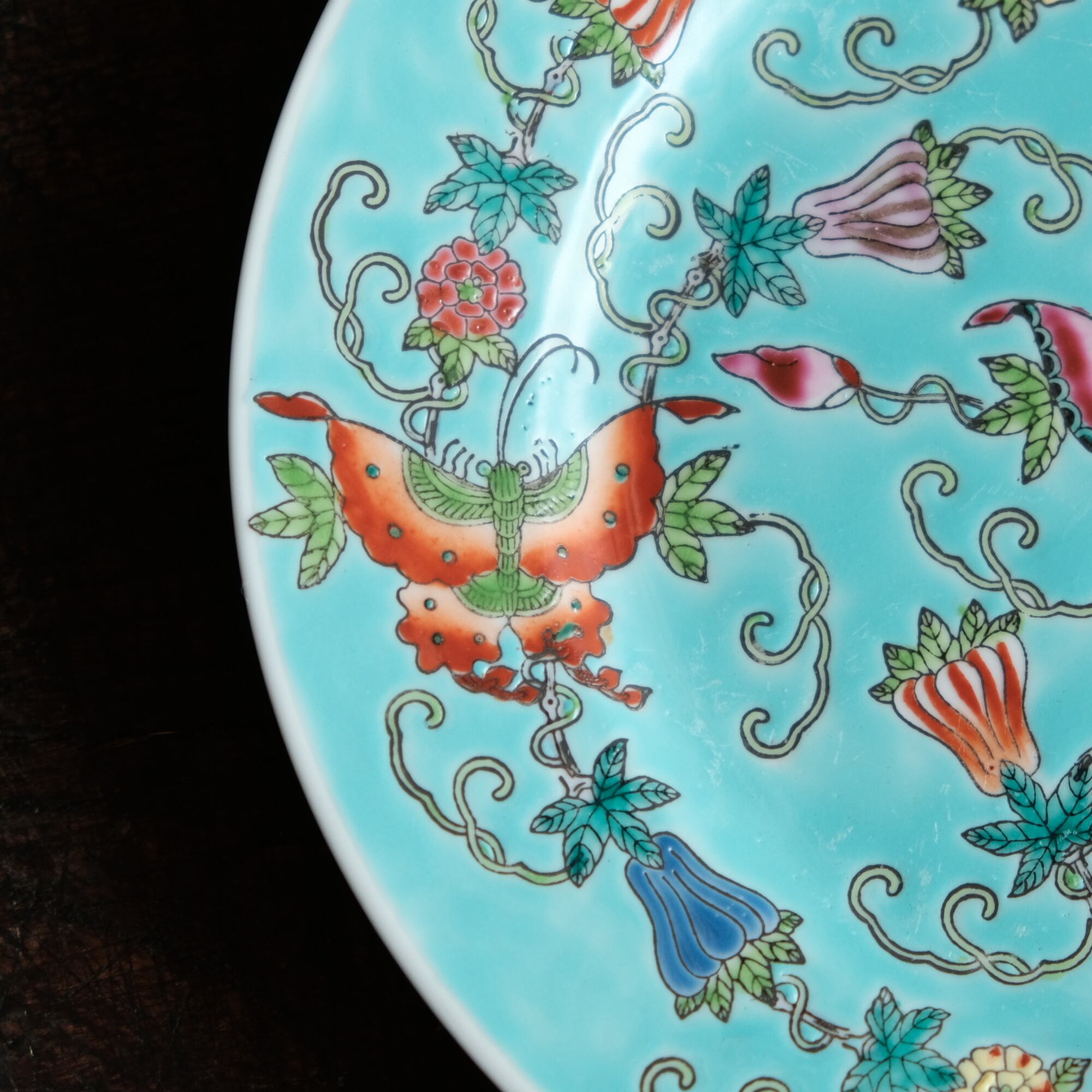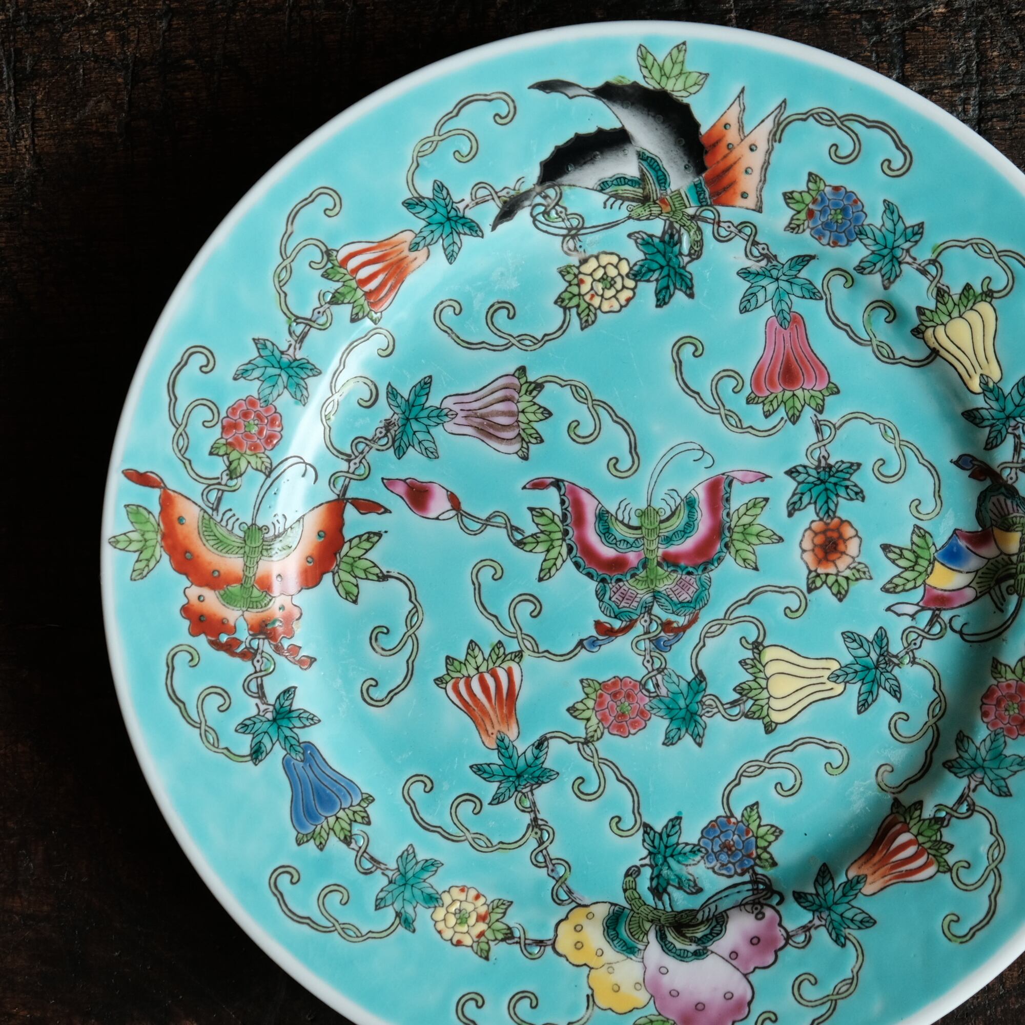 ビビットカラーで可愛い◆花と蕾と蝶々 中国景徳鎮 色絵中皿 中華・台湾料理 チャイナレトロ