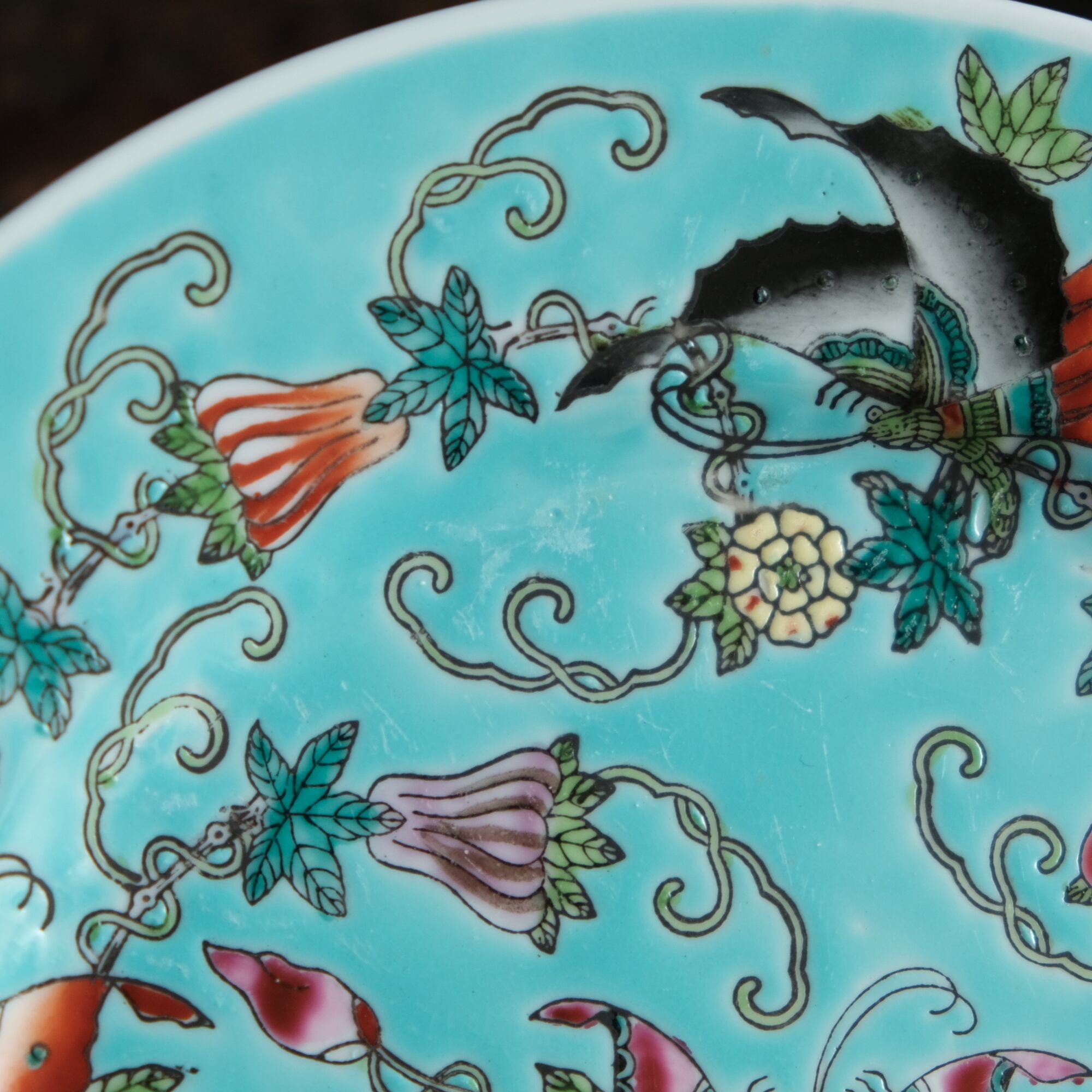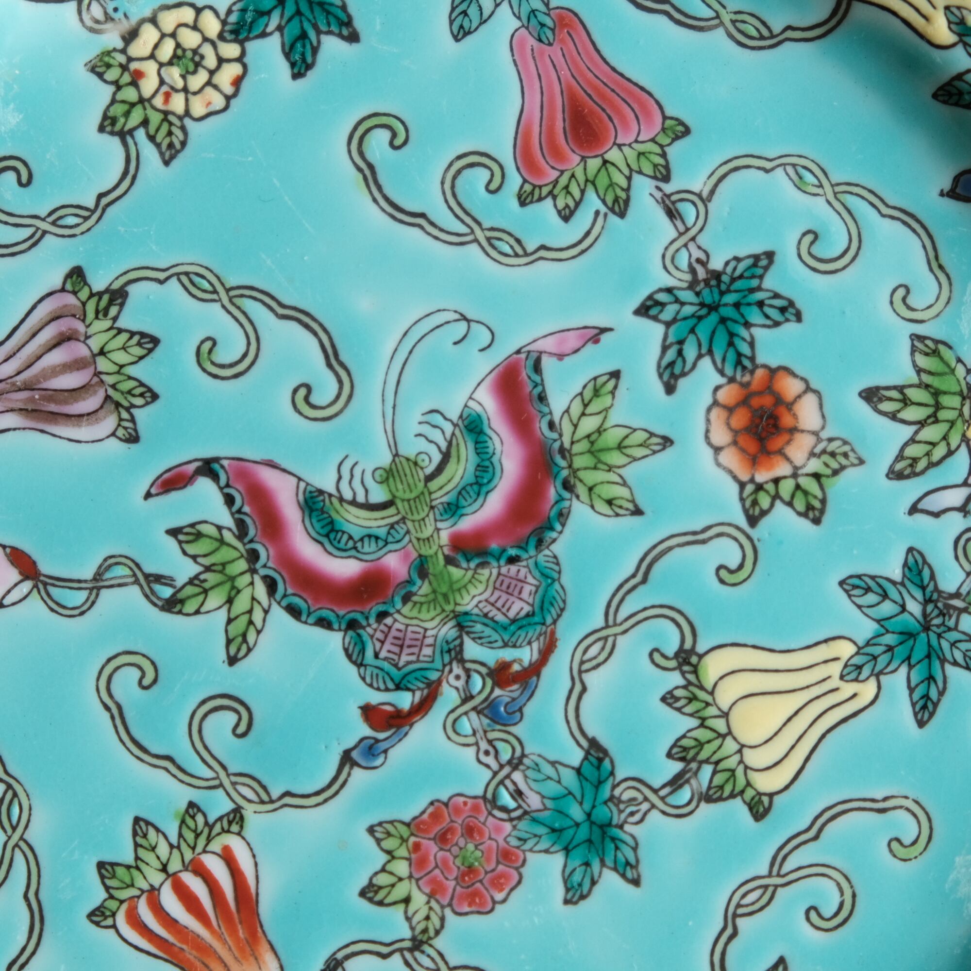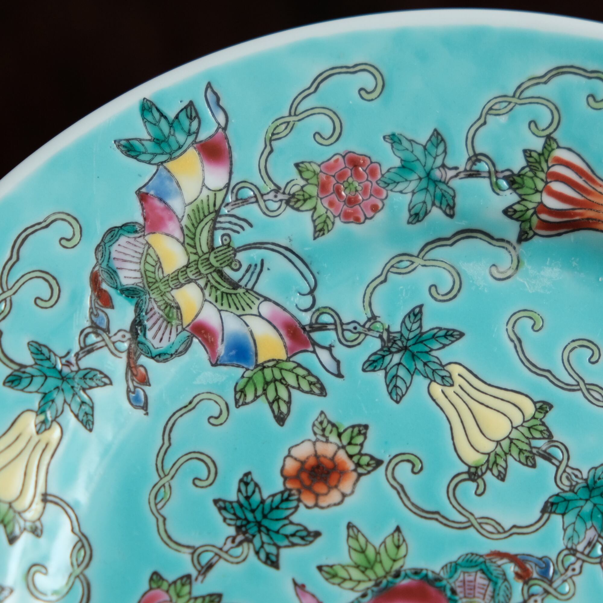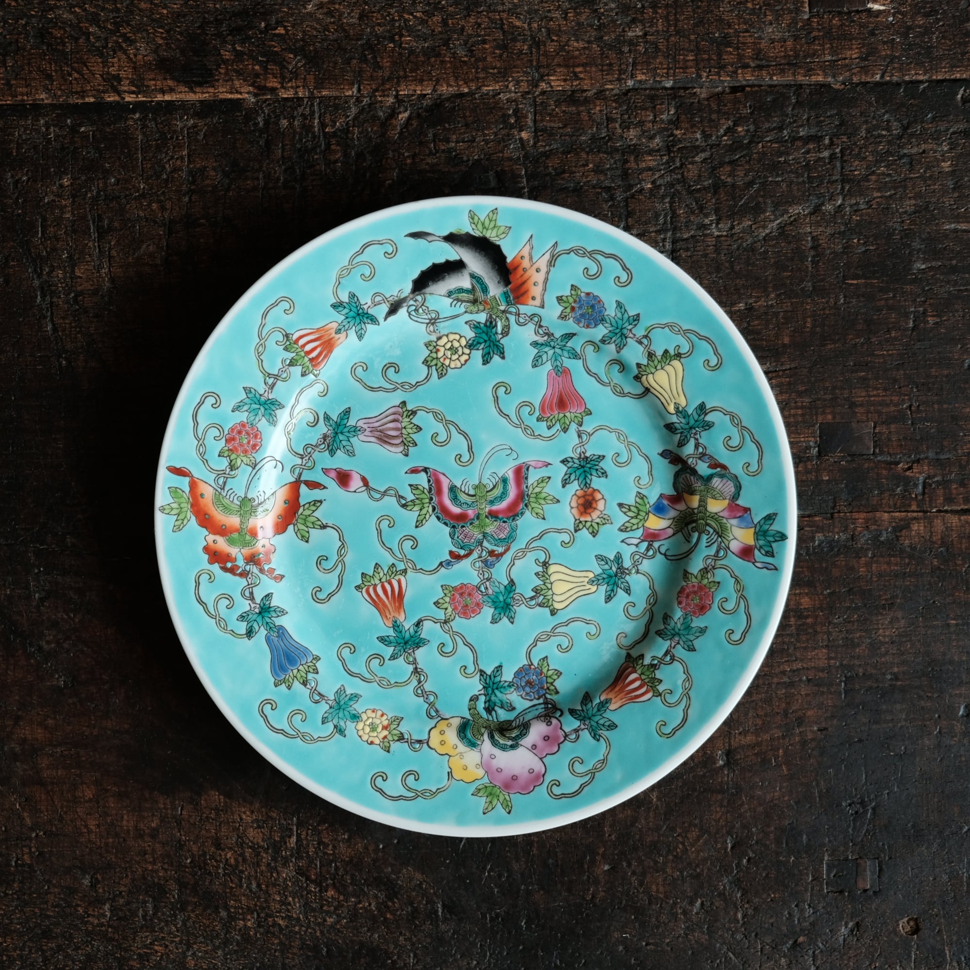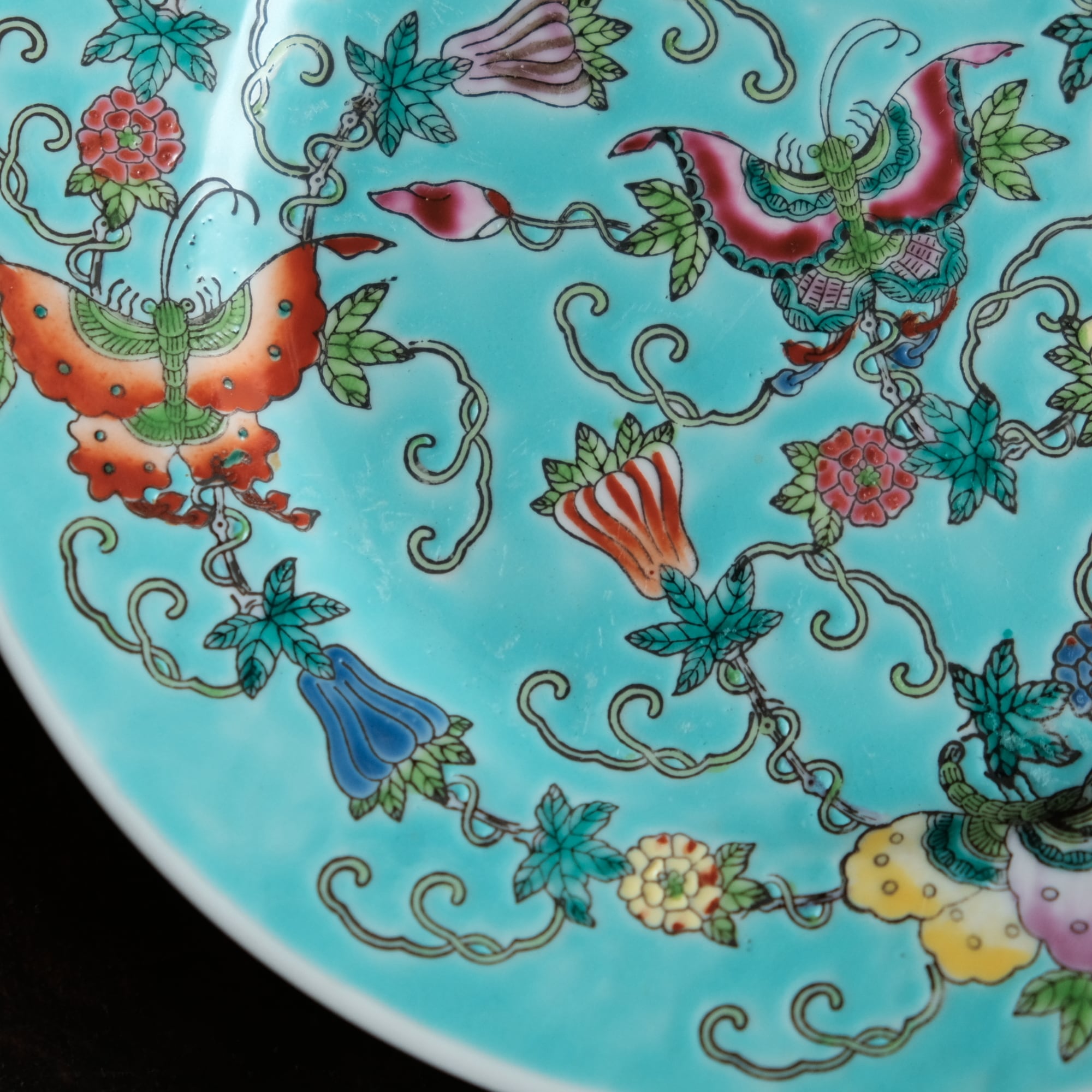 ビビットカラーで可愛い◆花と蕾と蝶々 中国景徳鎮 色絵中皿 中華・台湾料理 チャイナレトロ