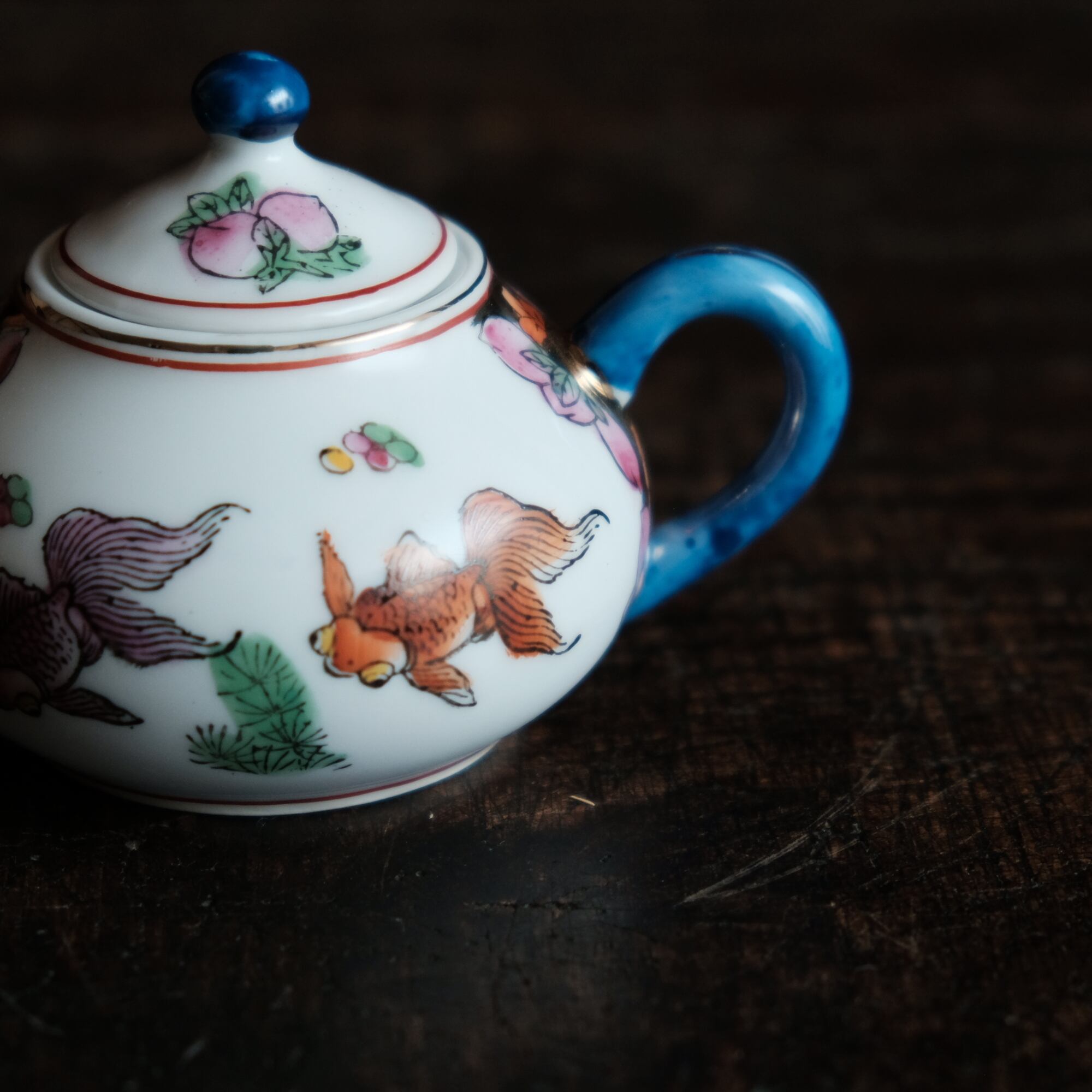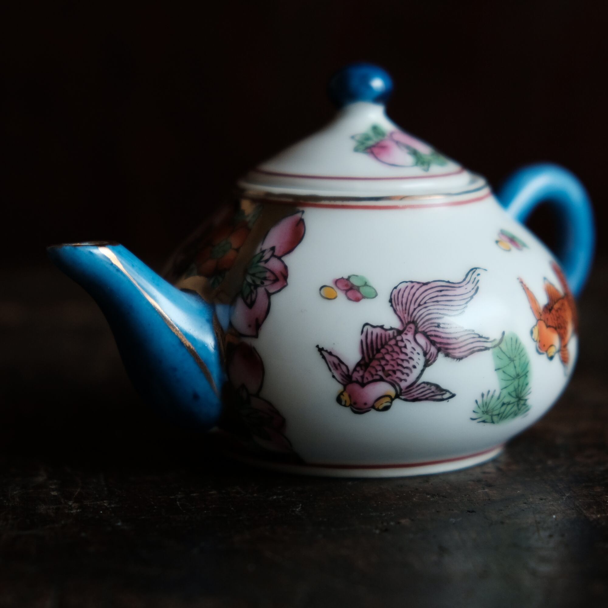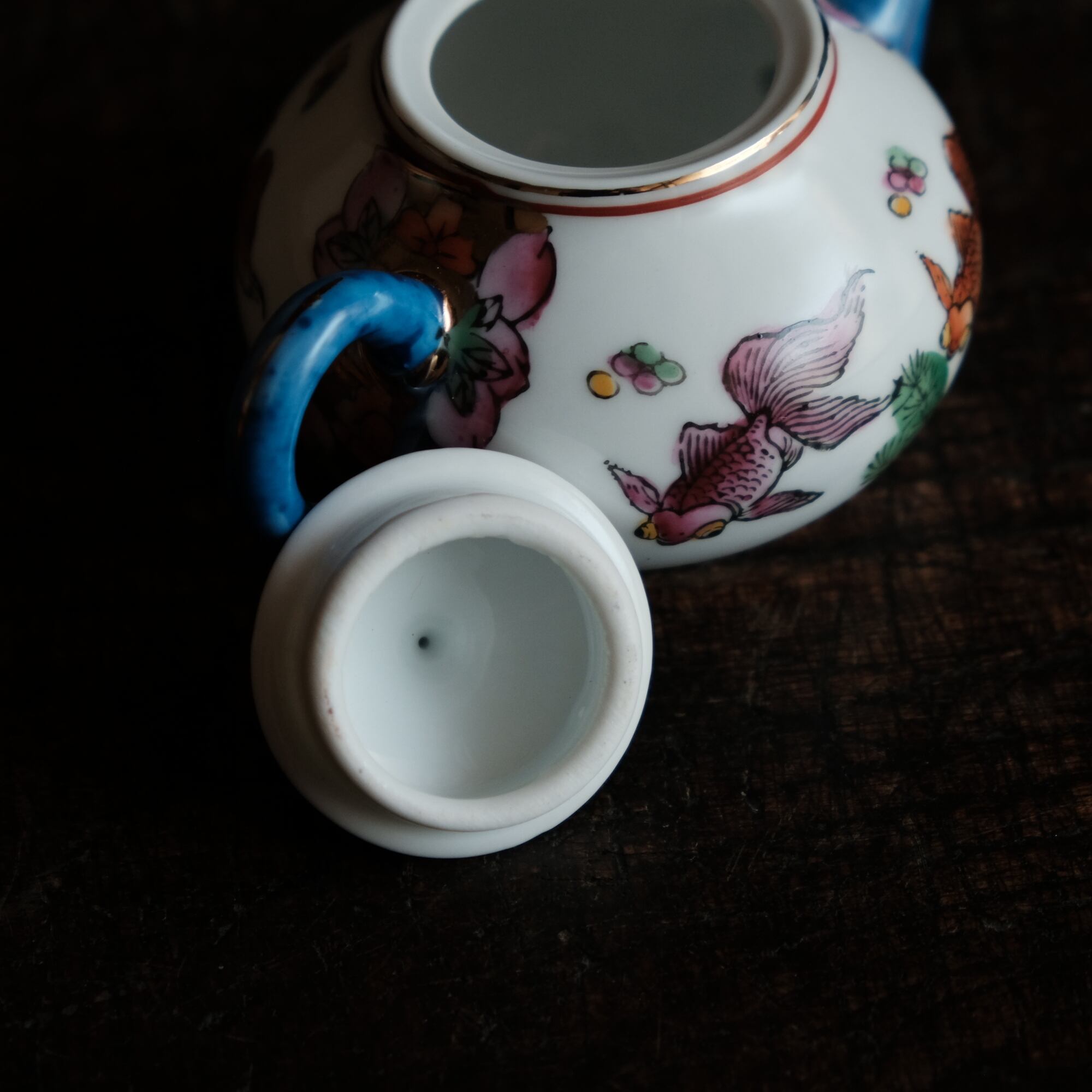 桃と金魚◆水草と泡。中国製造 色絵金彩小ぶり急須 煎茶茶器 インテリアオブジェ シノワズリ チャイナレトロ
