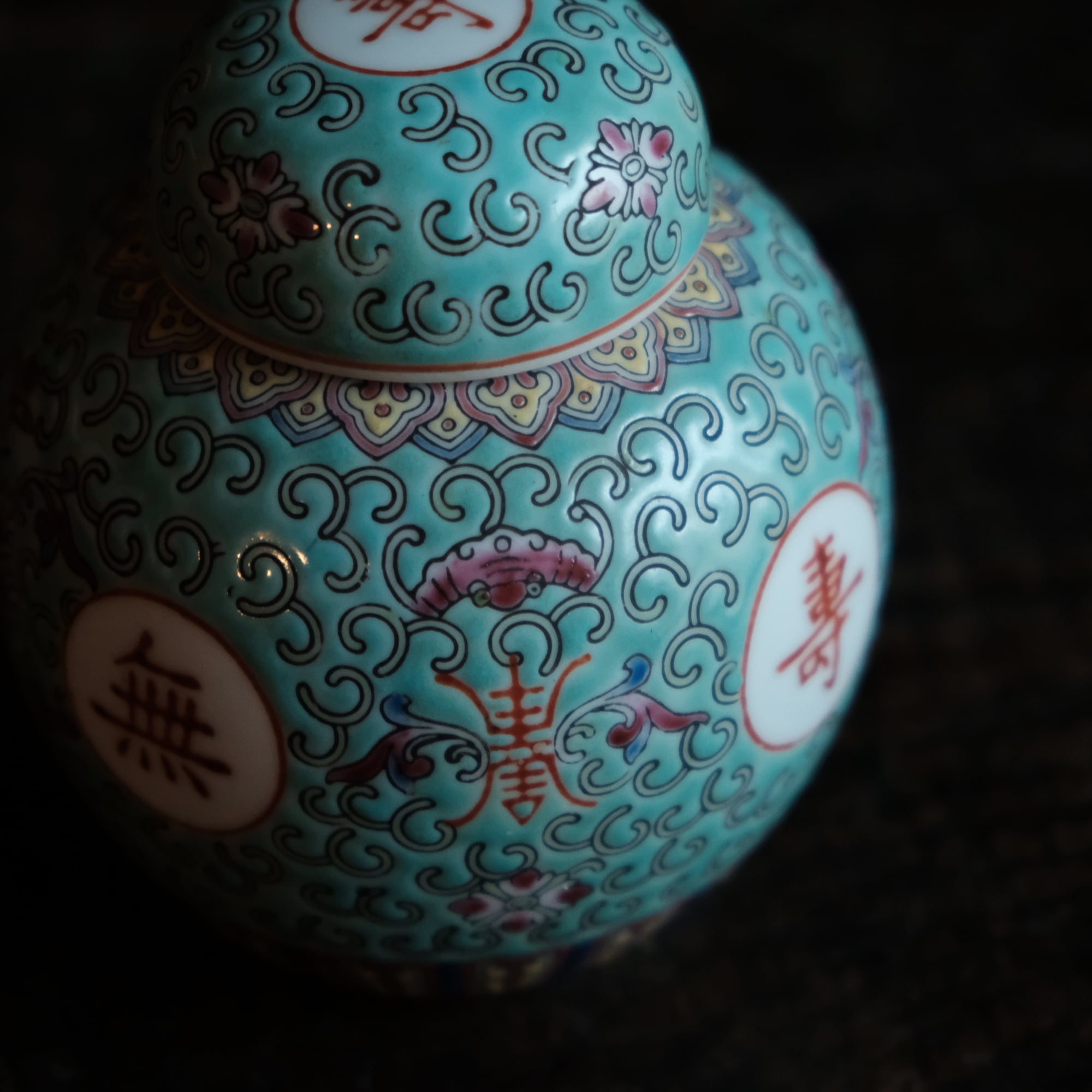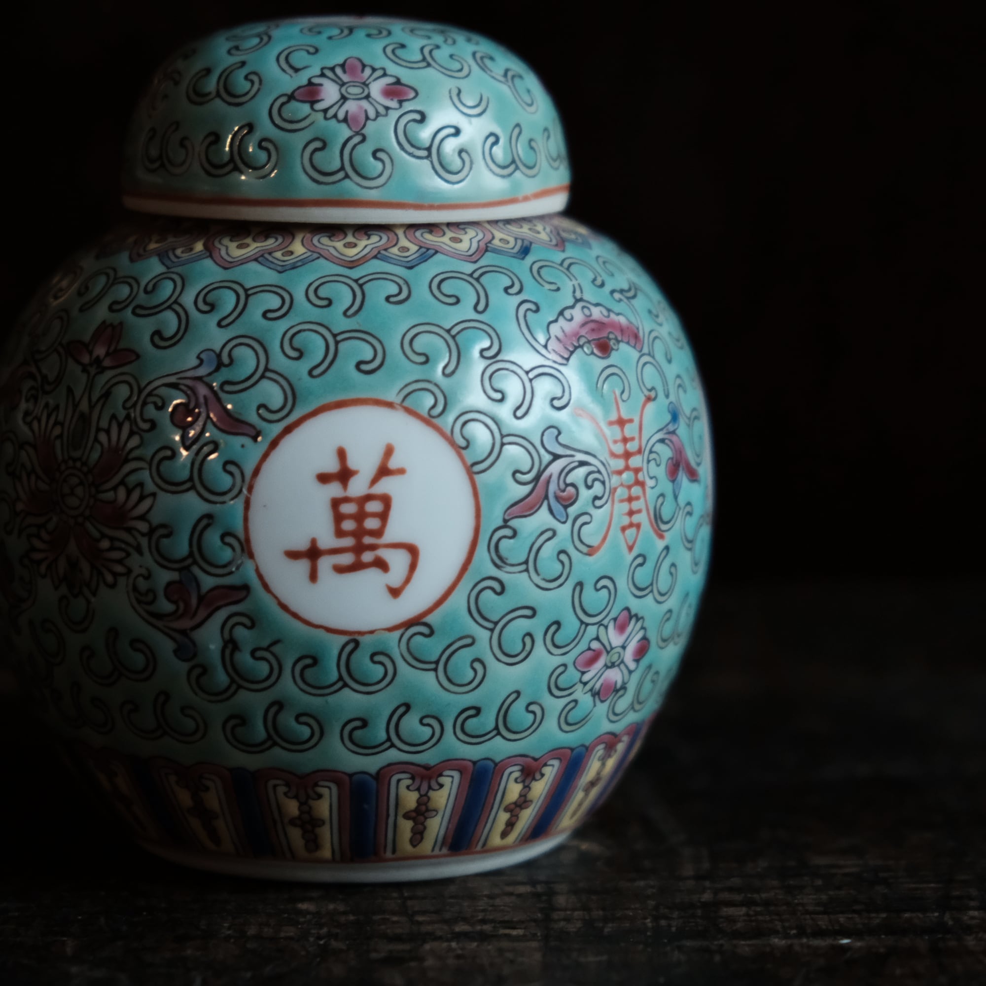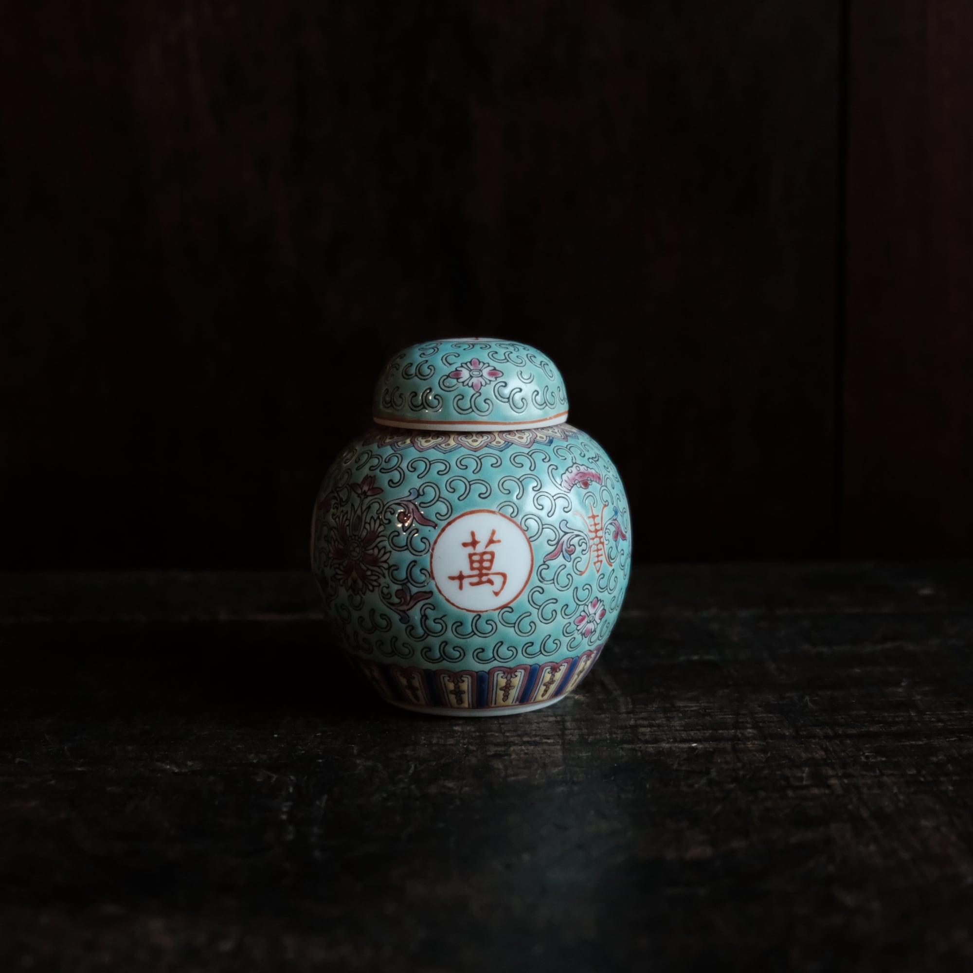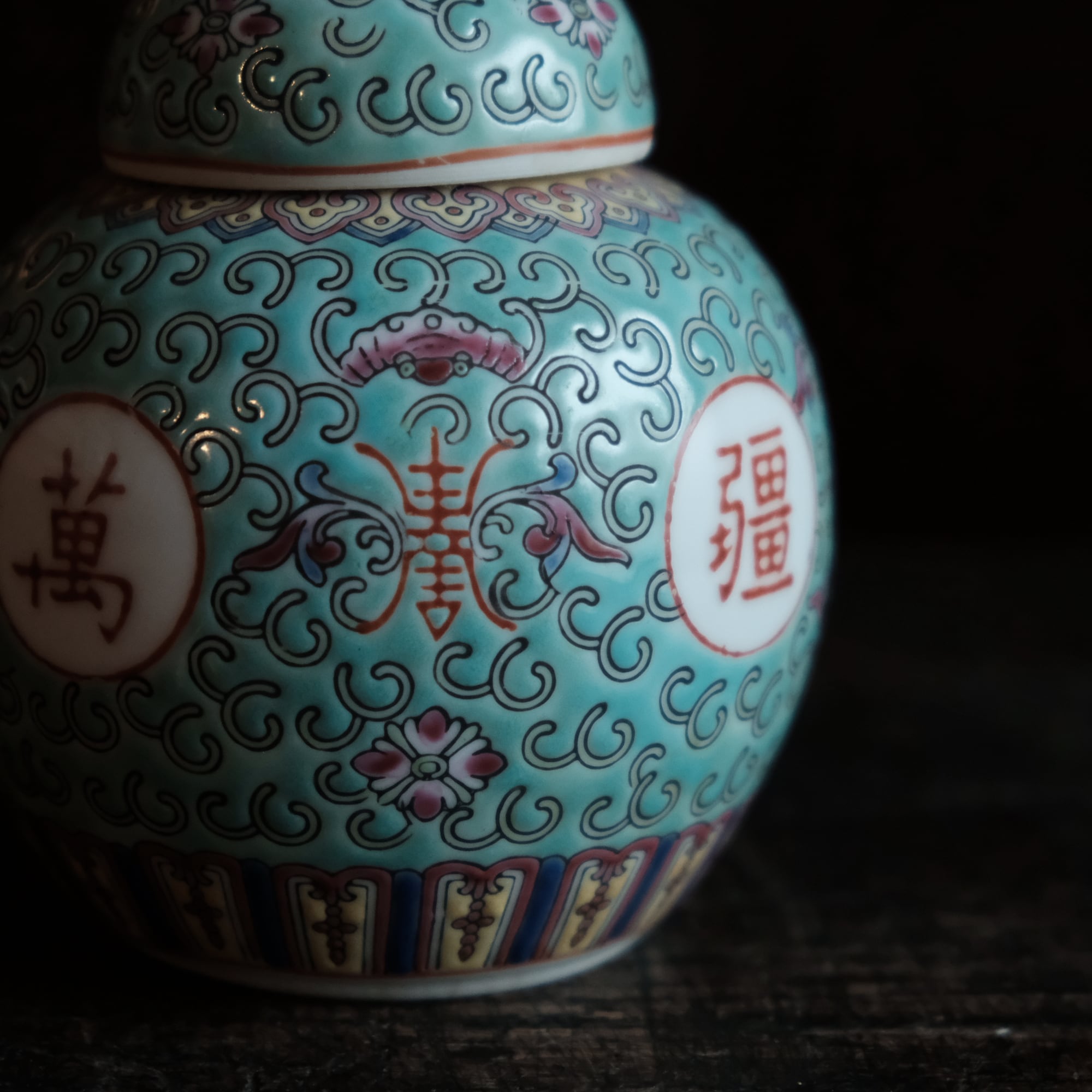 花唐草と漢字と蝙蝠◆萬寿無疆。中国景徳鎮 色絵蓋付壺 茶壷 ビビットグリーン ポップ チャイナレトロ