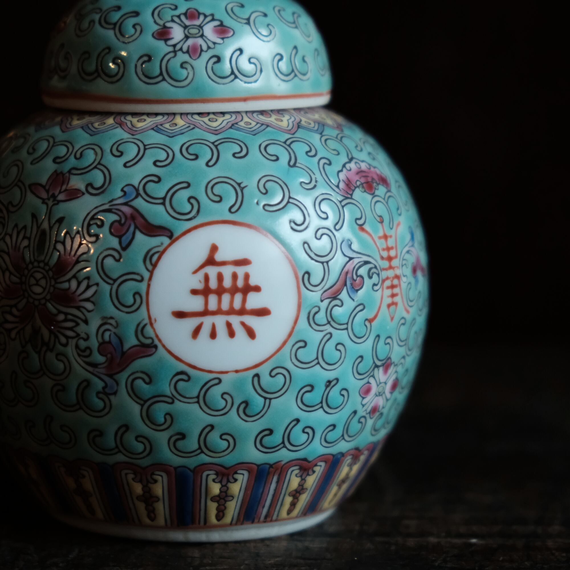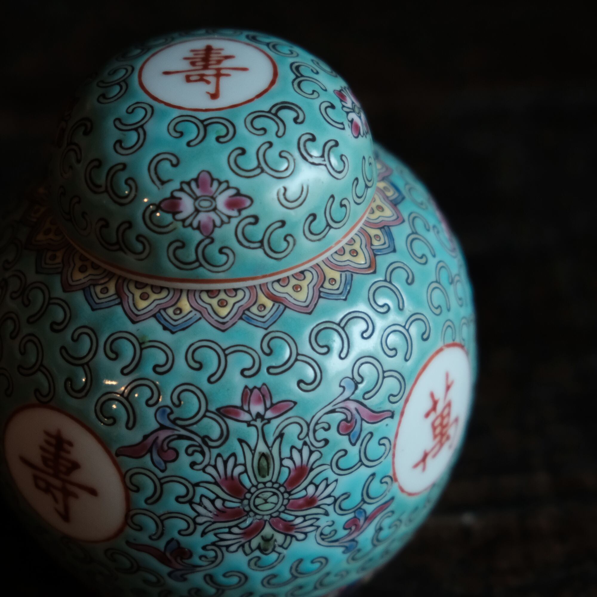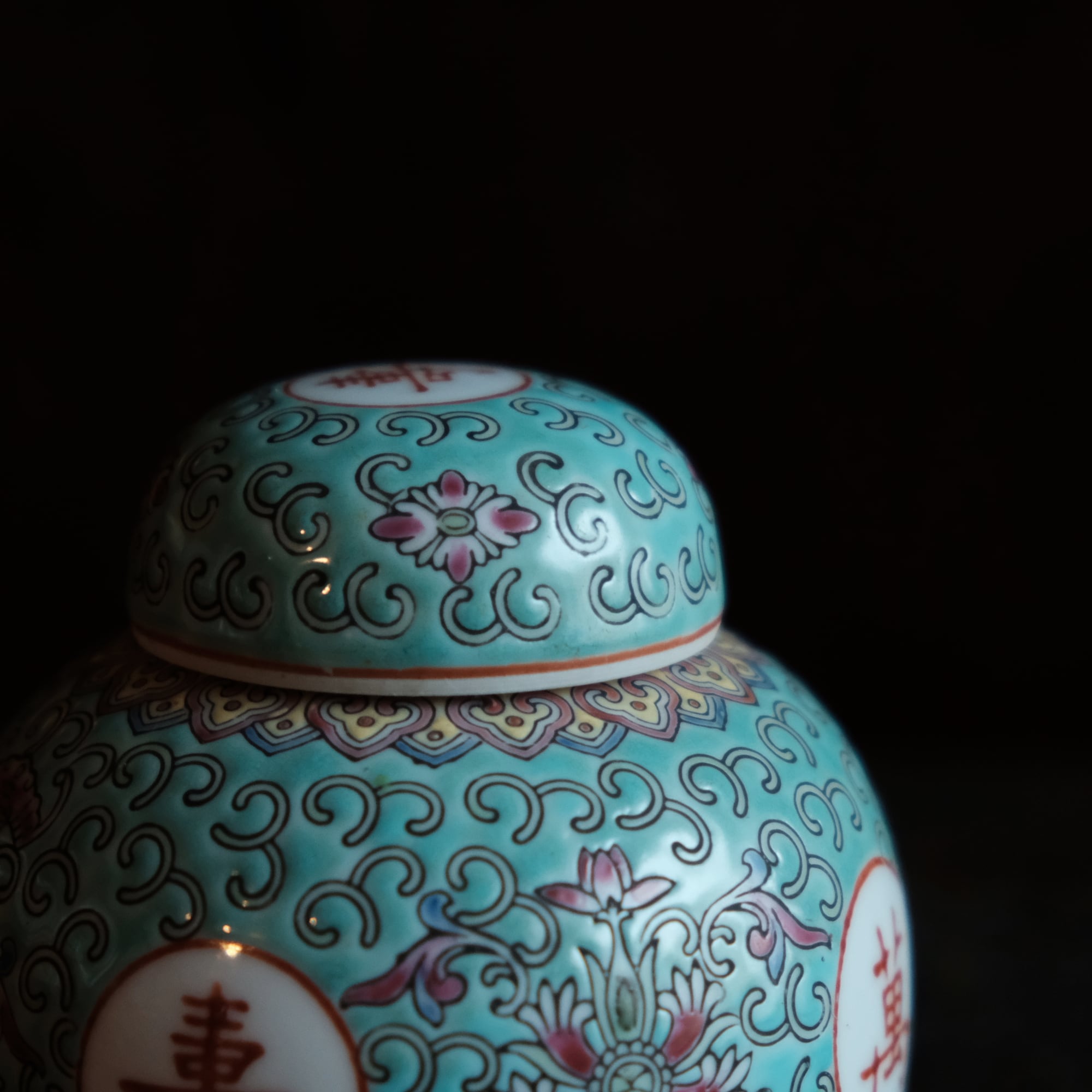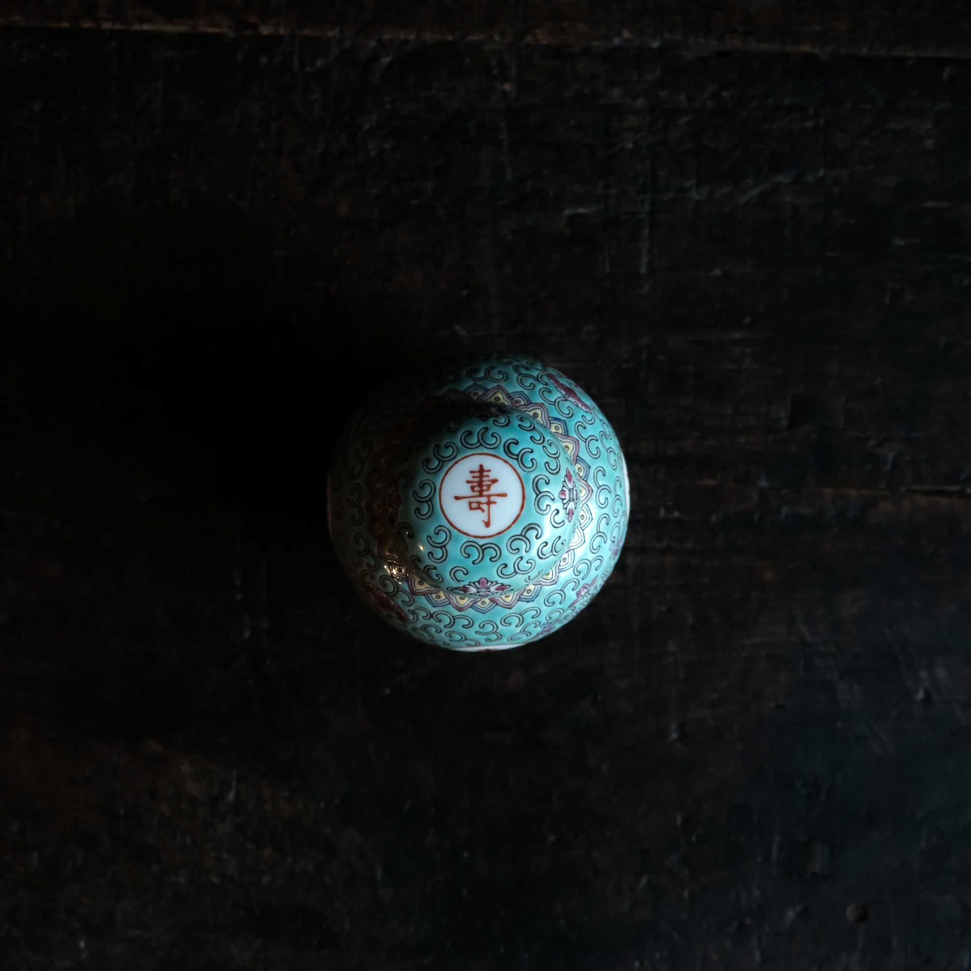花唐草と漢字と蝙蝠◆萬寿無疆。中国景徳鎮 色絵蓋付壺 茶壷 ビビットグリーン ポップ チャイナレトロ