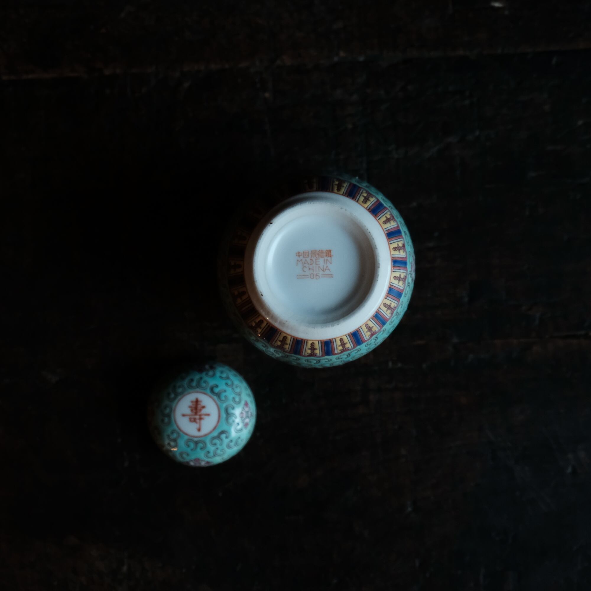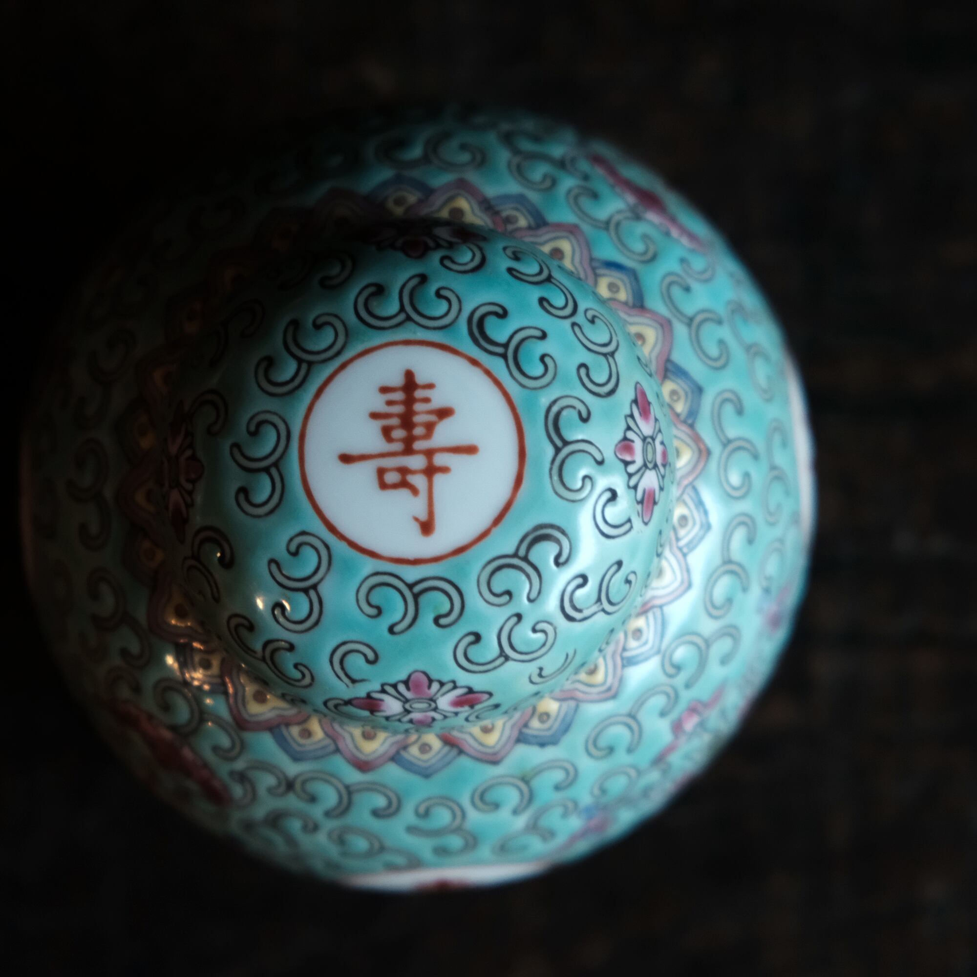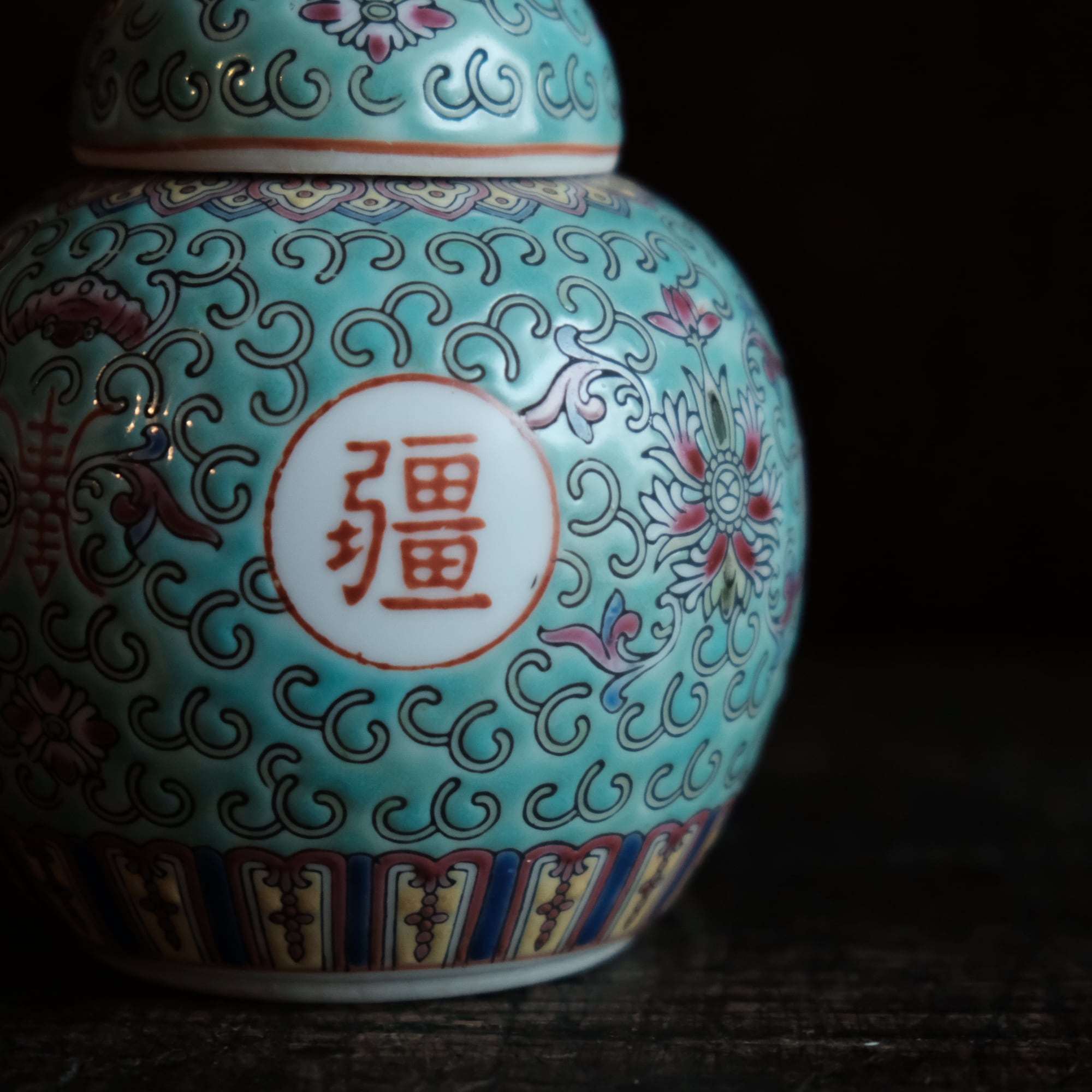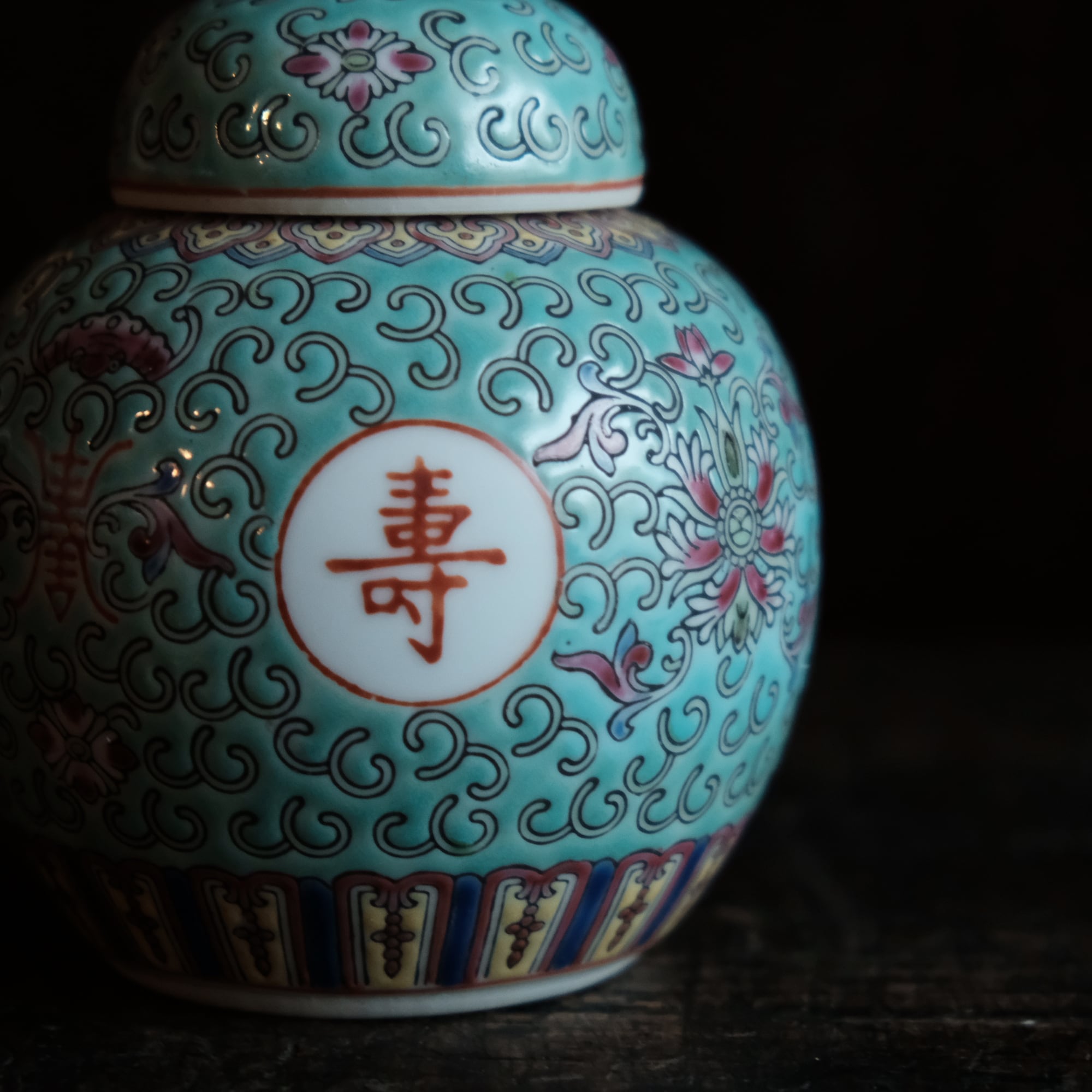 花唐草と漢字と蝙蝠◆萬寿無疆。中国景徳鎮 色絵蓋付壺 茶壷 ビビットグリーン ポップ チャイナレトロ