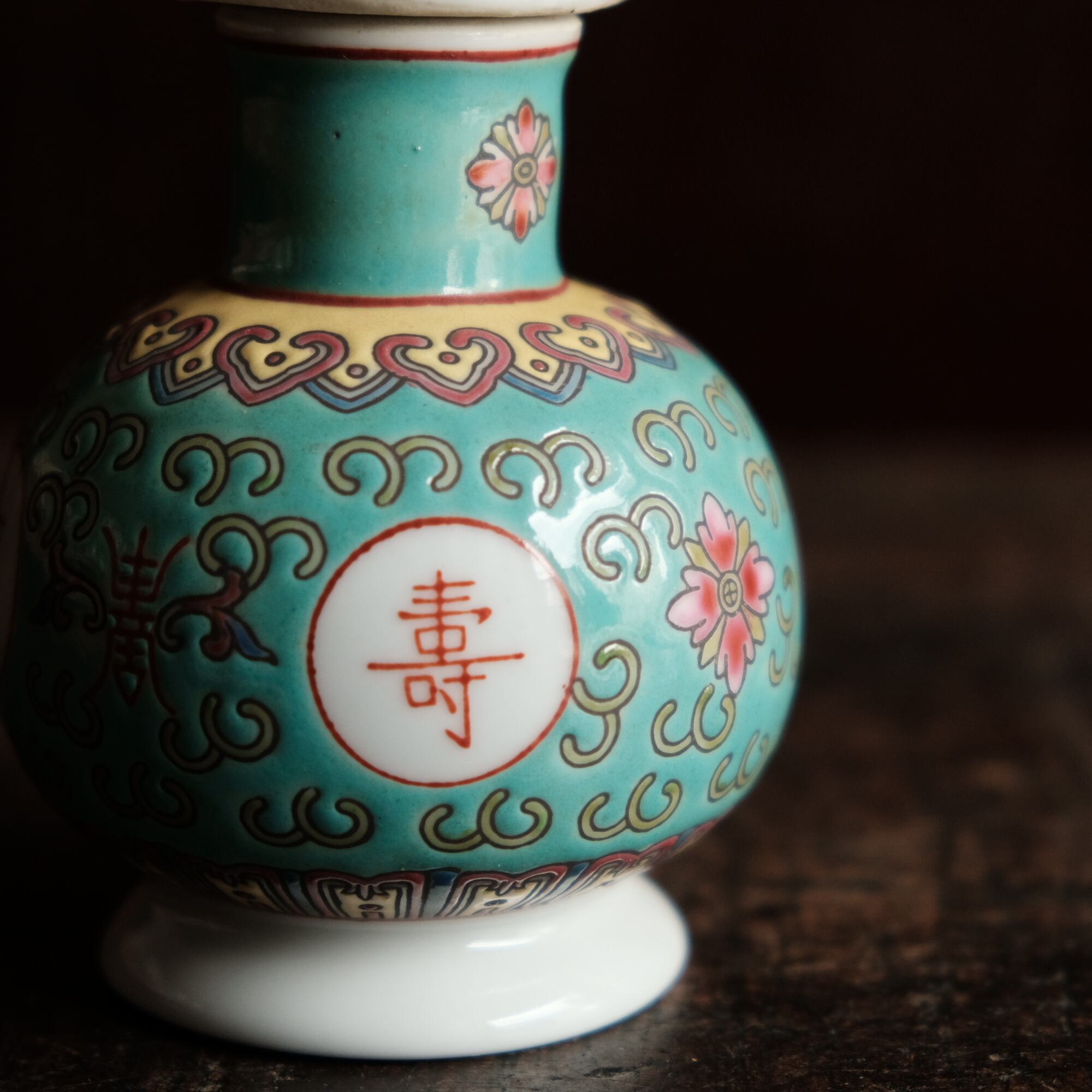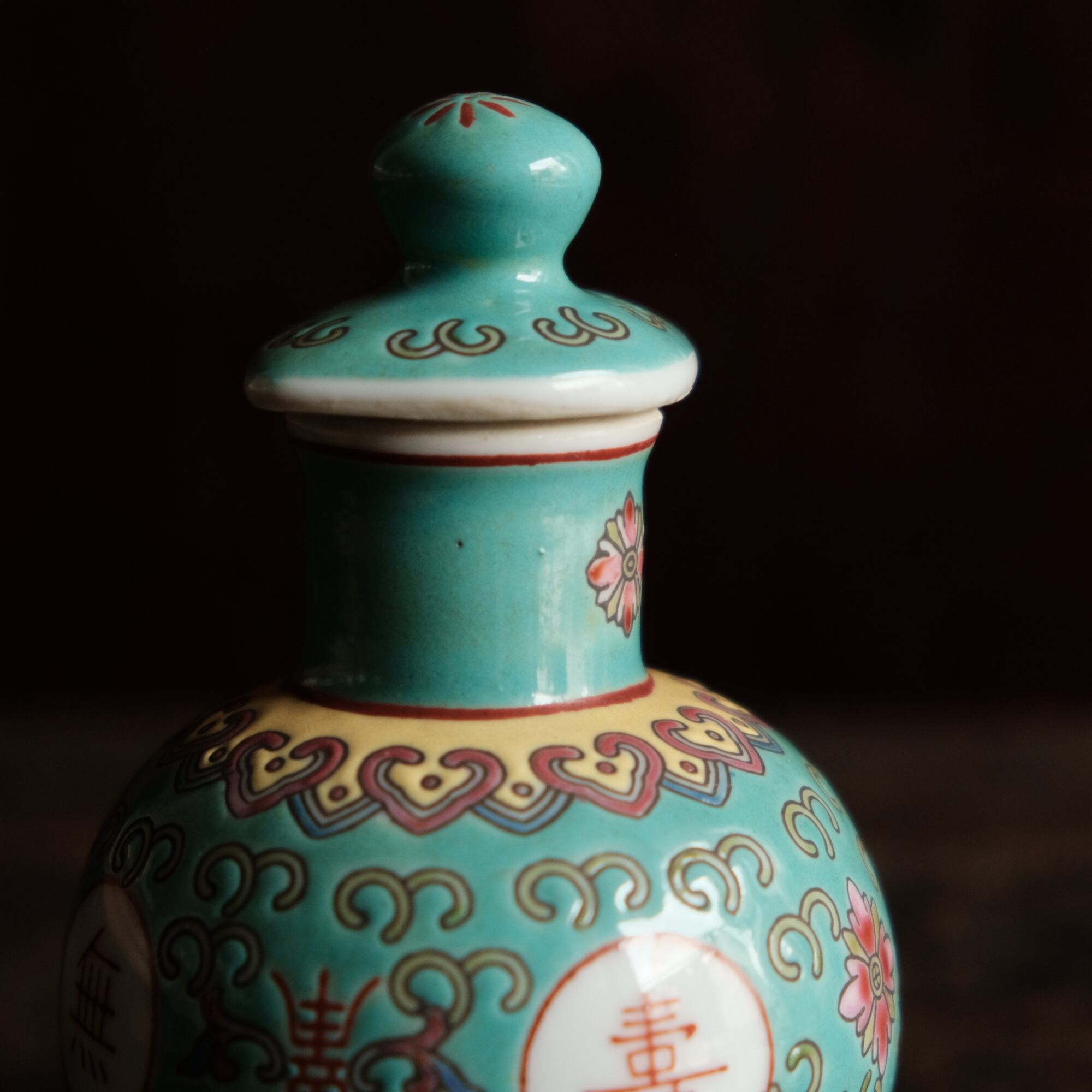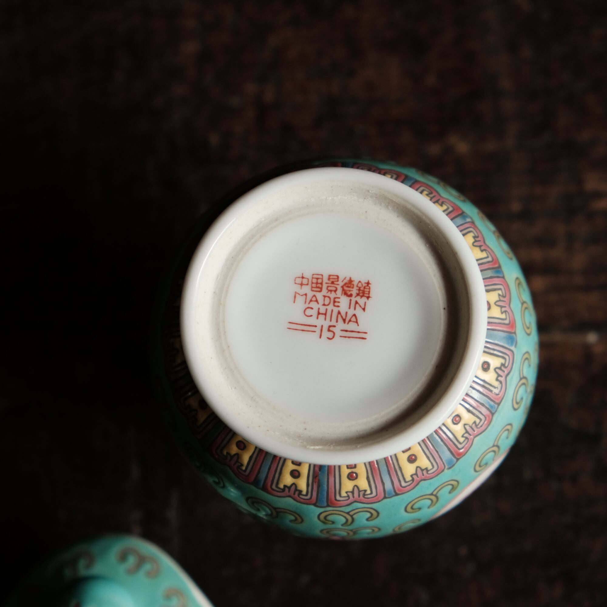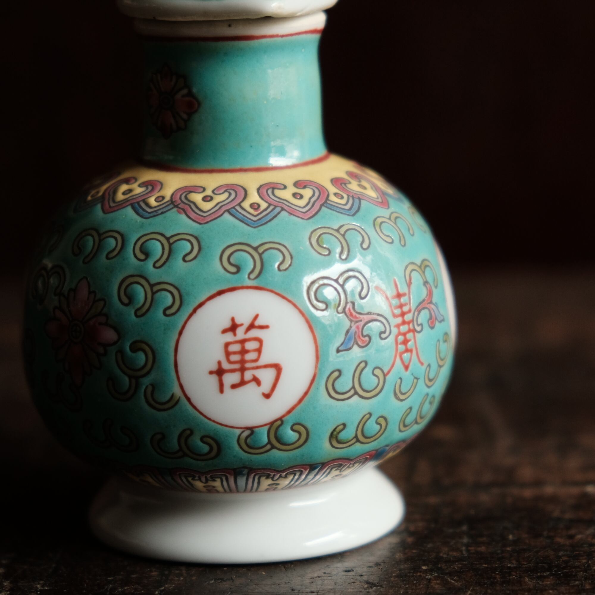 花唐草と漢字◆萬寿無疆。中国景徳鎮 色絵醤油差し ビビットグリーン ポップ チャイナレトロ b2