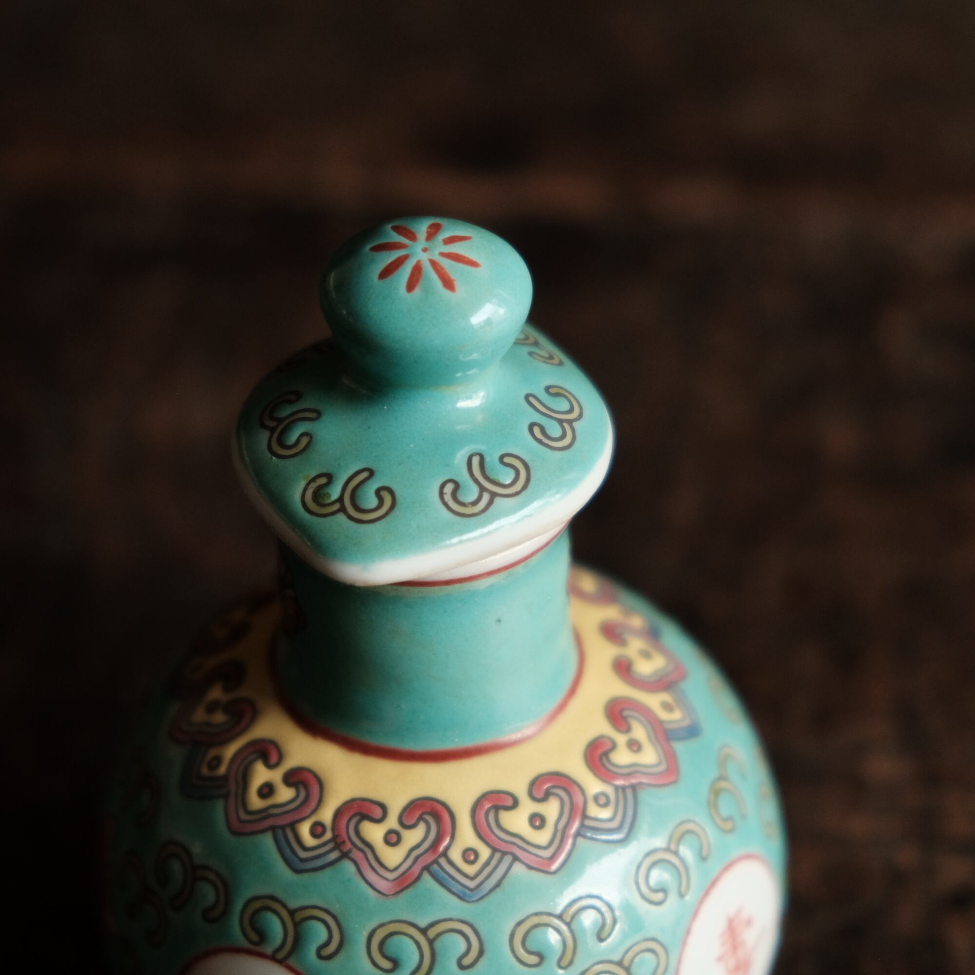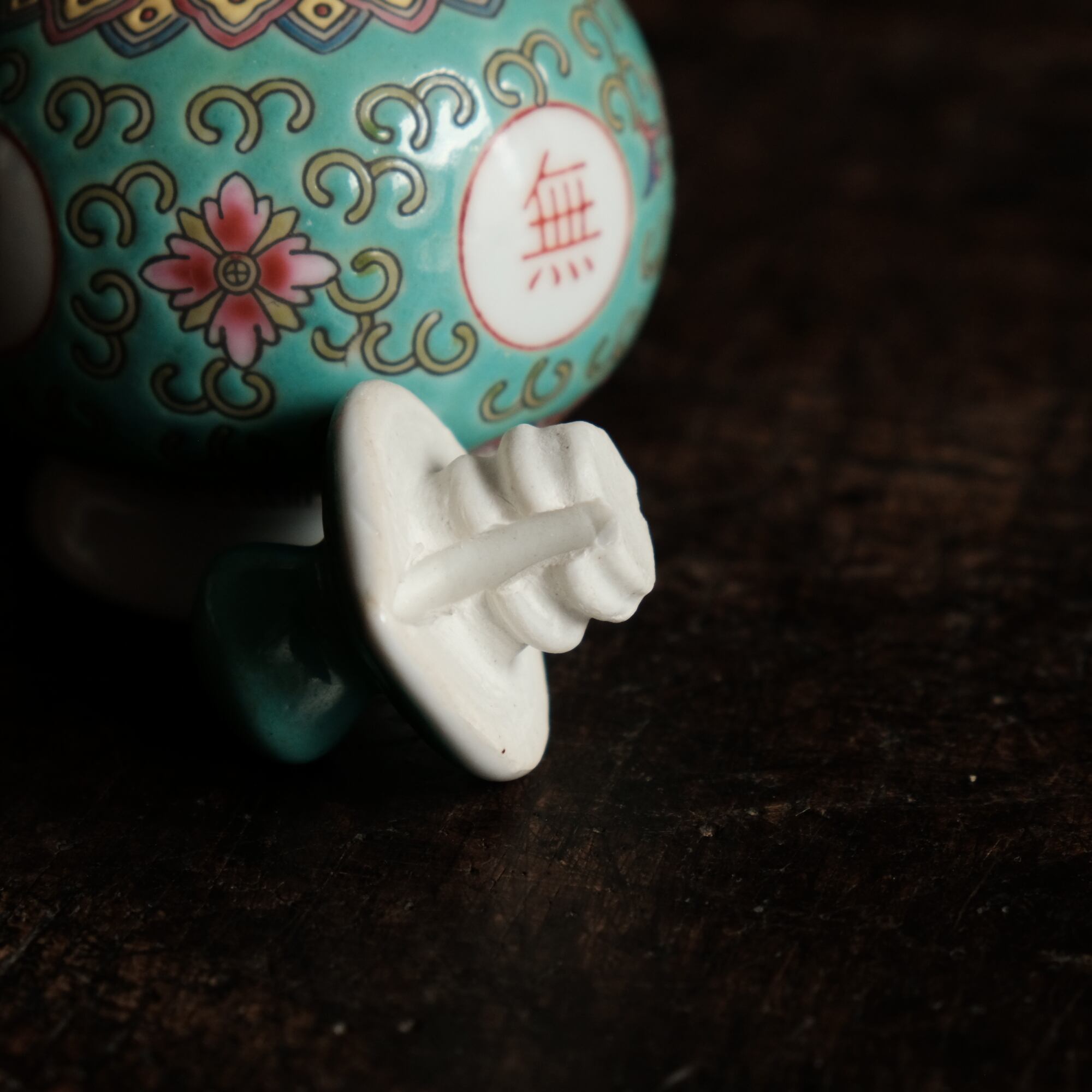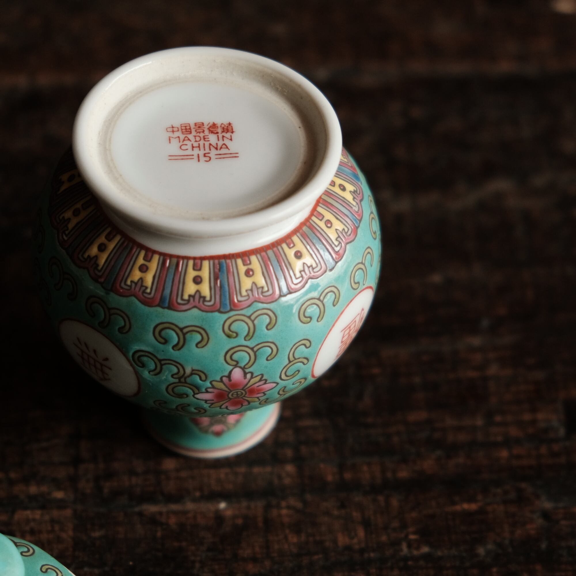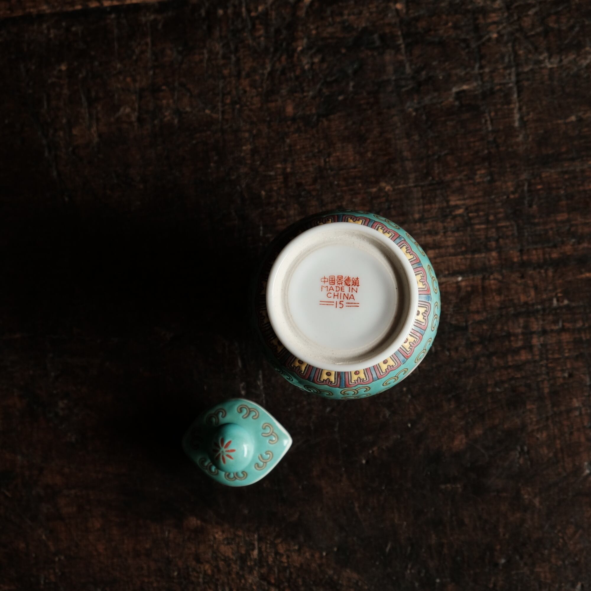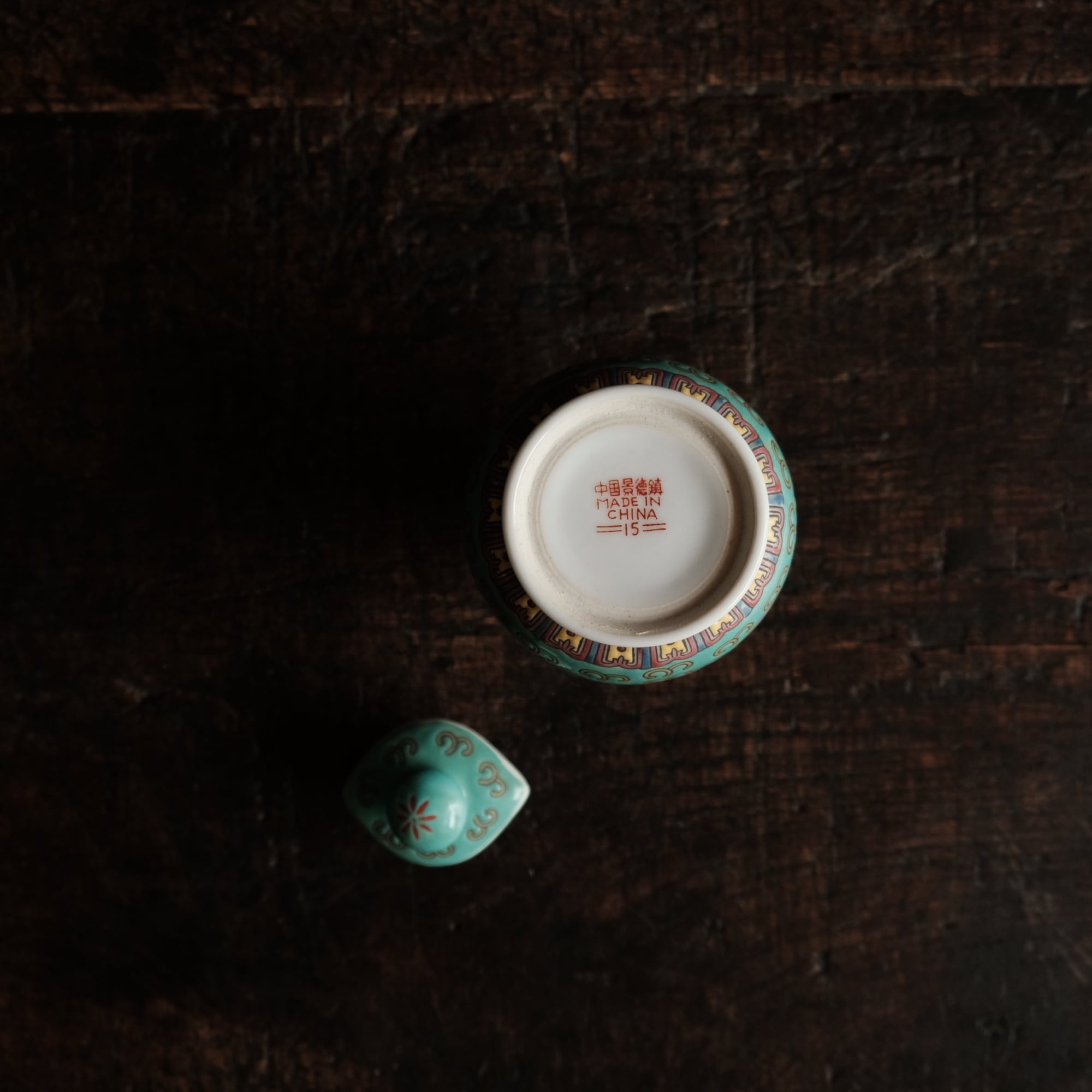 花唐草と漢字◆萬寿無疆。中国景徳鎮 色絵醤油差し ビビットグリーン ポップ チャイナレトロ b2