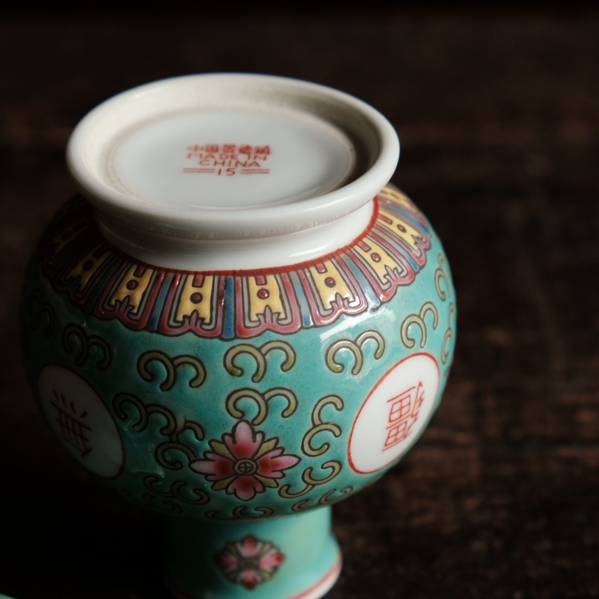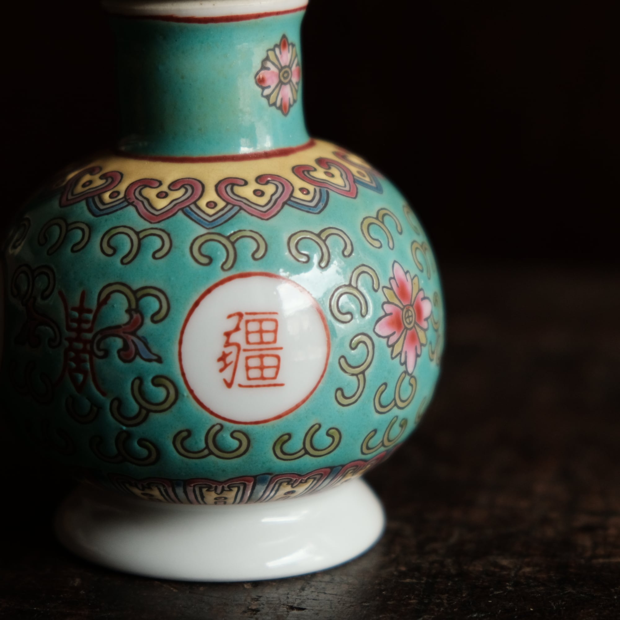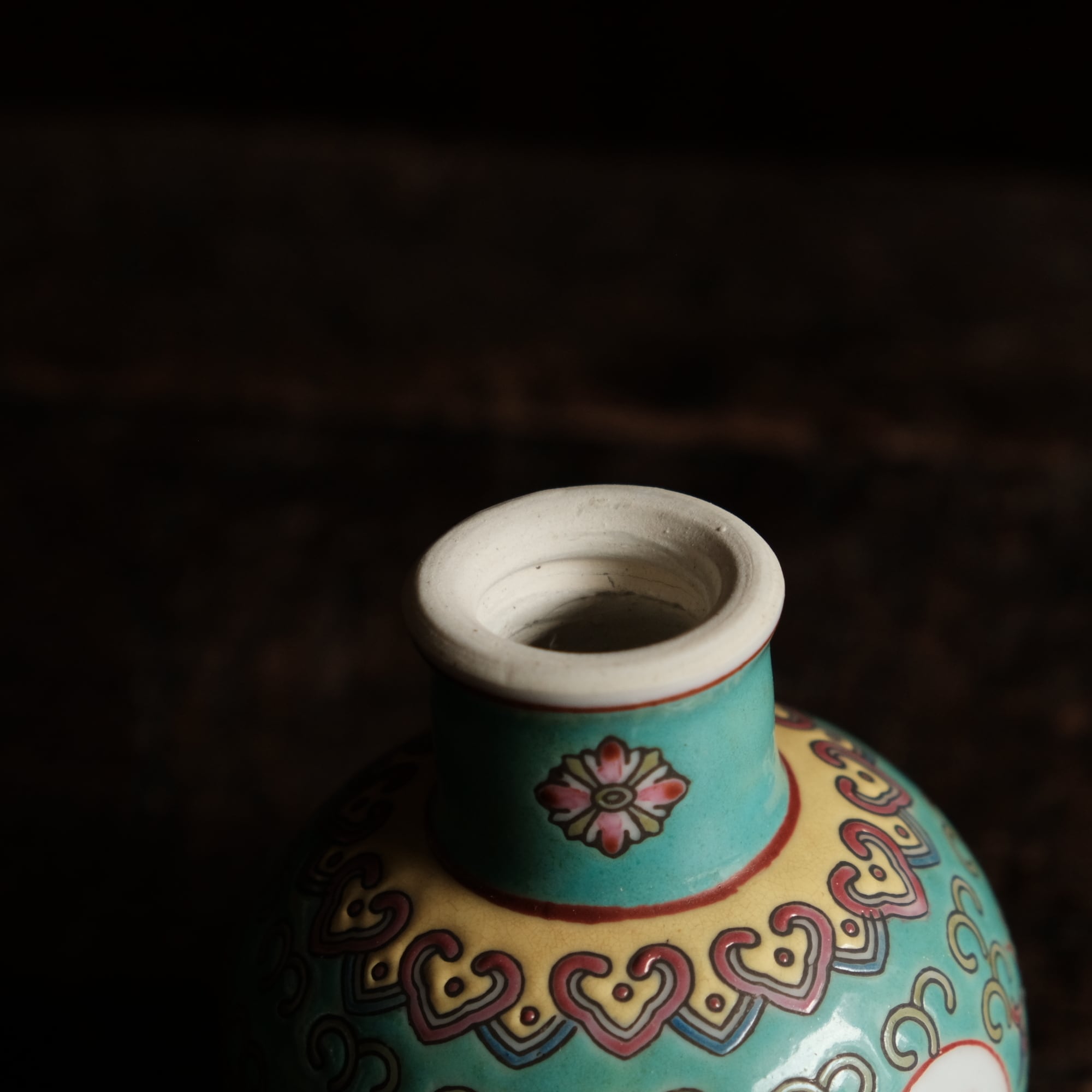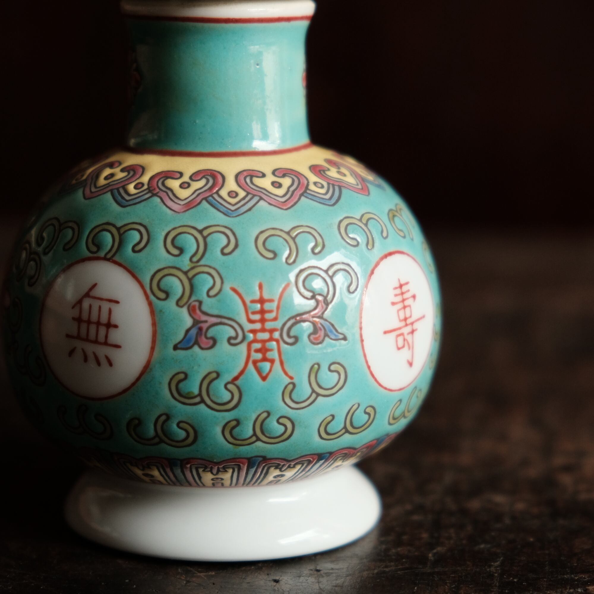 花唐草と漢字◆萬寿無疆。中国景徳鎮 色絵醤油差し ビビットグリーン ポップ チャイナレトロ b2