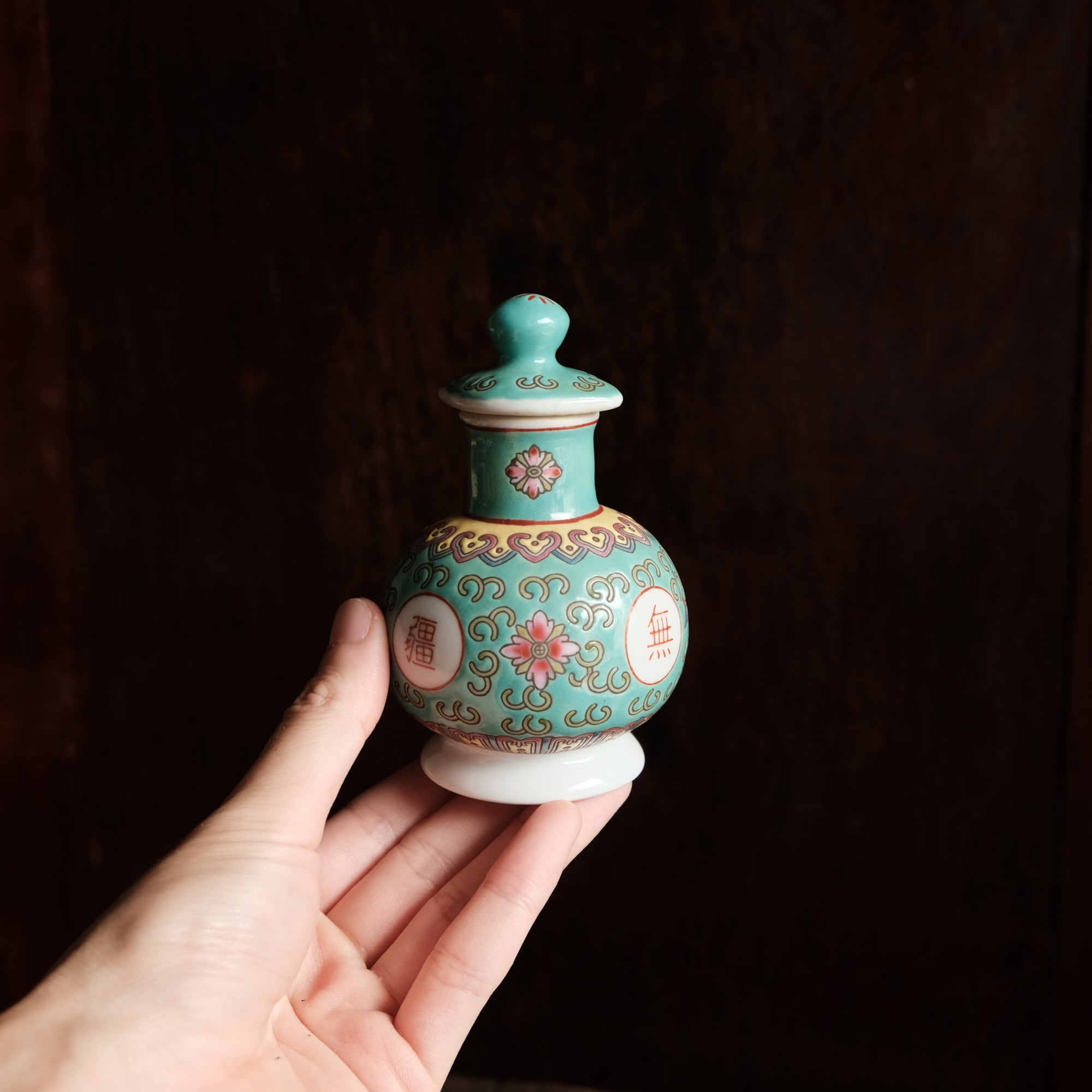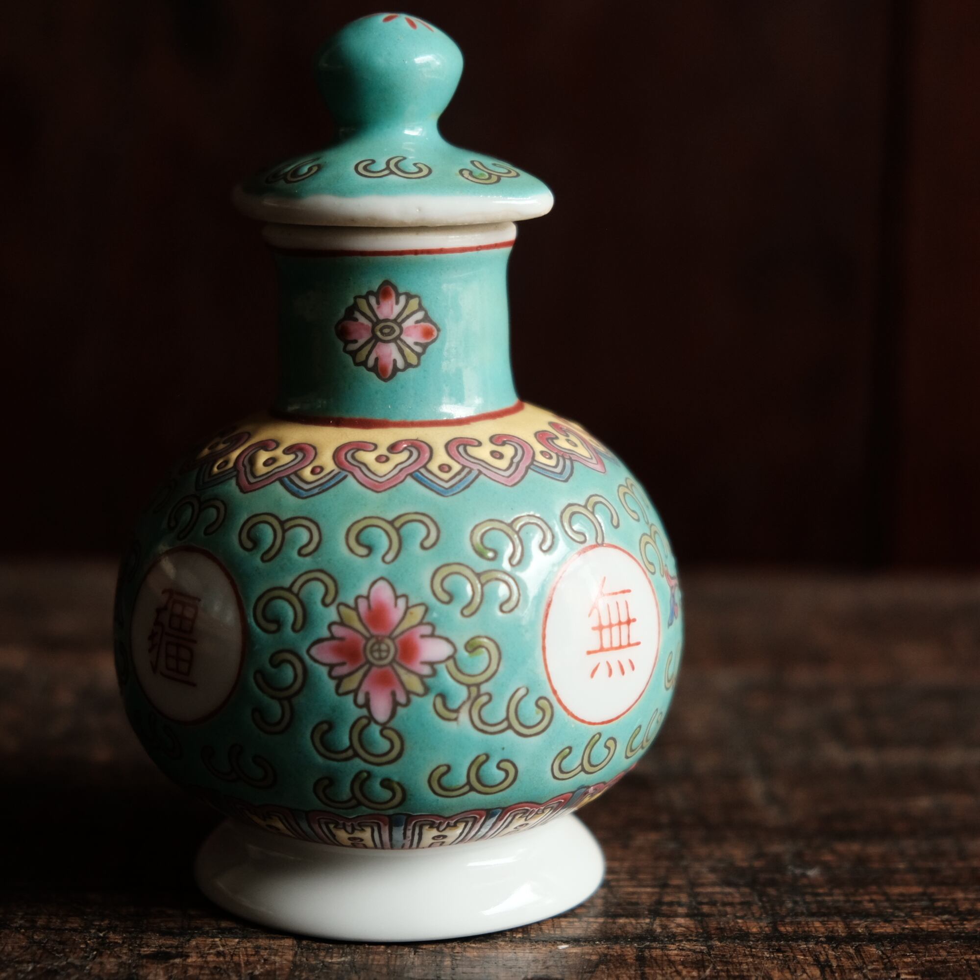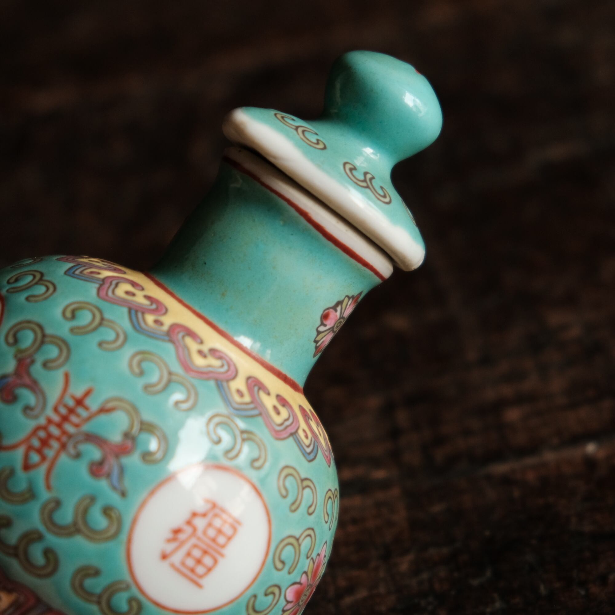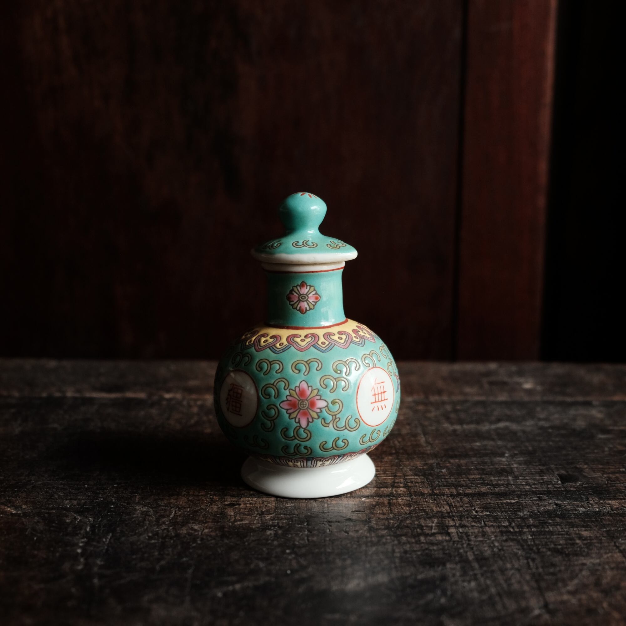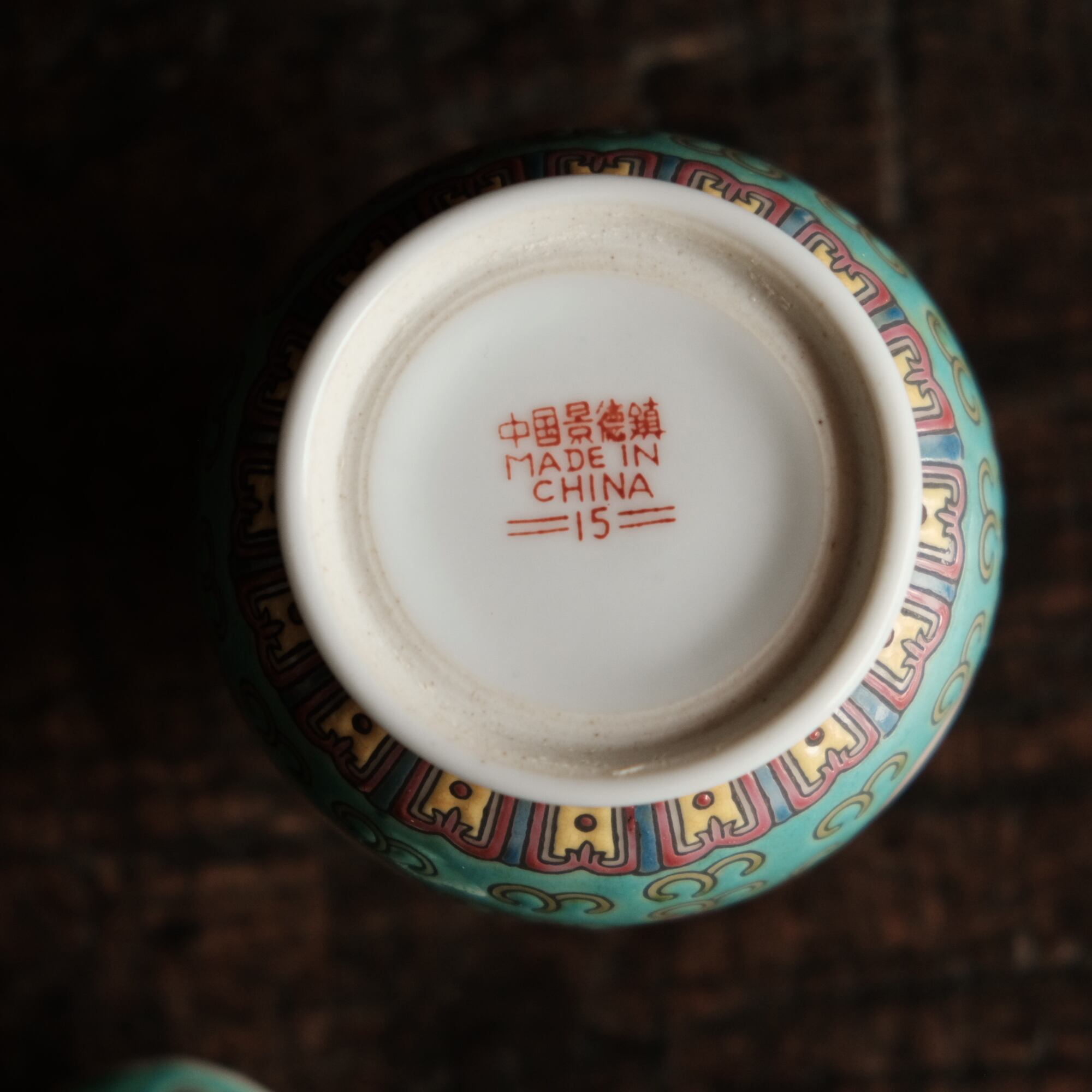 花唐草と漢字◆萬寿無疆。中国景徳鎮 色絵醤油差し ビビットグリーン ポップ チャイナレトロ b2