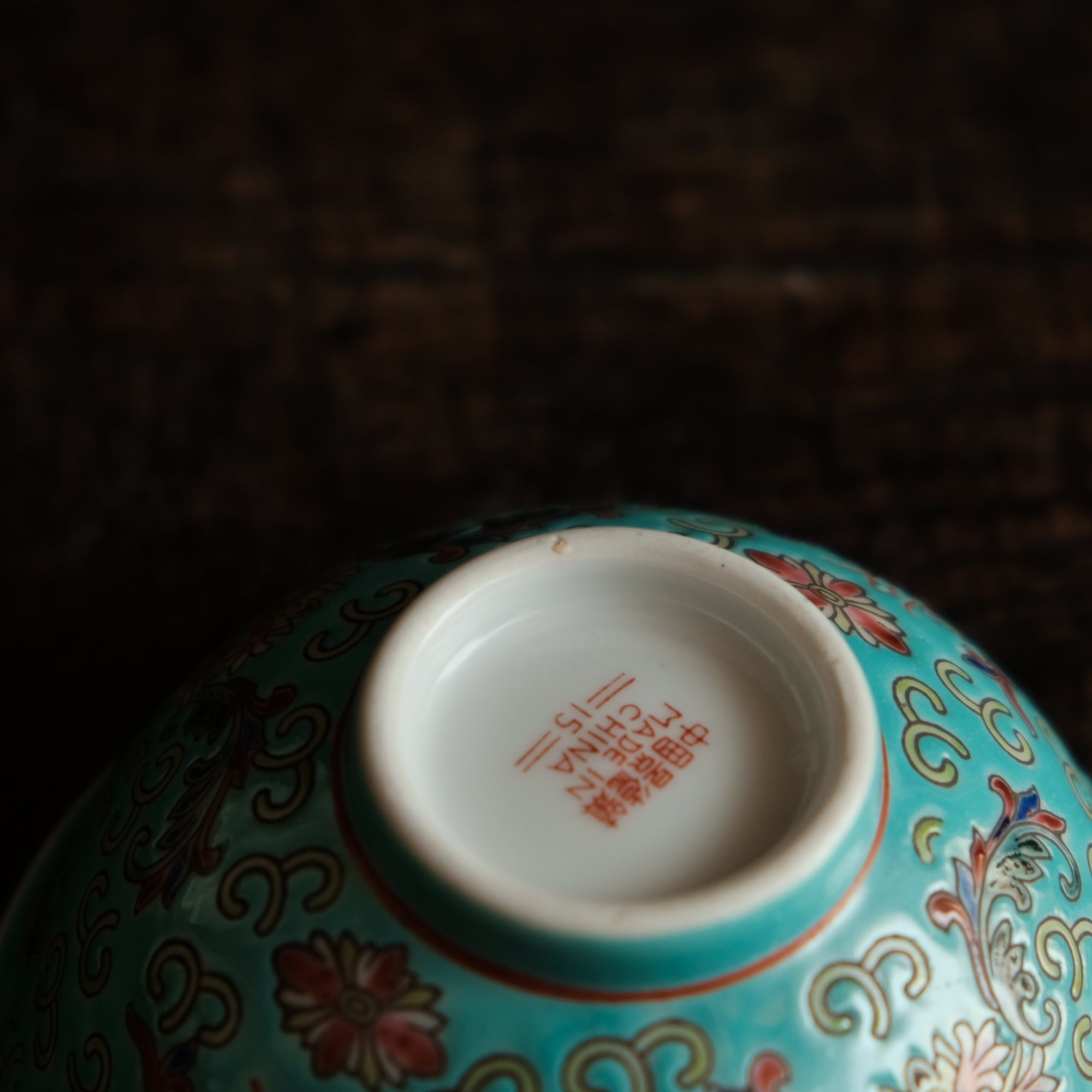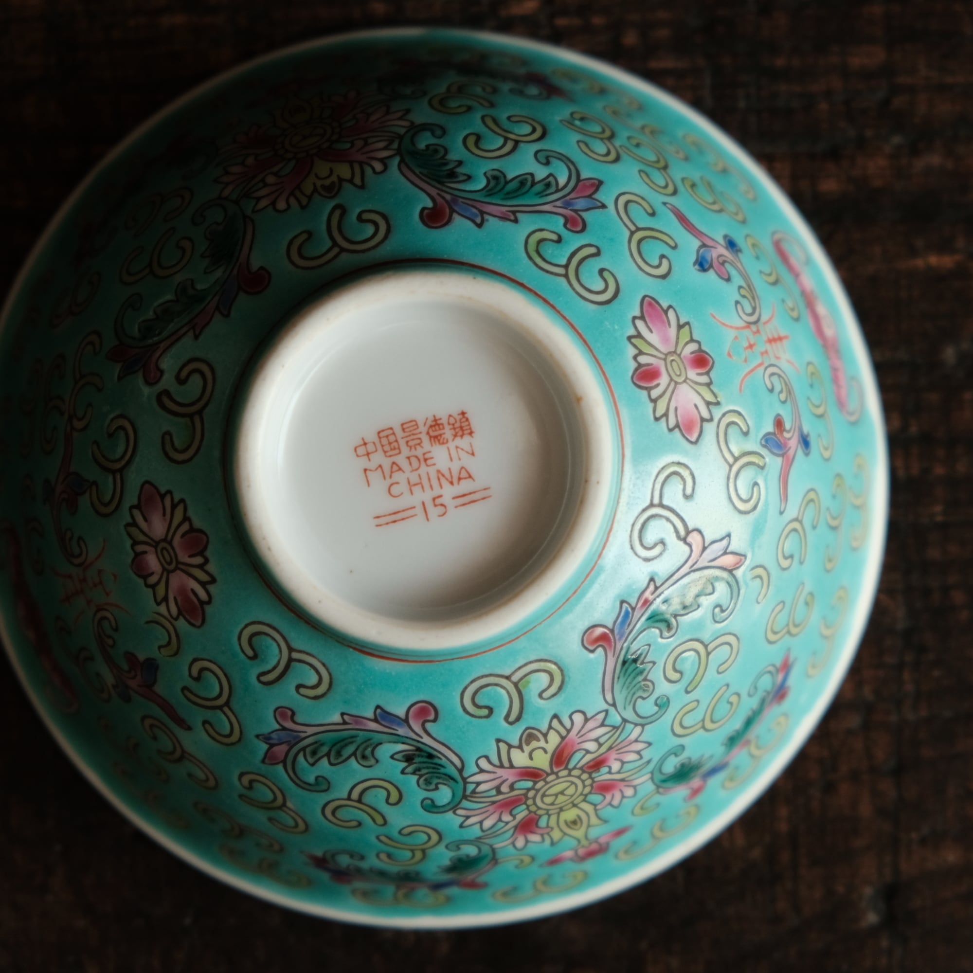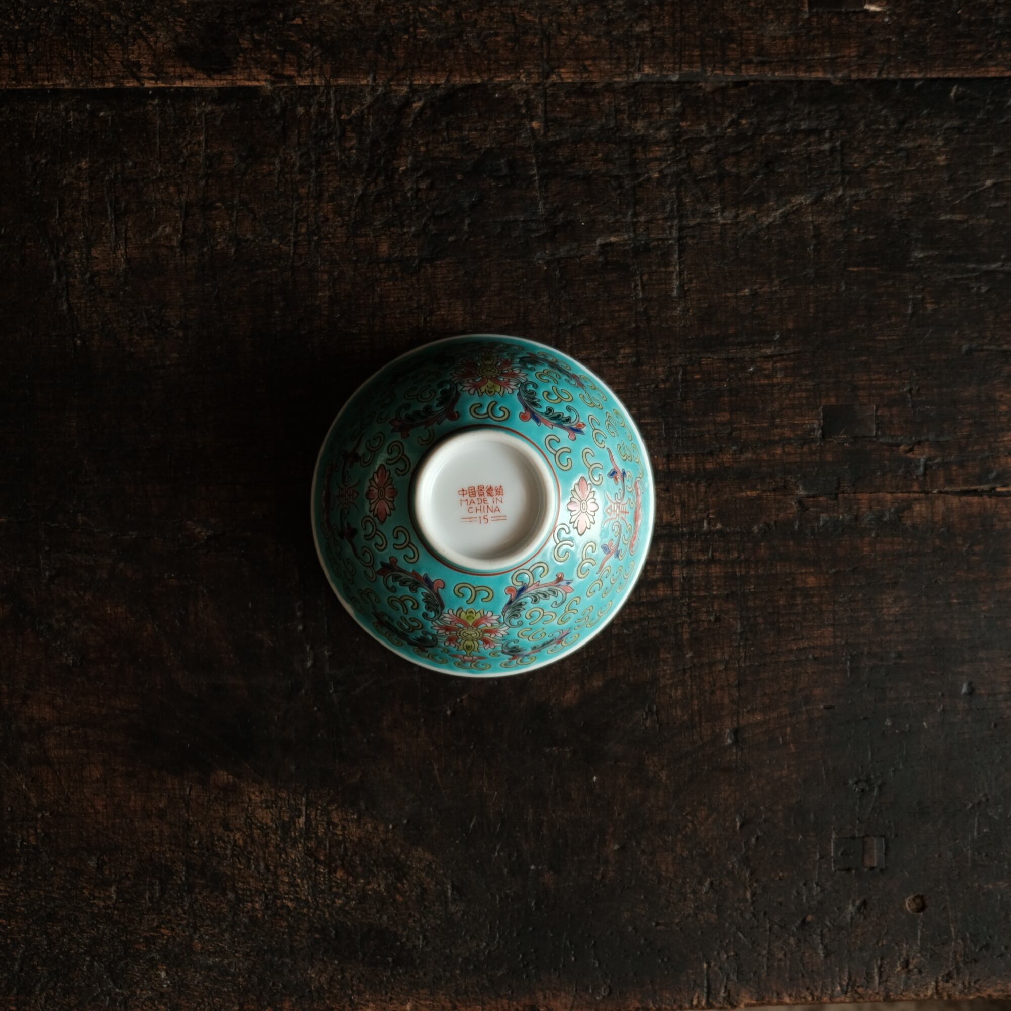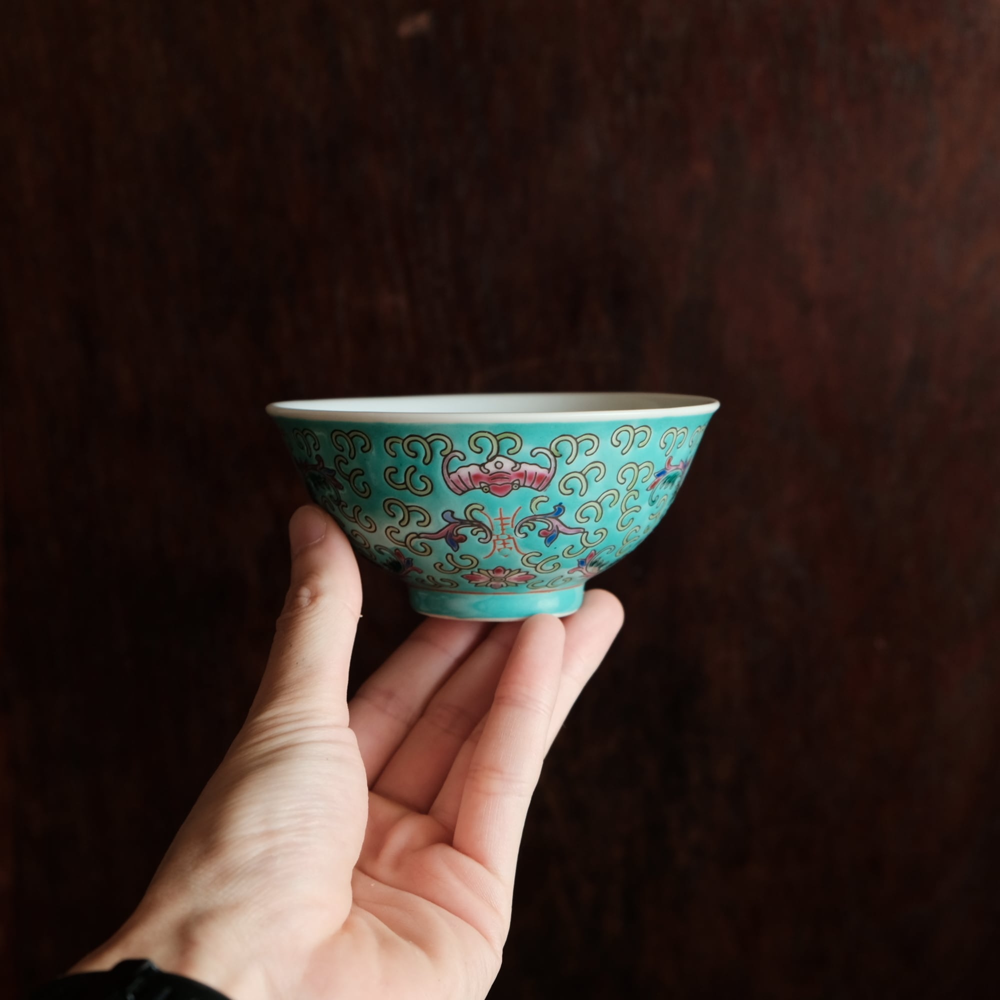 ビビットカラーで可愛い◆花と漢字と蝙蝠。中国景徳鎮 色絵小碗・小鉢 花唐草 蝙蝠 チャイナレトロ グリーン