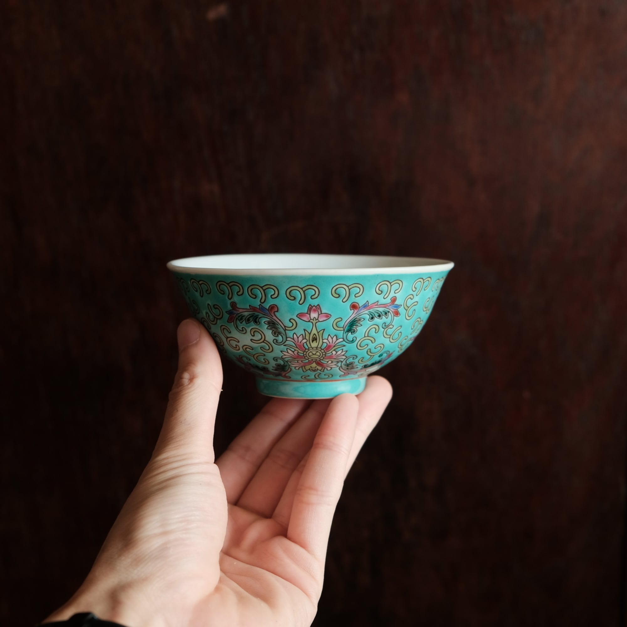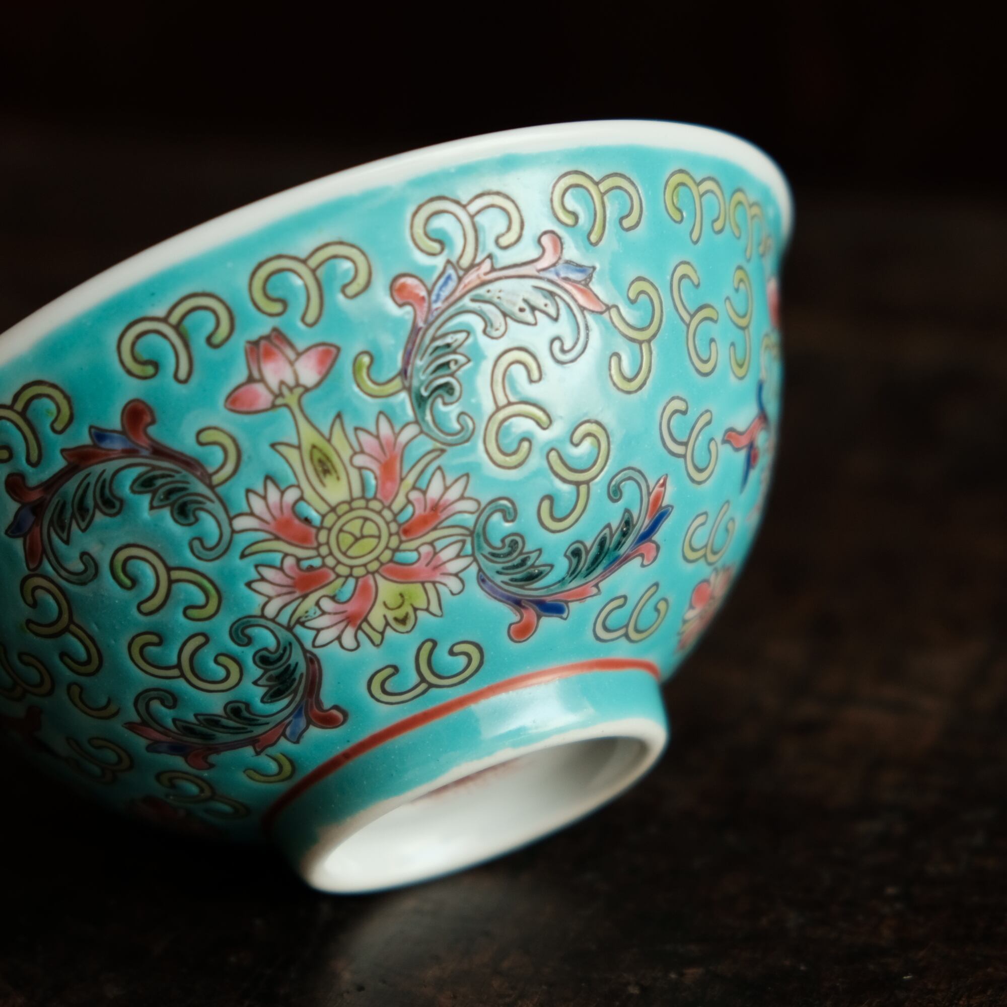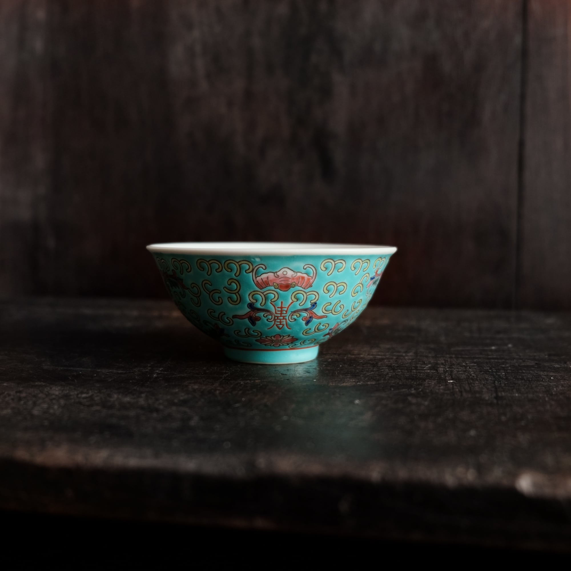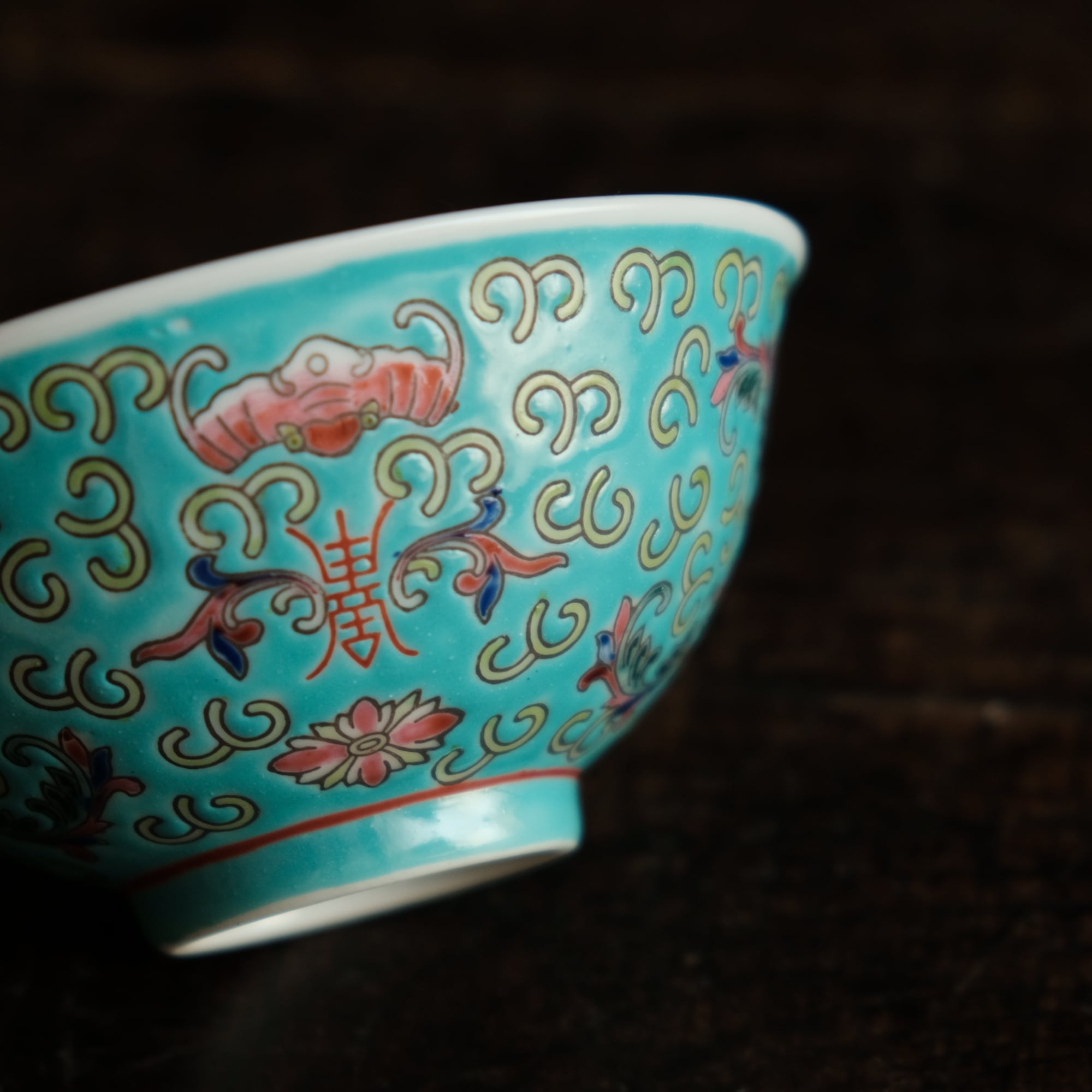 ビビットカラーで可愛い◆花と漢字と蝙蝠。中国景徳鎮 色絵小碗・小鉢 花唐草 蝙蝠 チャイナレトロ グリーン