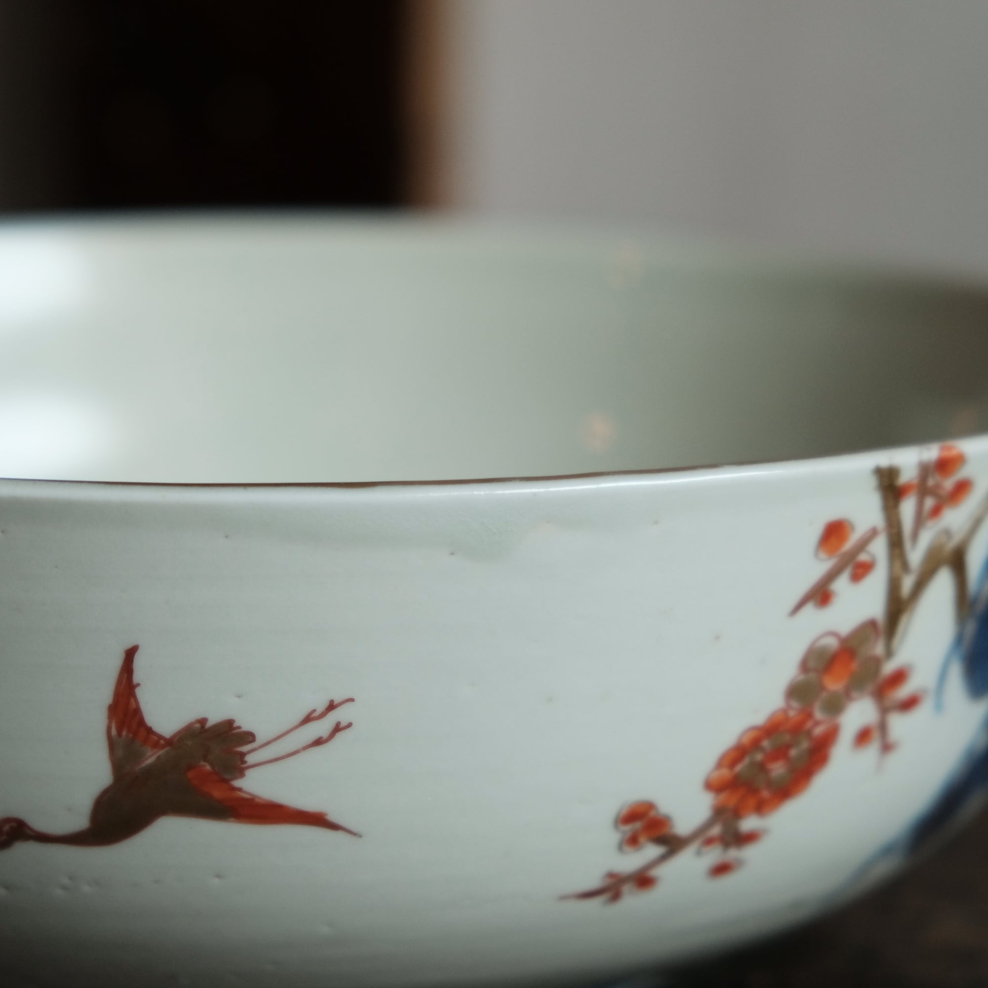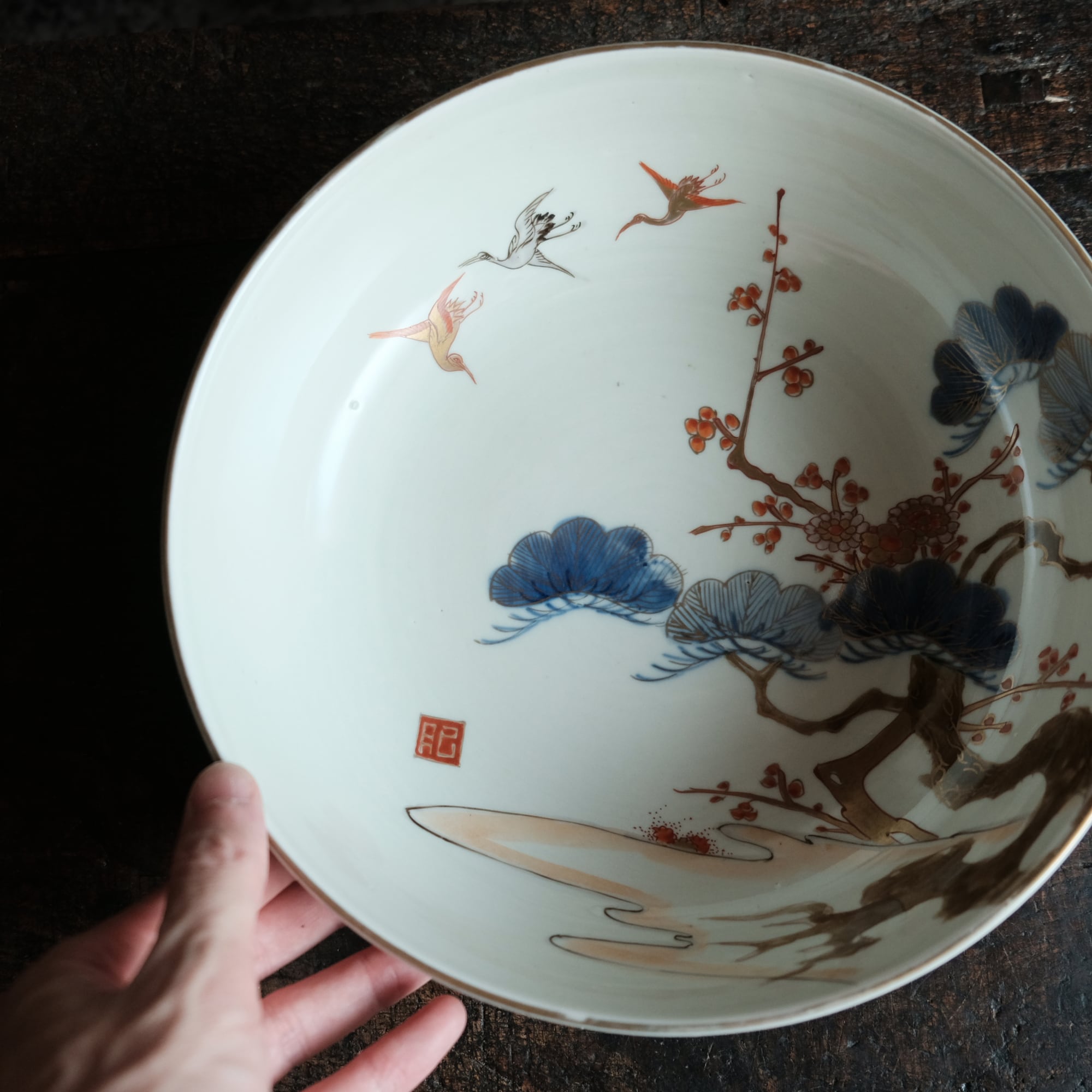 余白が素敵◆鶴と松。伊万里 染錦金彩八寸大鉢 骨董/antiques アンティーク 古民家