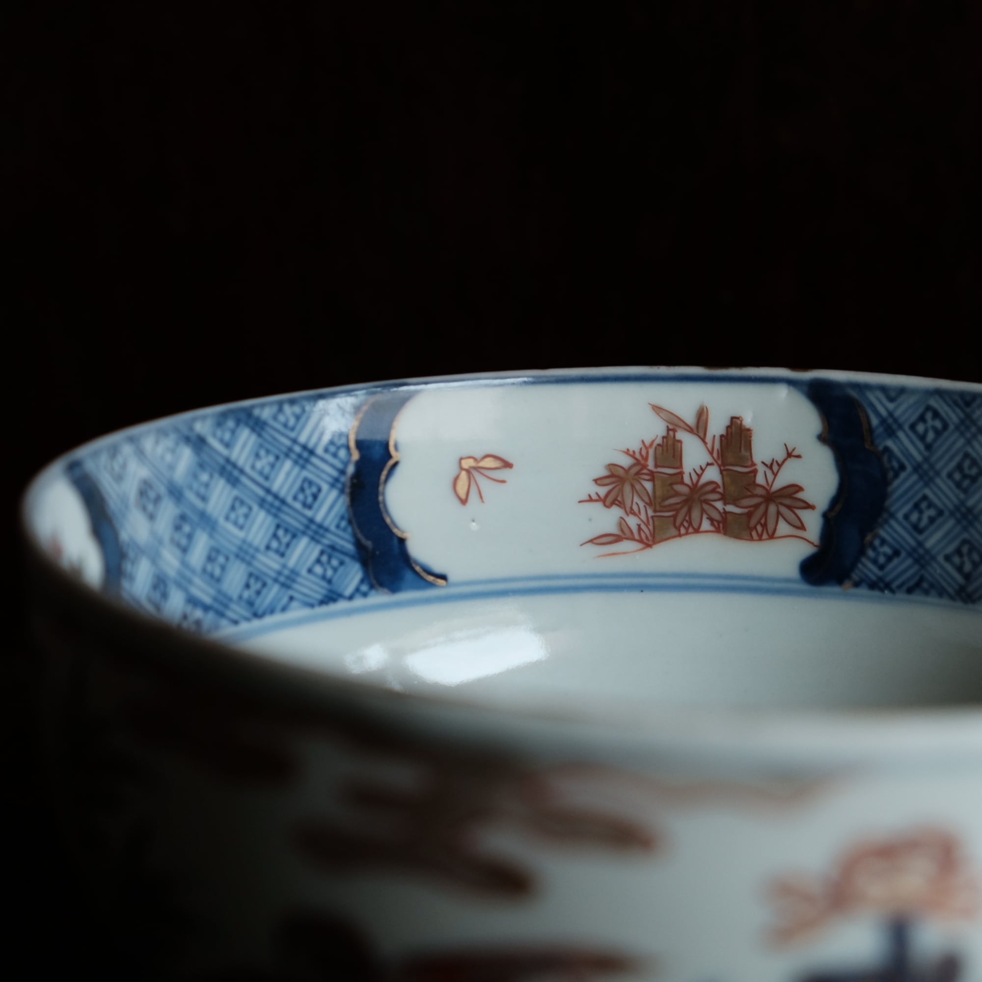 染付を基調とした上に朱・金・緑とゴージャスな雰囲気が漂う仕上がりの絵付け。