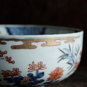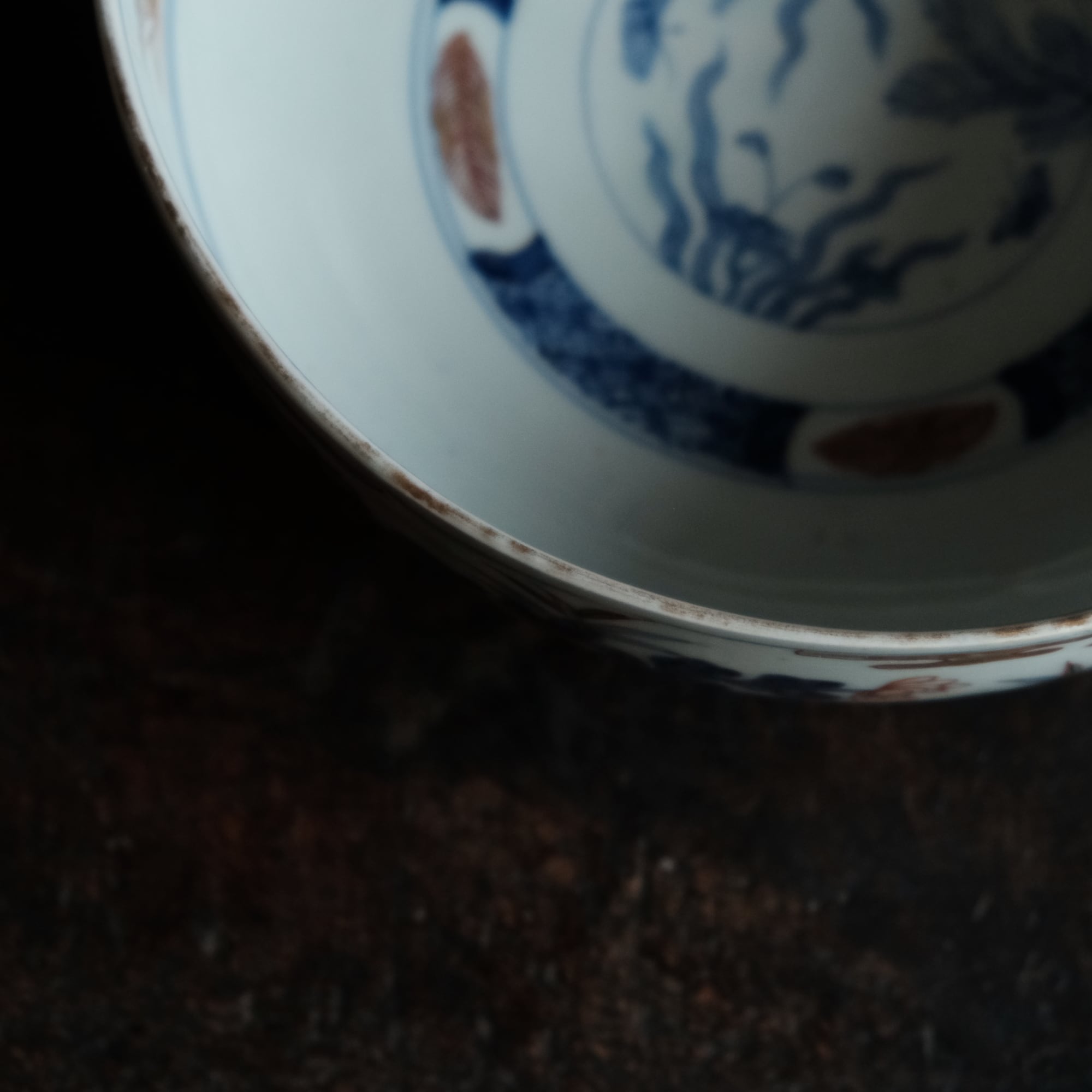 染付を基調とした上に朱・金・緑とゴージャスな雰囲気が漂う仕上がりの絵付け。