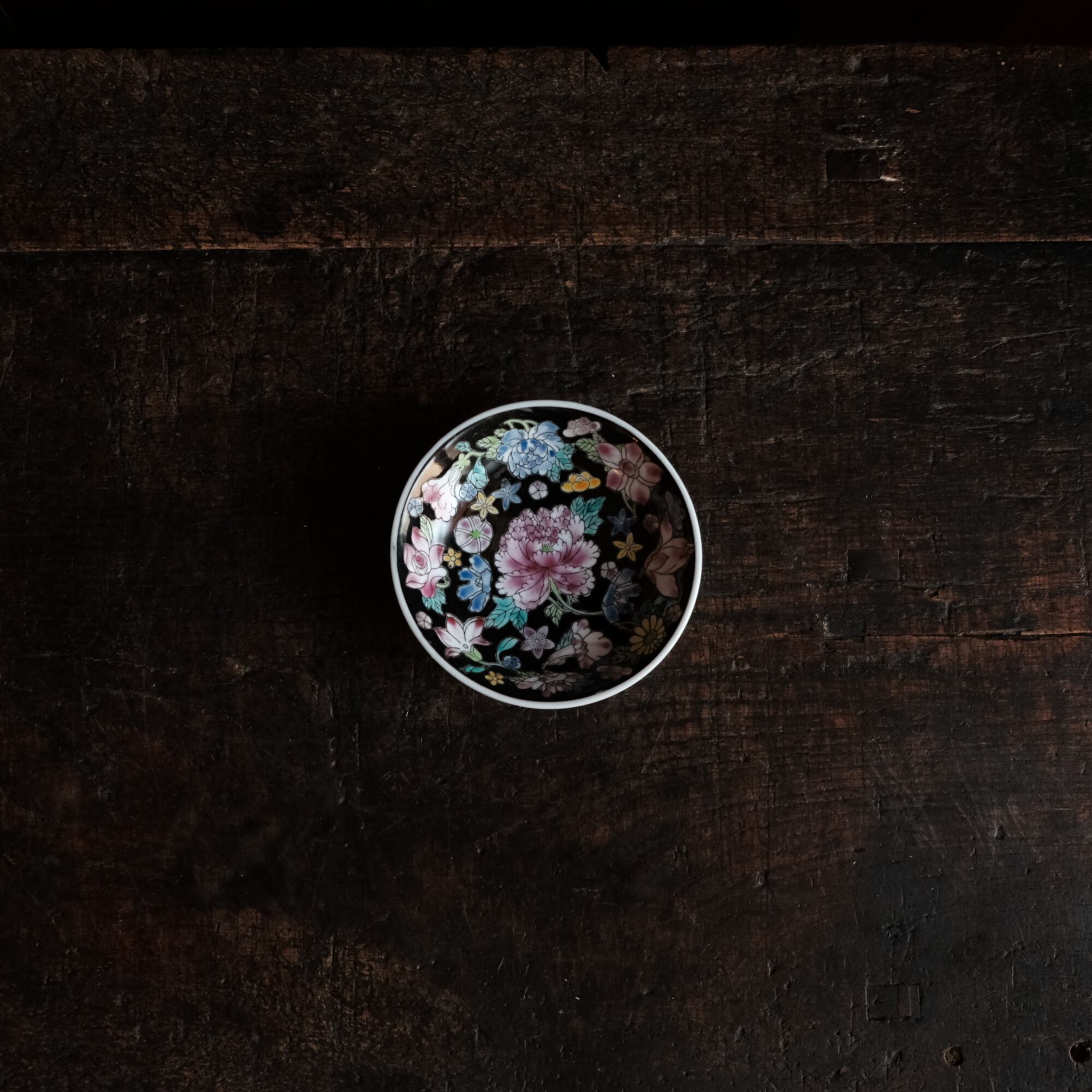 黒にカラフルな花尽くし◆中国景徳鎮 色絵小皿 茶器 シノワズリ チャイナレトロ インテリア BK【色薄め】