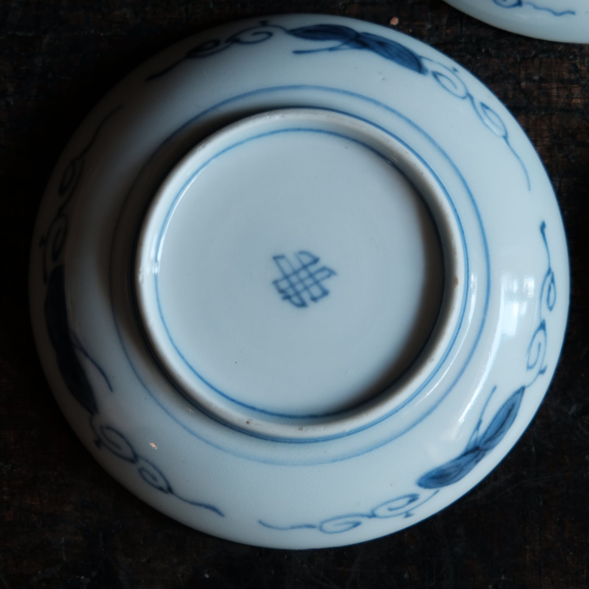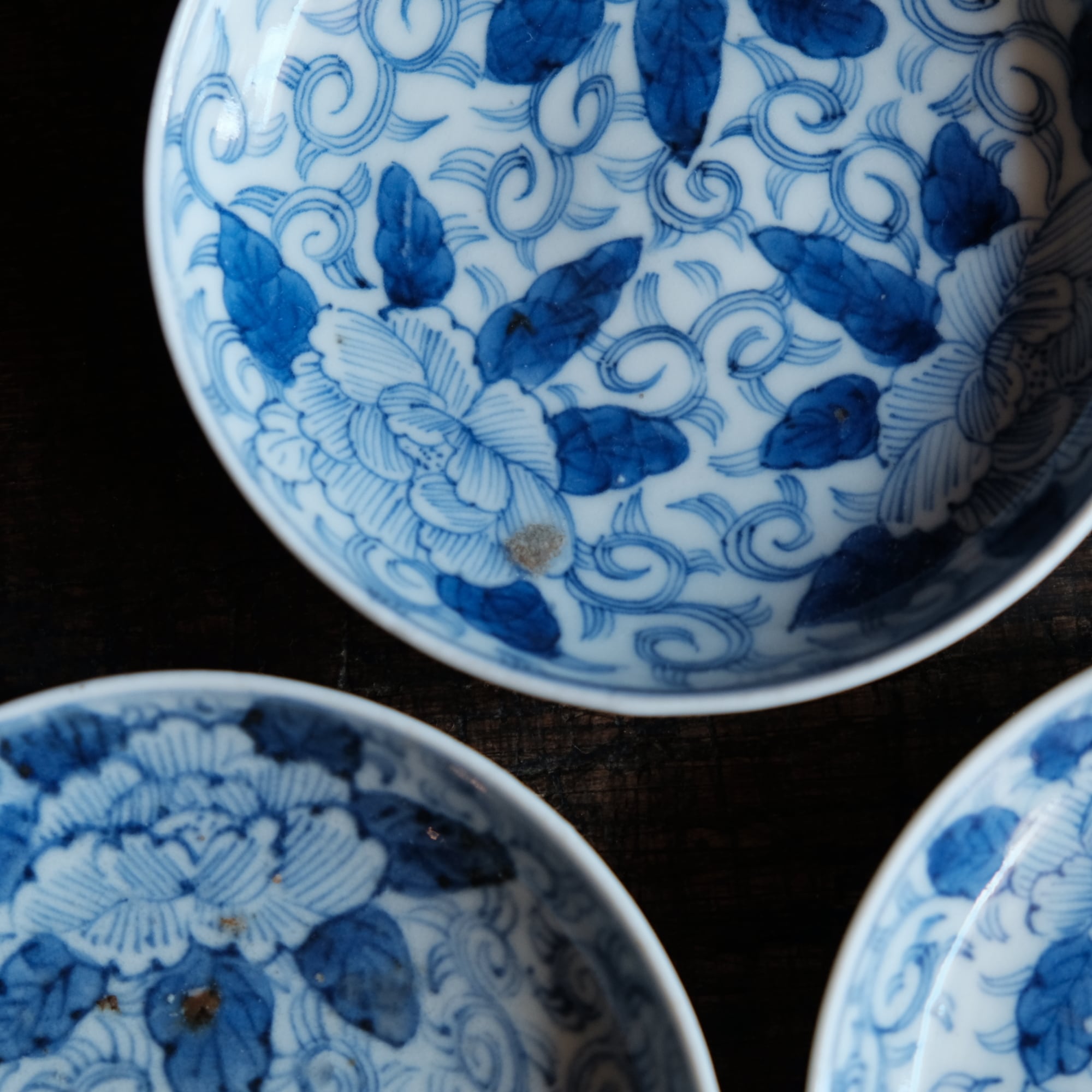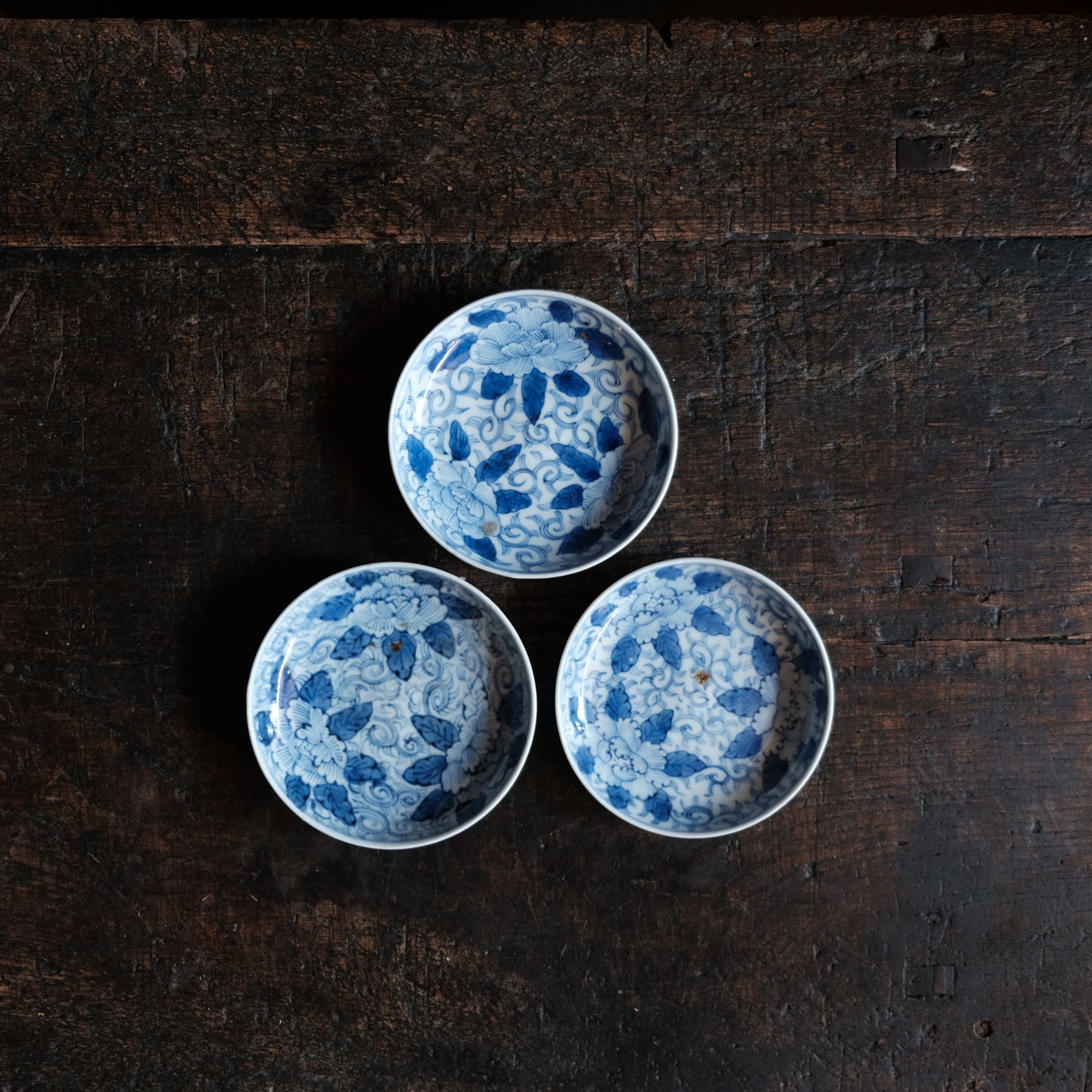 【セット特価】線描きで素敵◆牡丹と唐草 伊万里 線描き染付小皿3客セット 骨董・antiques 丁寧な暮らしに。江戸後期【バラ売り不可】