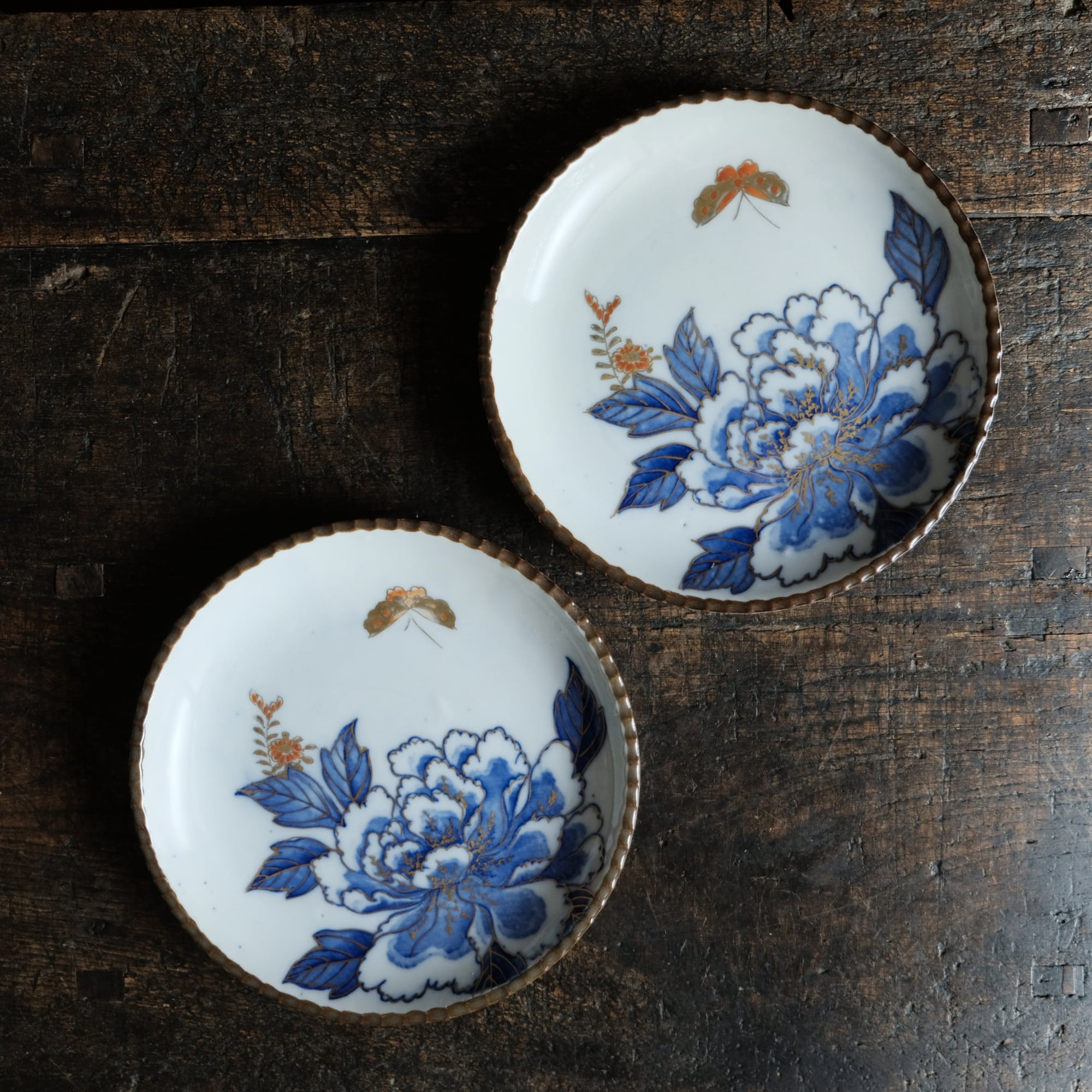 【セット特価】蝶と芍薬◆伊万里 錦手金彩イゲ皿2客 中皿 骨董/antiques 古美術 明治期【バラ売り不可】