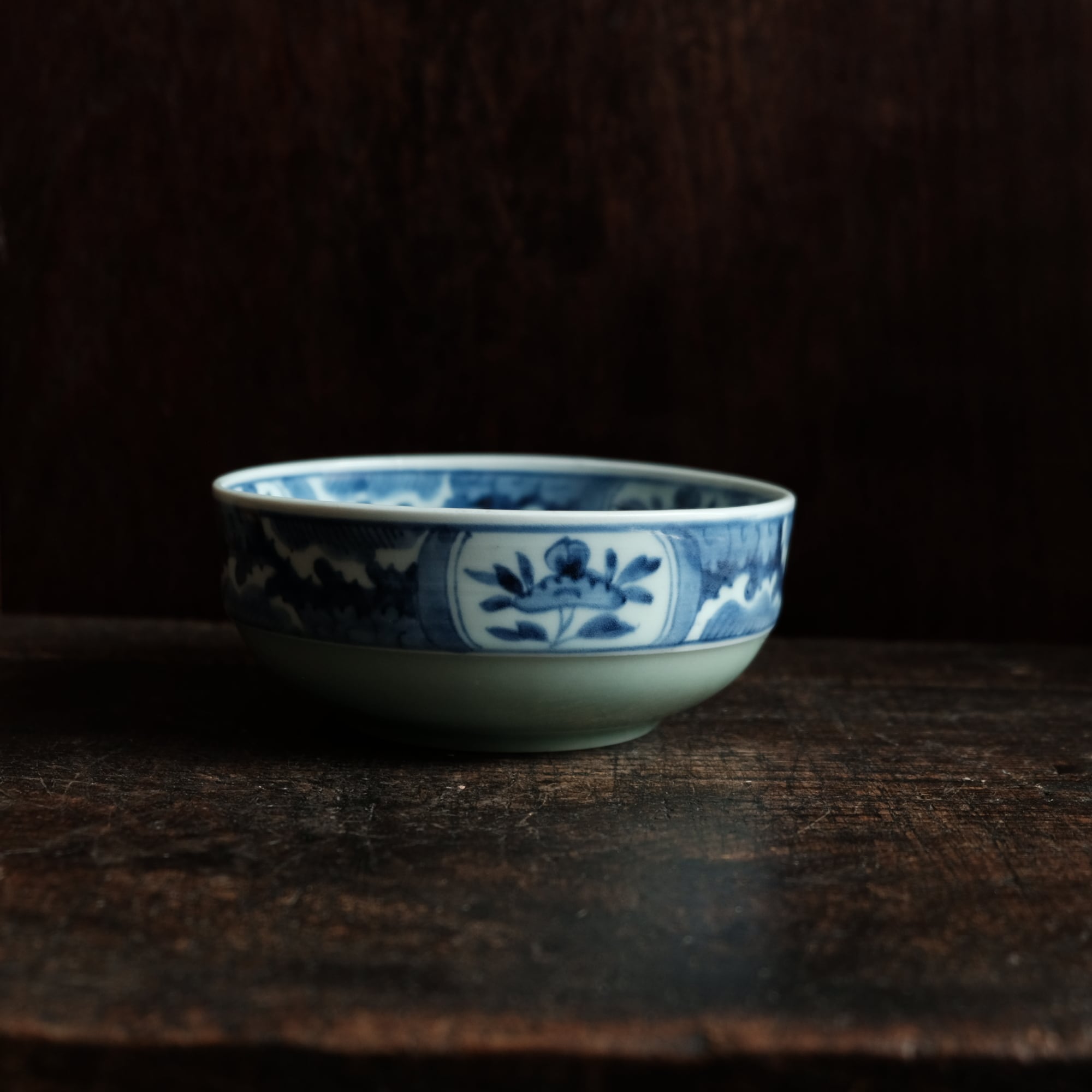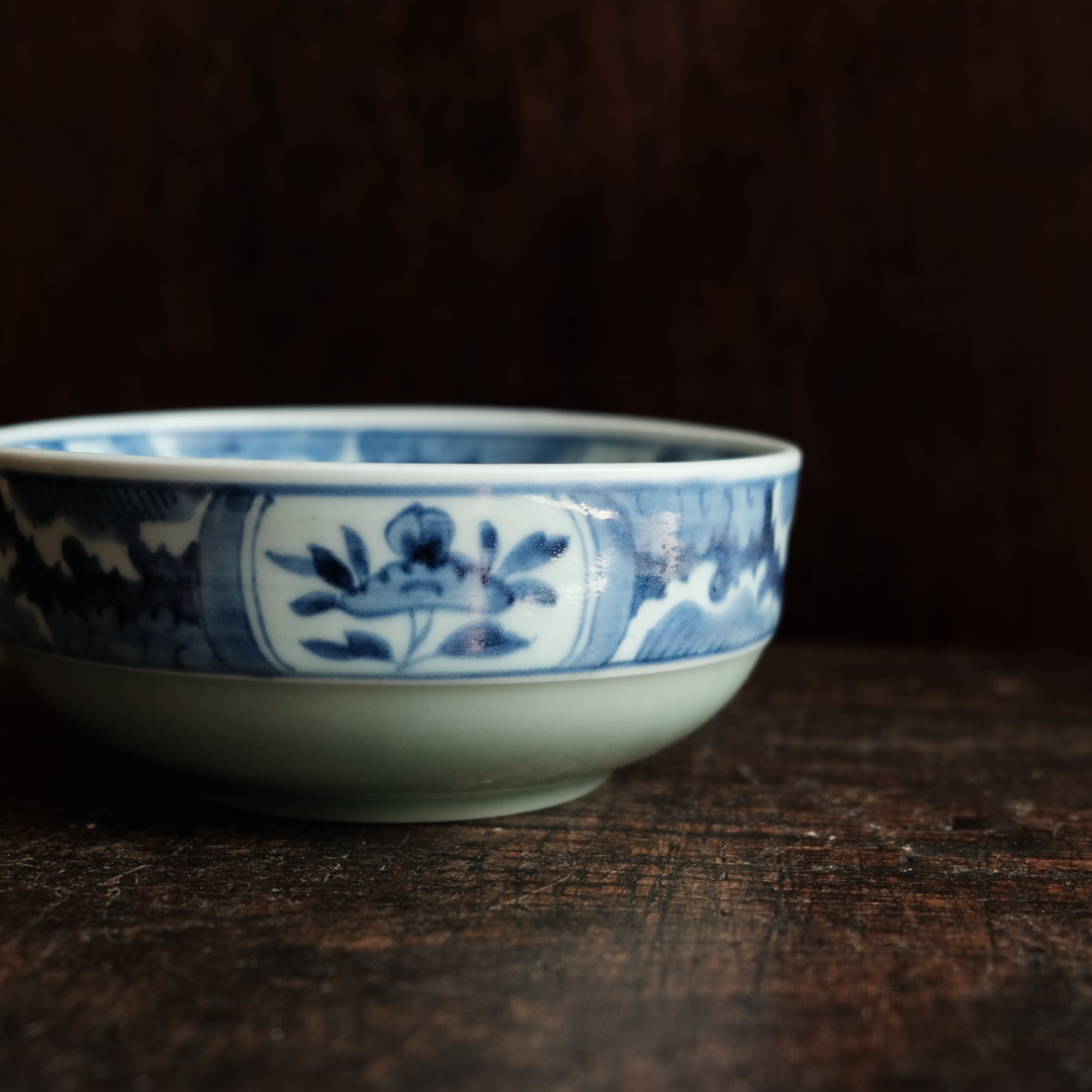 水面から顔を出す魚◆首江長春。伊万里 染付青磁花魚文染付碗 骨董/antiques 古美術 暮らしに。江戸期