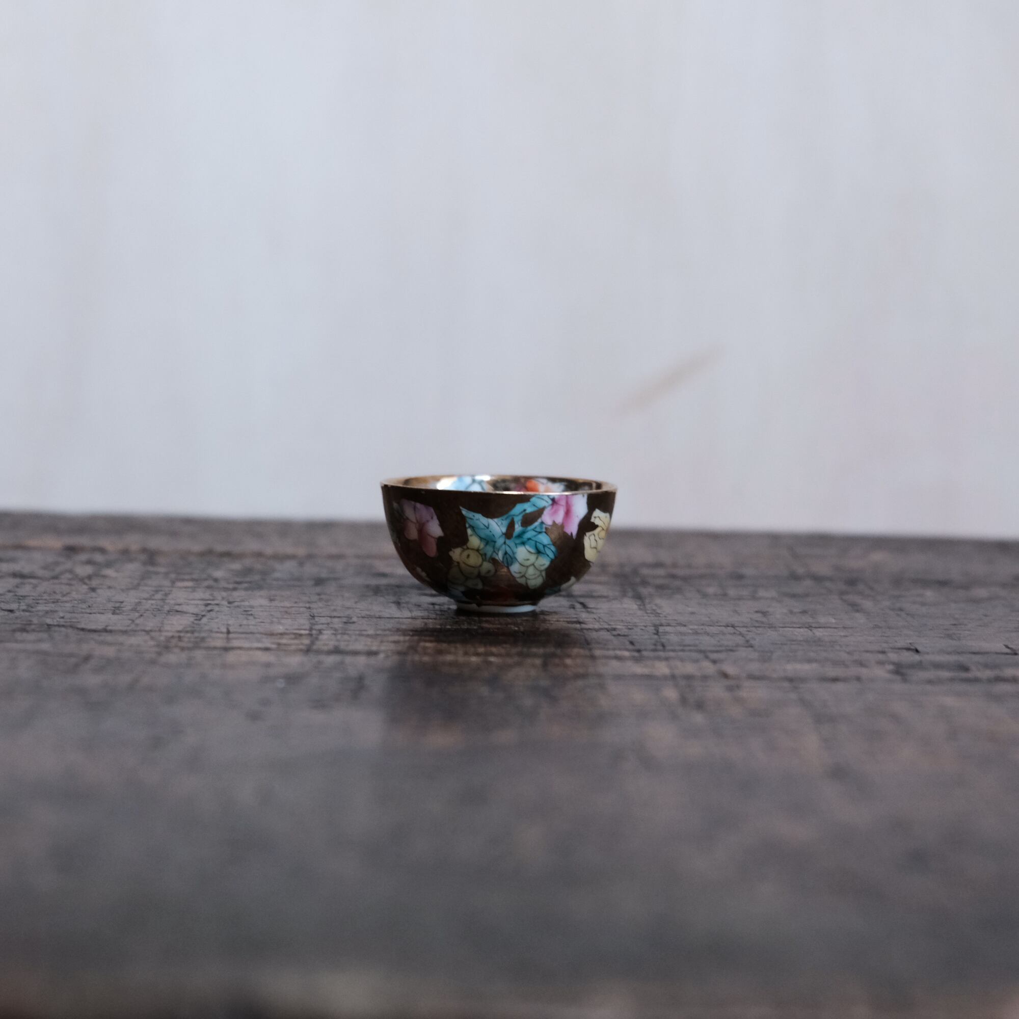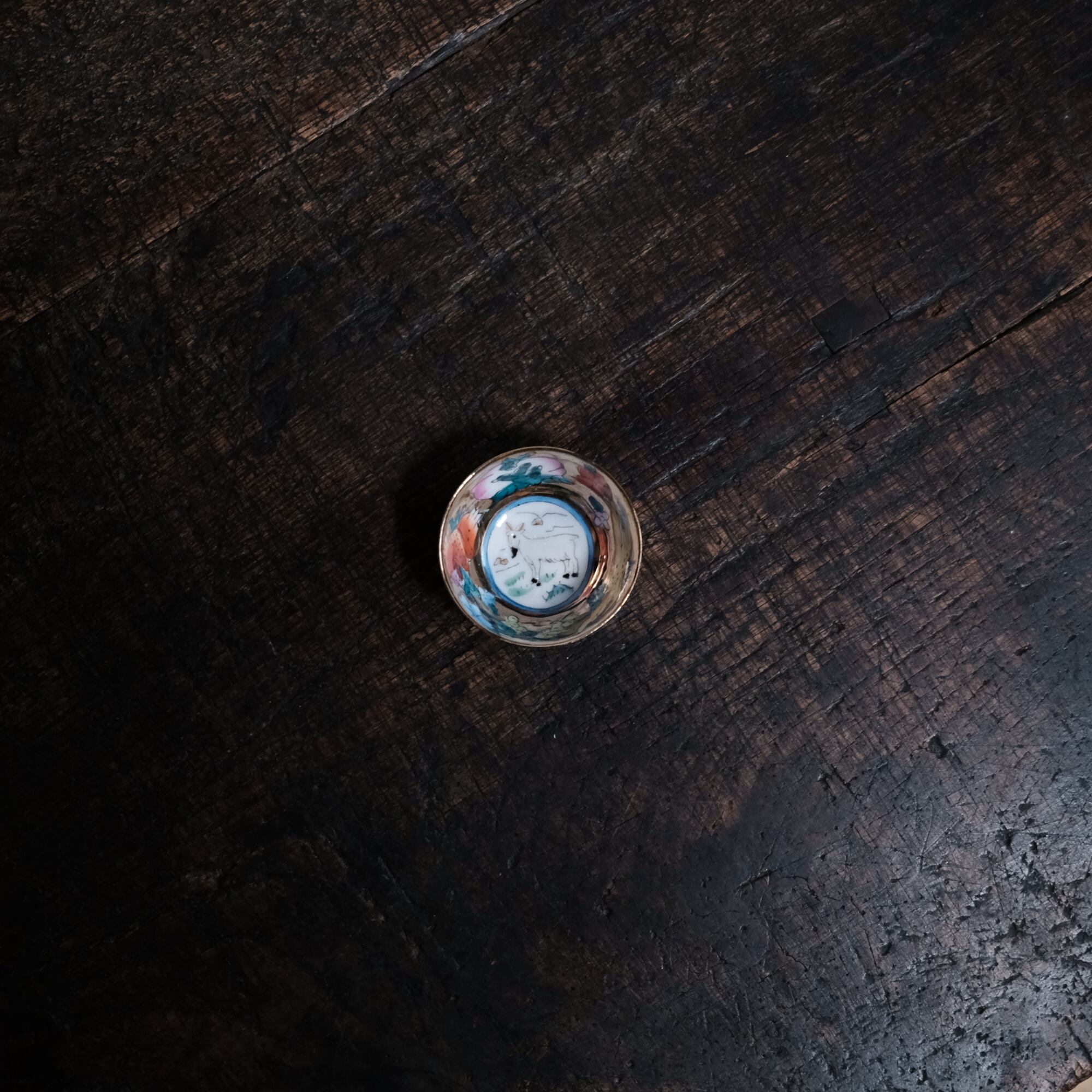 見込みに山羊(未)◆花と果実。中国産 made in china 干支文色絵金彩小ぶり猪口 茶杯 シノワズリ チャイナレトロ b2