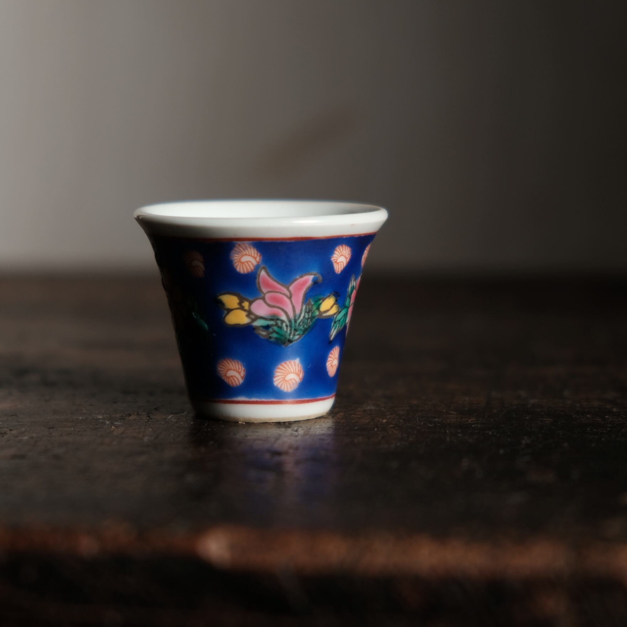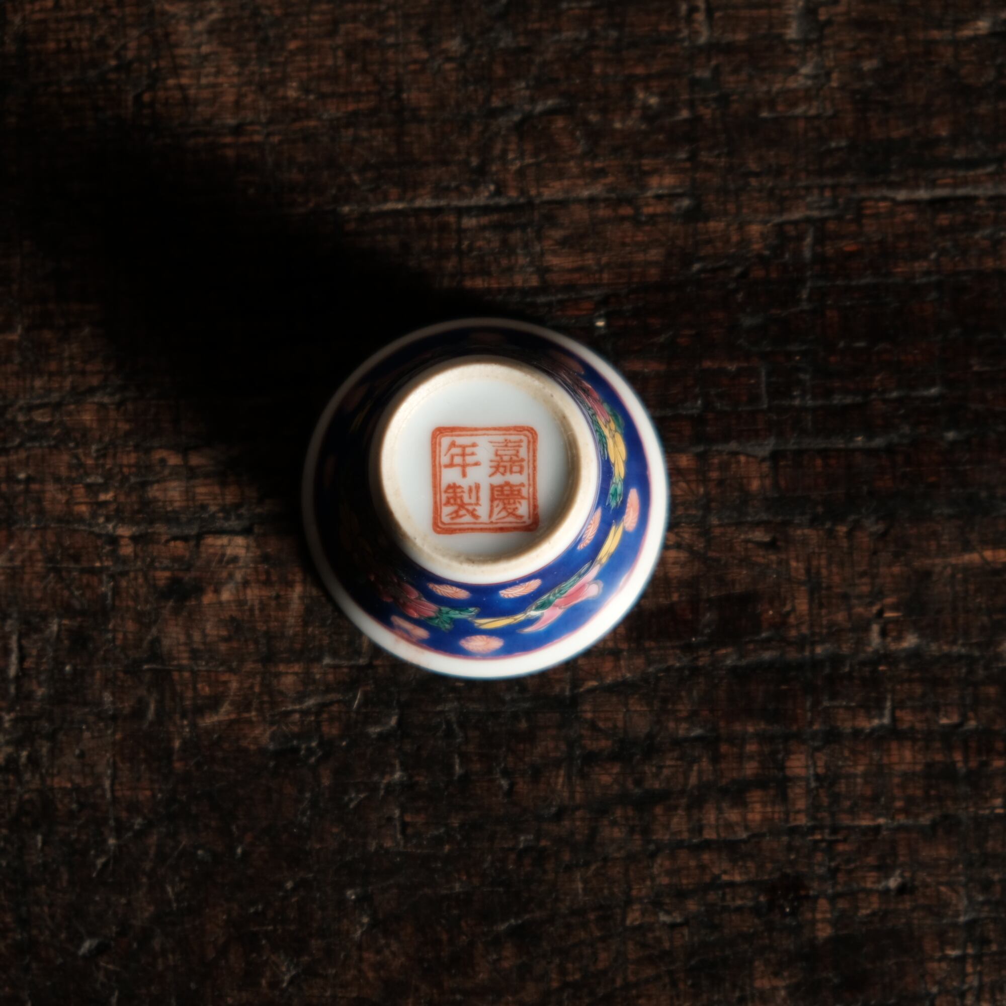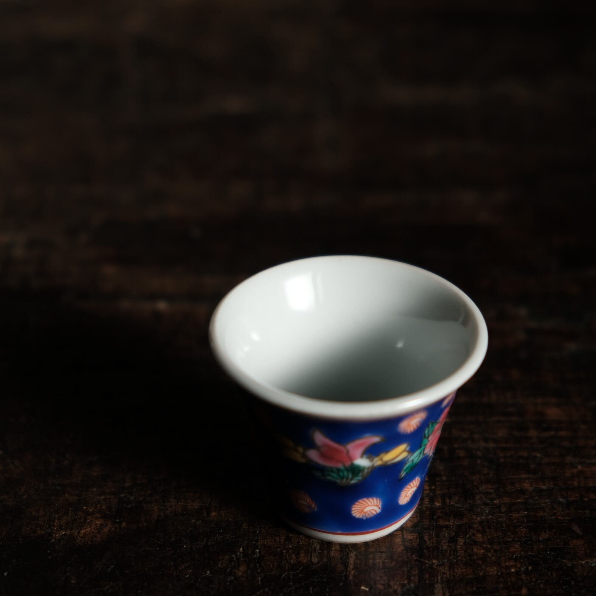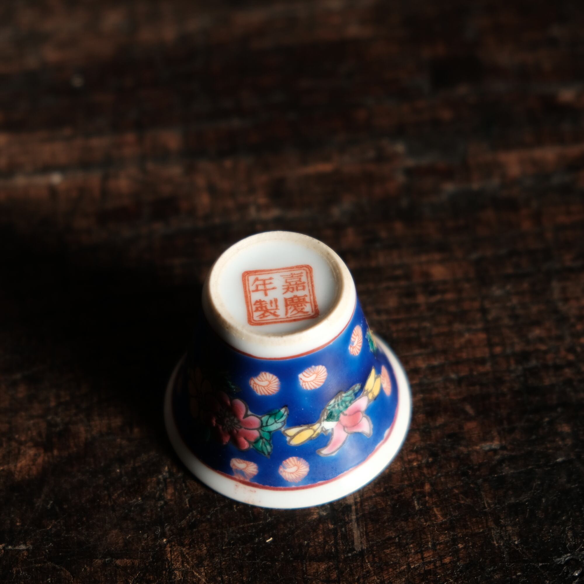 嘉慶年製◆花の文様。中国景徳鎮 色絵小ぶり猪口 茶杯 茶器 チャイナレトロ オブジェ【剥がれ多め】