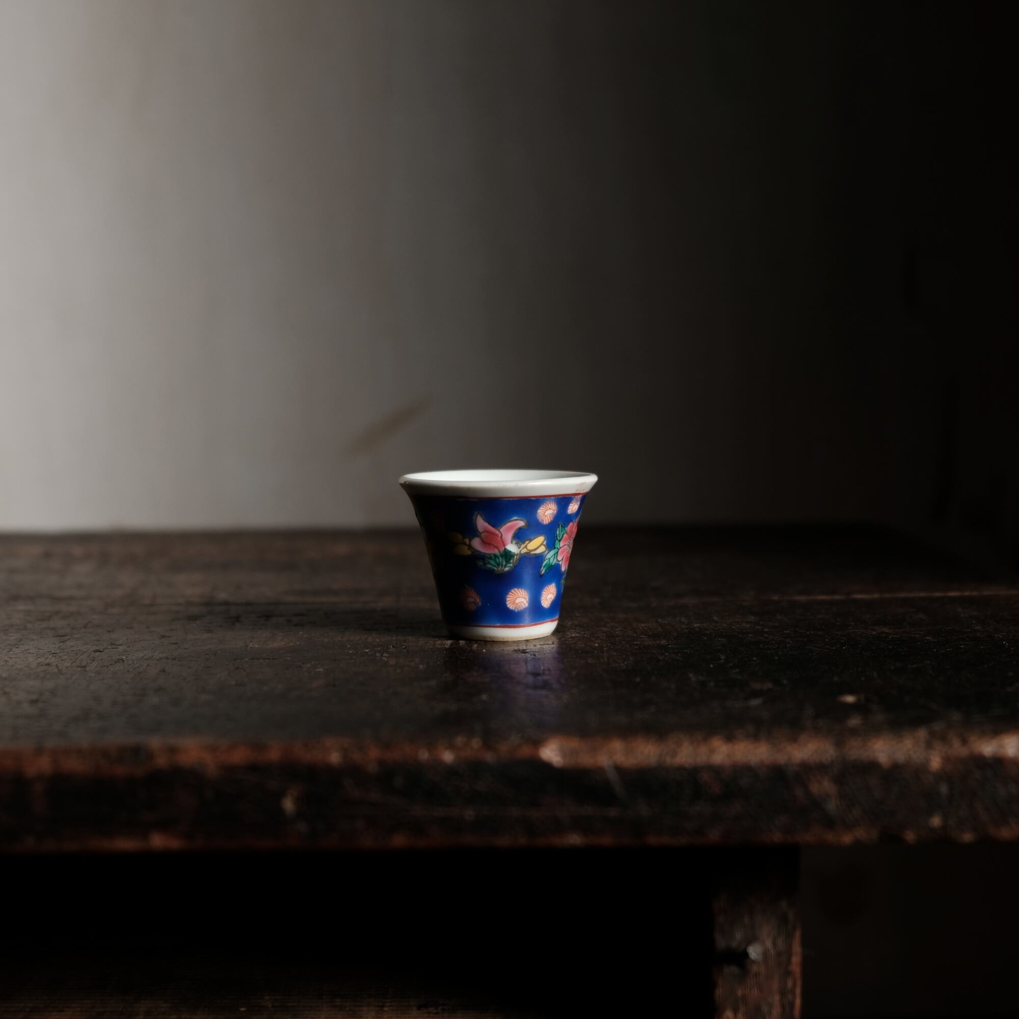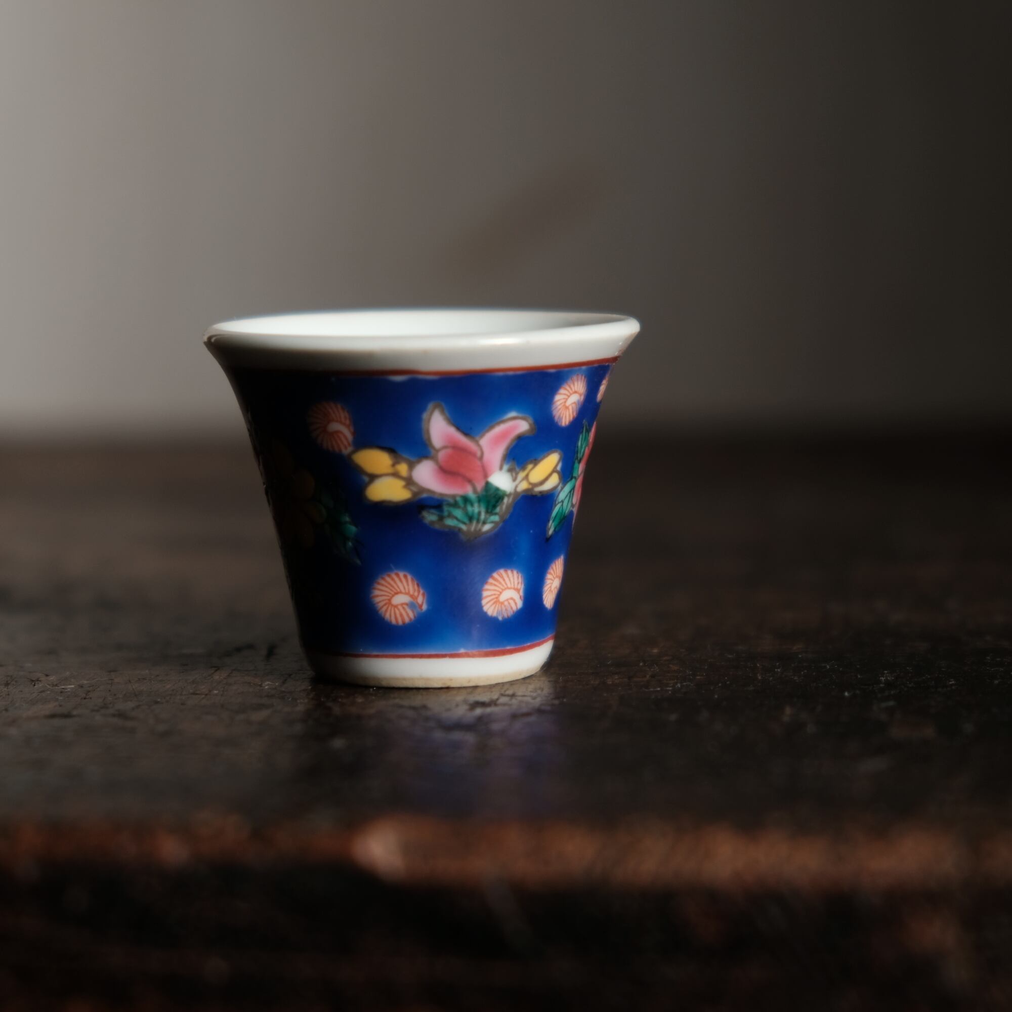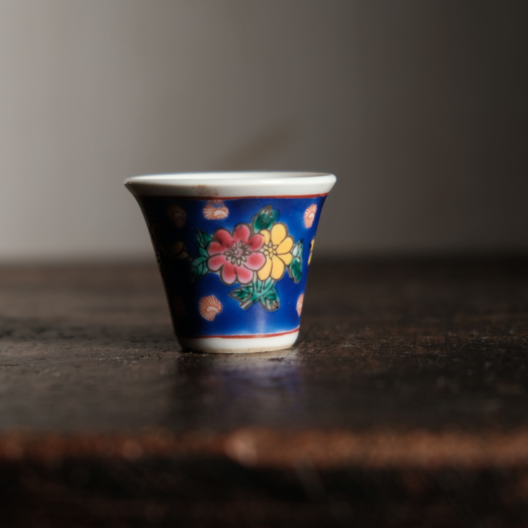 嘉慶年製◆花の文様。中国景徳鎮 色絵小ぶり猪口 茶杯 茶器 チャイナレトロ オブジェ【剥がれ多め】