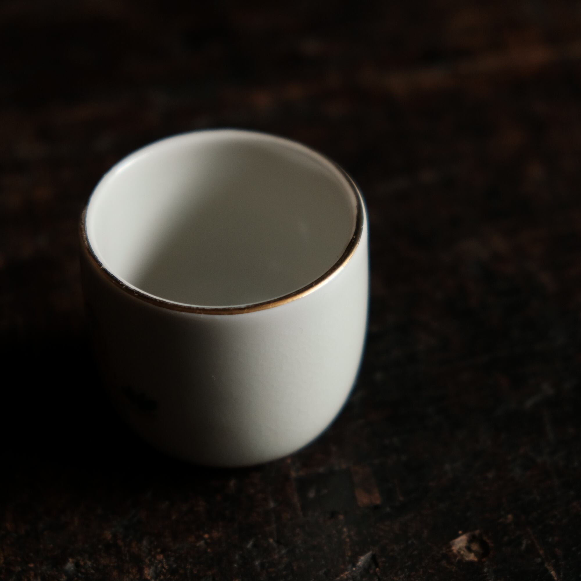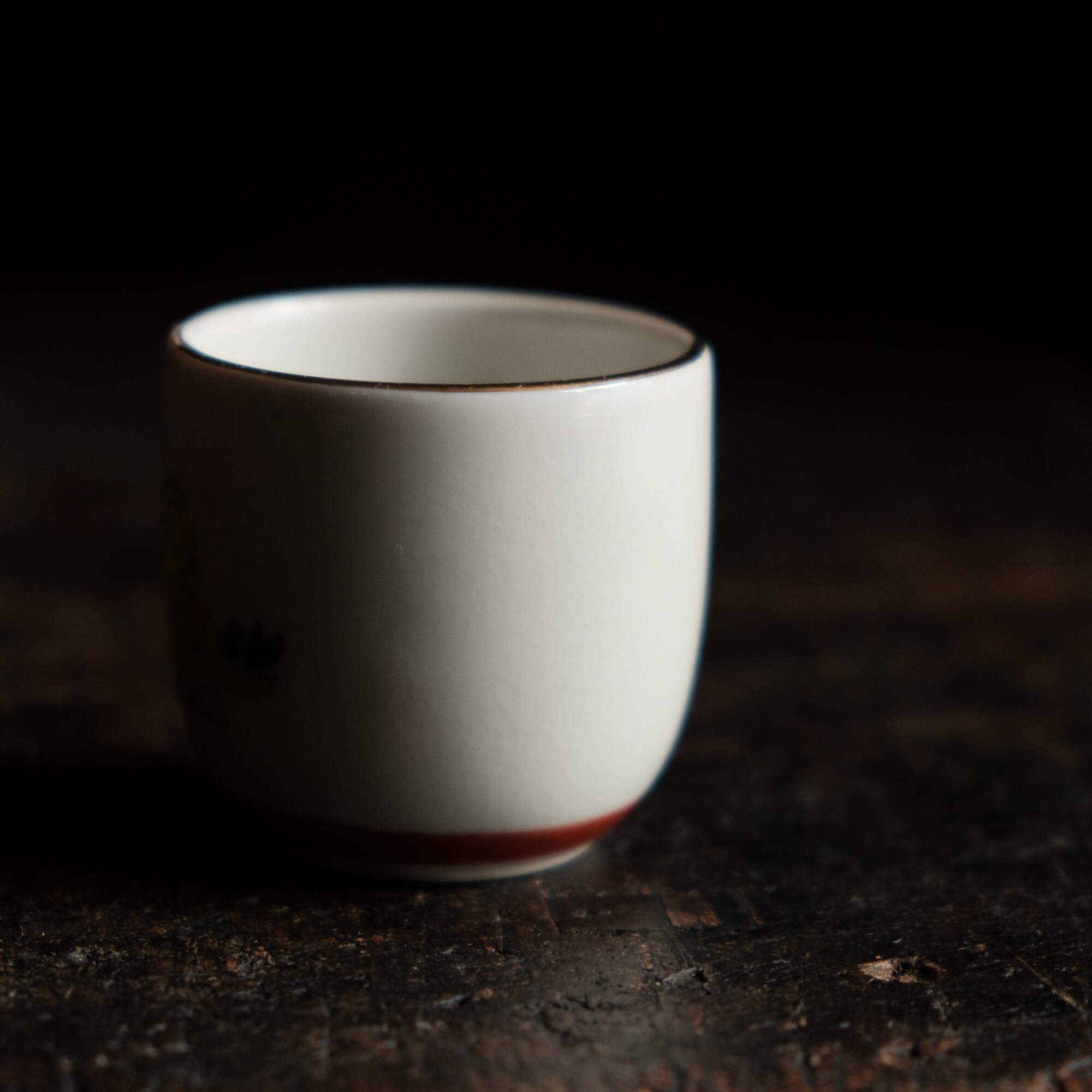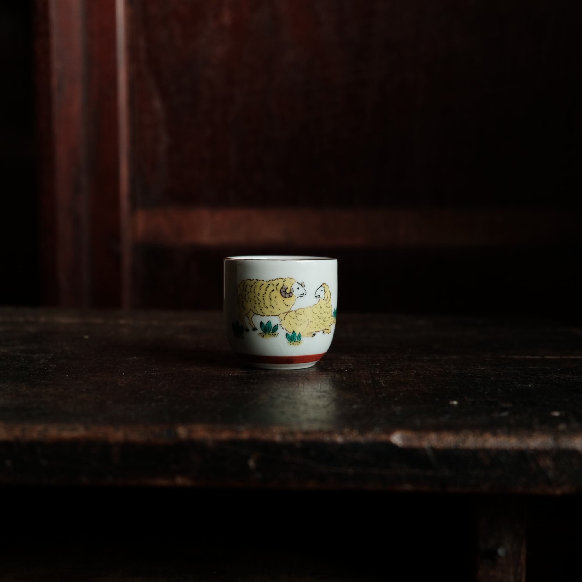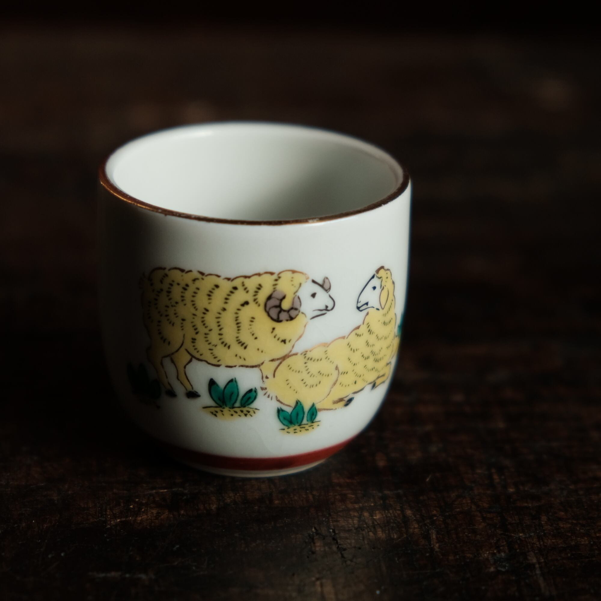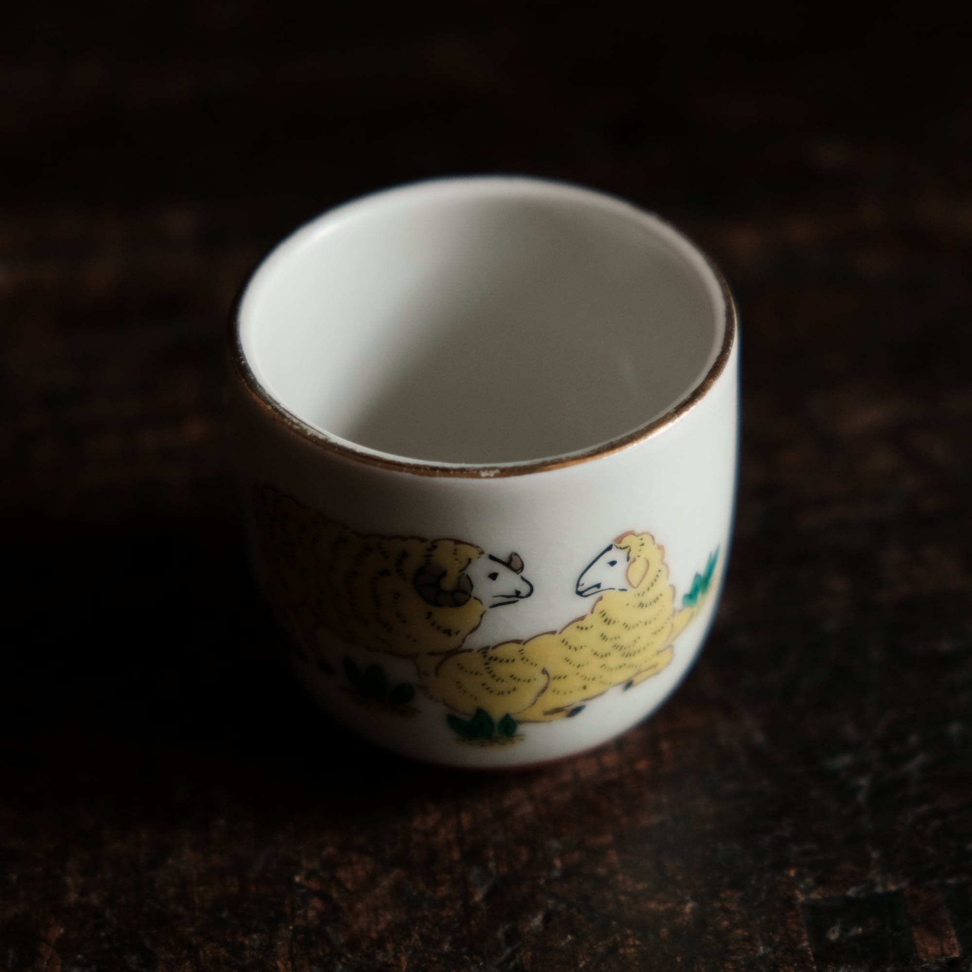 休息する2匹の黄色い羊(未)◆九谷焼 干支文色絵金彩猪口 昭和レトロ 酒器 コレクション プリント・転写 i6