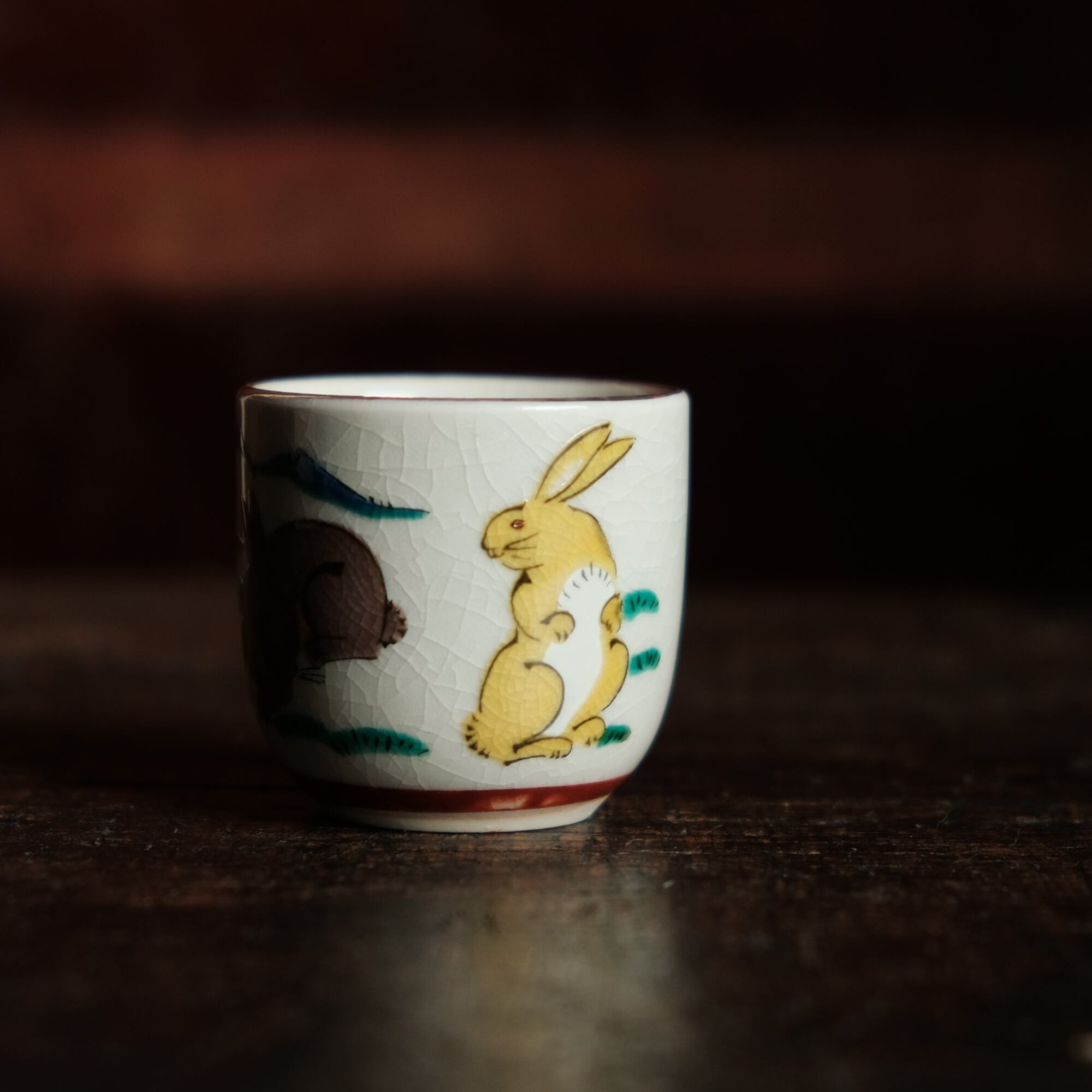 異なる色合いの2匹の兎(卯)◆九谷焼 干支文色絵金彩猪口 昭和レトロ 酒器 コレクション プリント・転写 i6