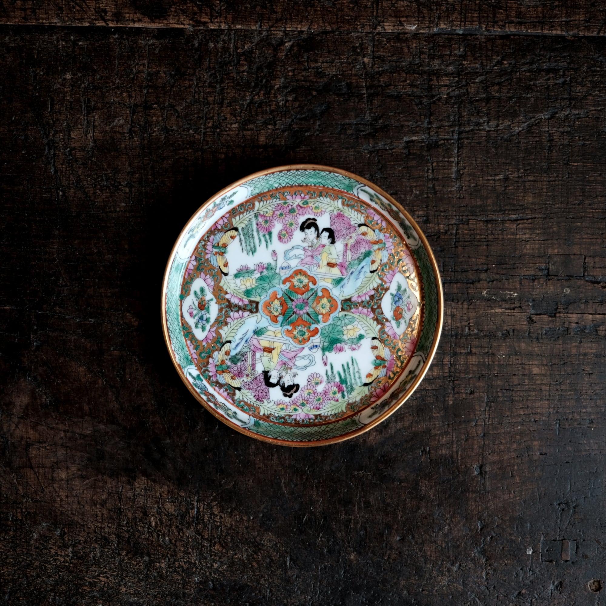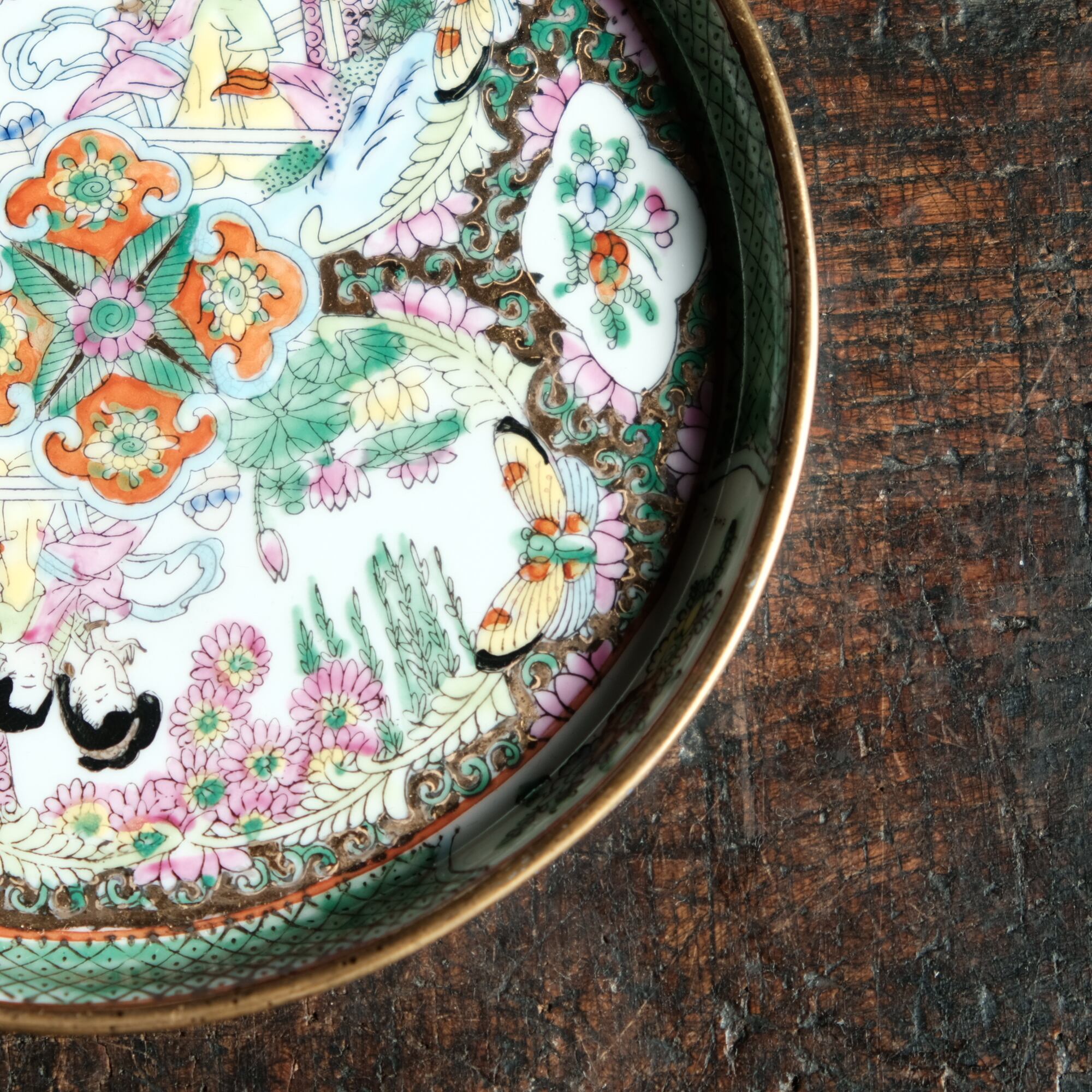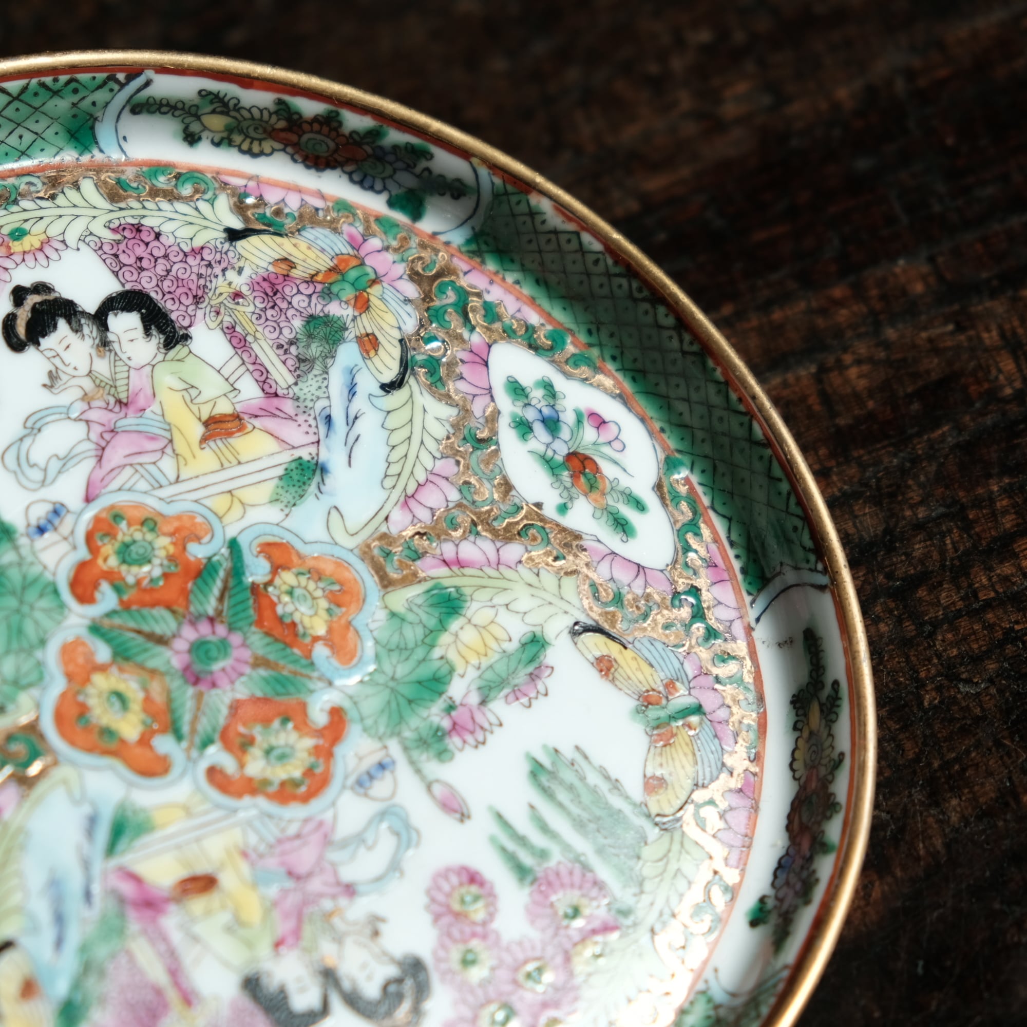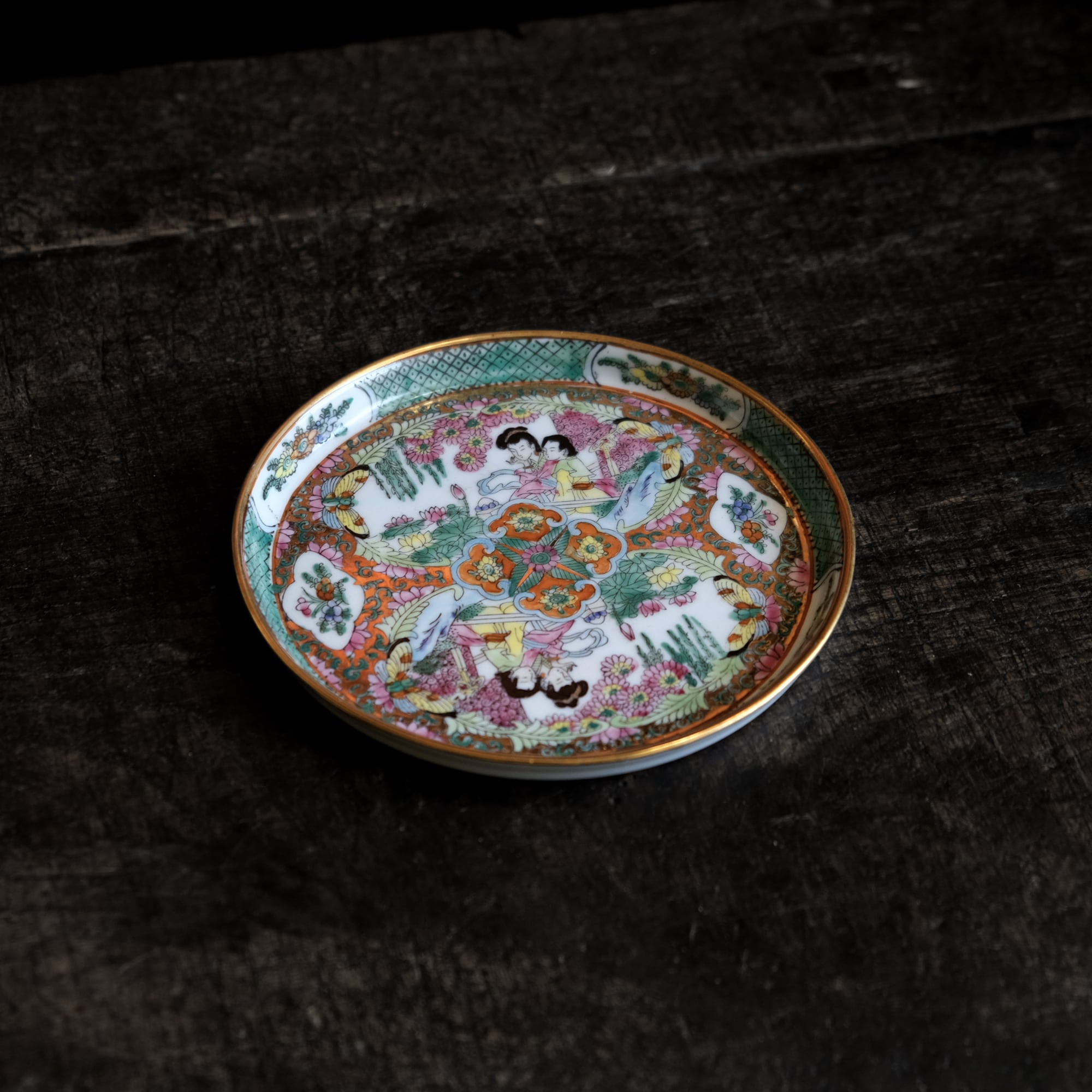 花と蝶と天女◆カラフルで素敵。中国産 色絵金彩中皿プレート 茶杯 煎茶茶器 シノワズリ チャイナレトロ インテリア b1