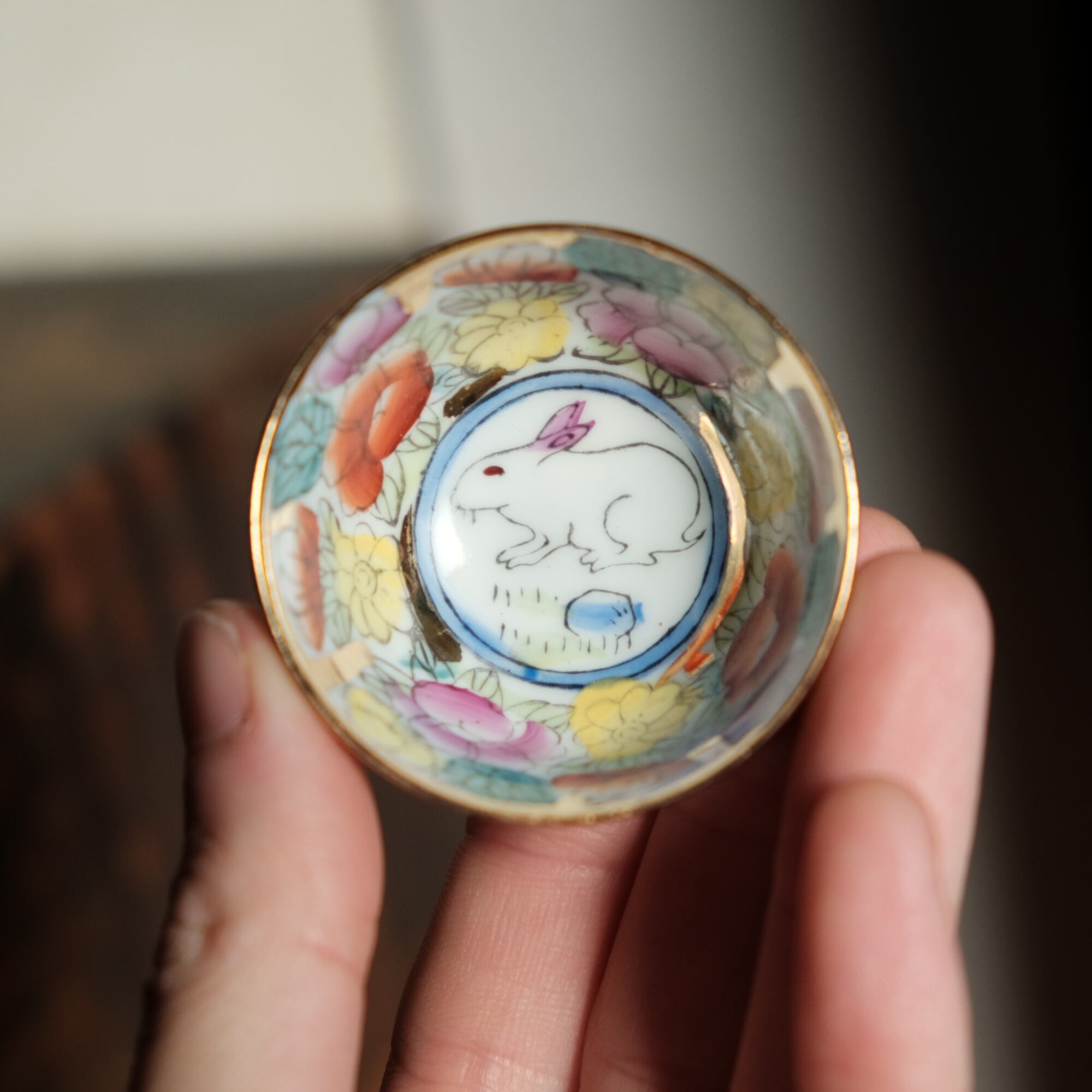 見込みにウサギ(兎)◆チャイナレトロで可愛い。中国出品 干支 色絵金彩小ぶり猪口 花尽くし。シノワズリ b3