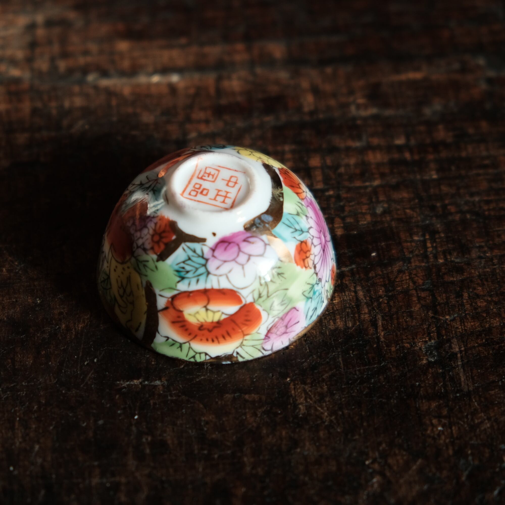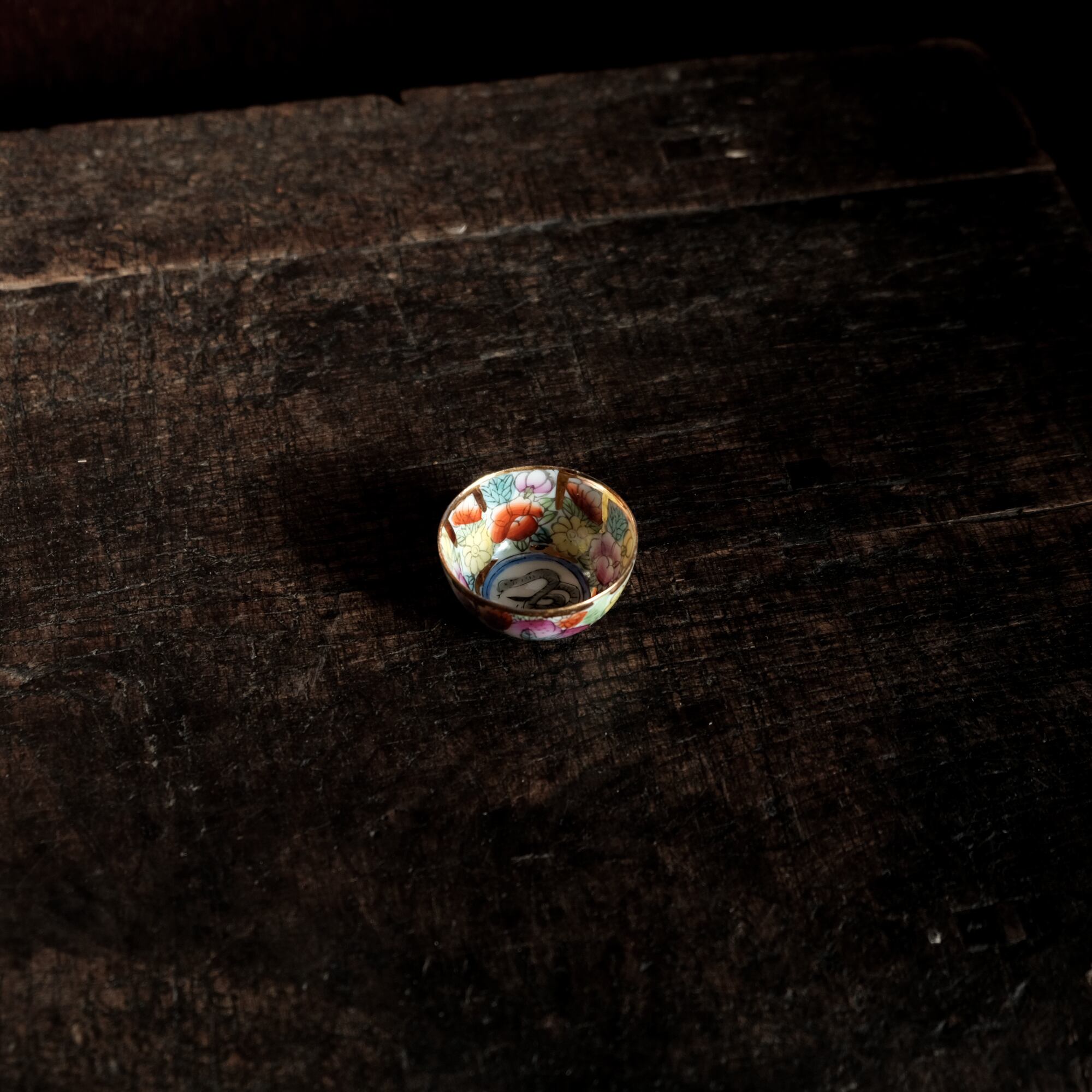 見込みに蛇(巳)◆チャイナレトロで可愛い。中国出品 干支 色絵金彩小ぶり猪口 花尽くし。シノワズリ b3