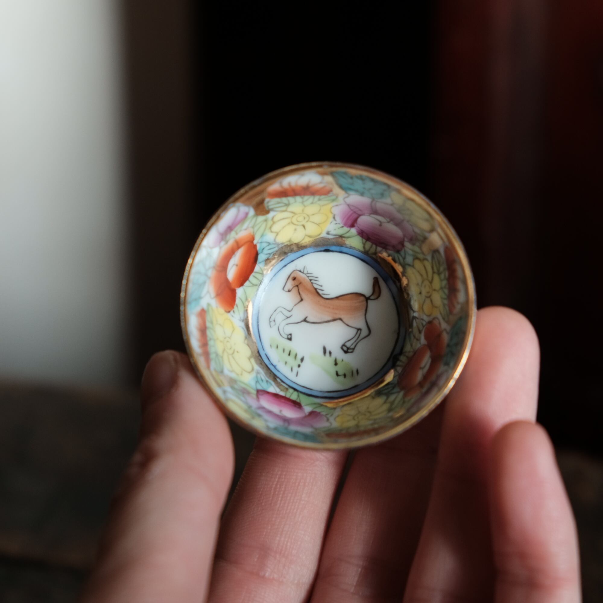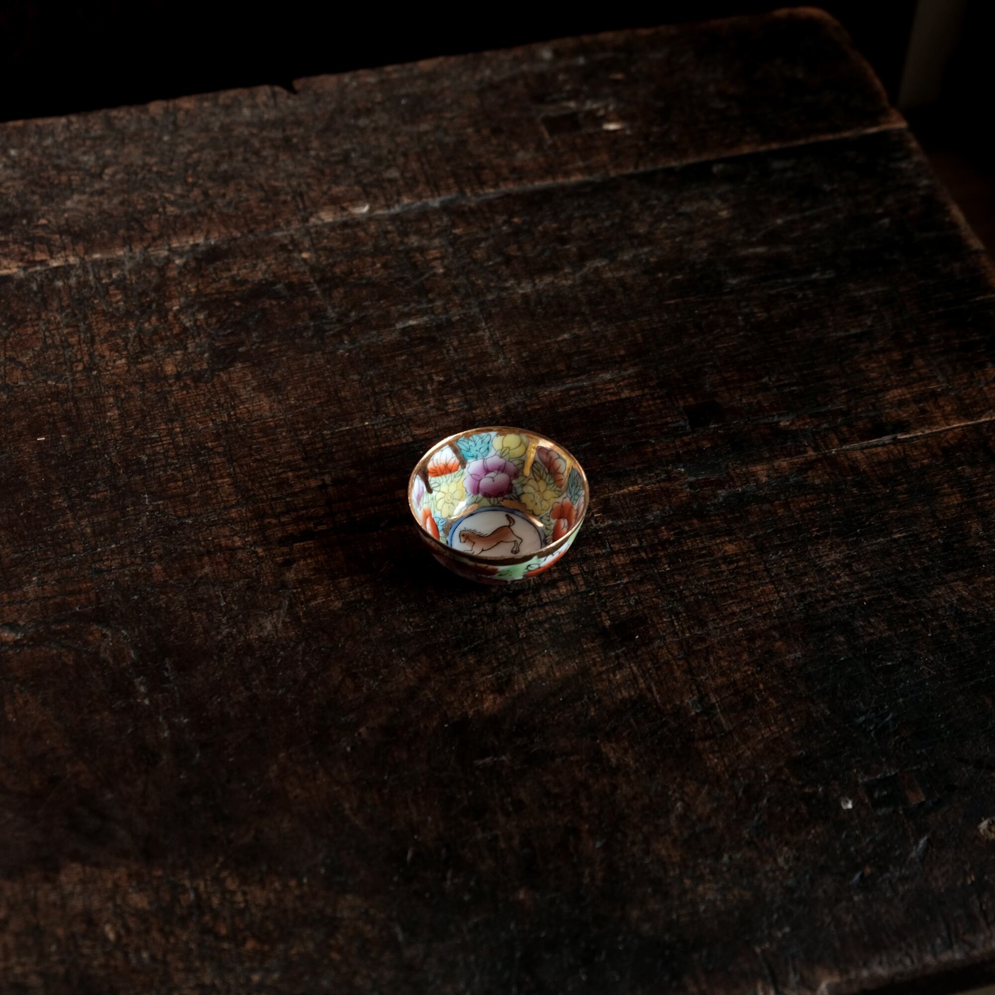 見込みに馬(午)◆チャイナレトロで可愛い。中国出品 干支 色絵金彩小ぶり猪口 花尽くし。シノワズリ b3