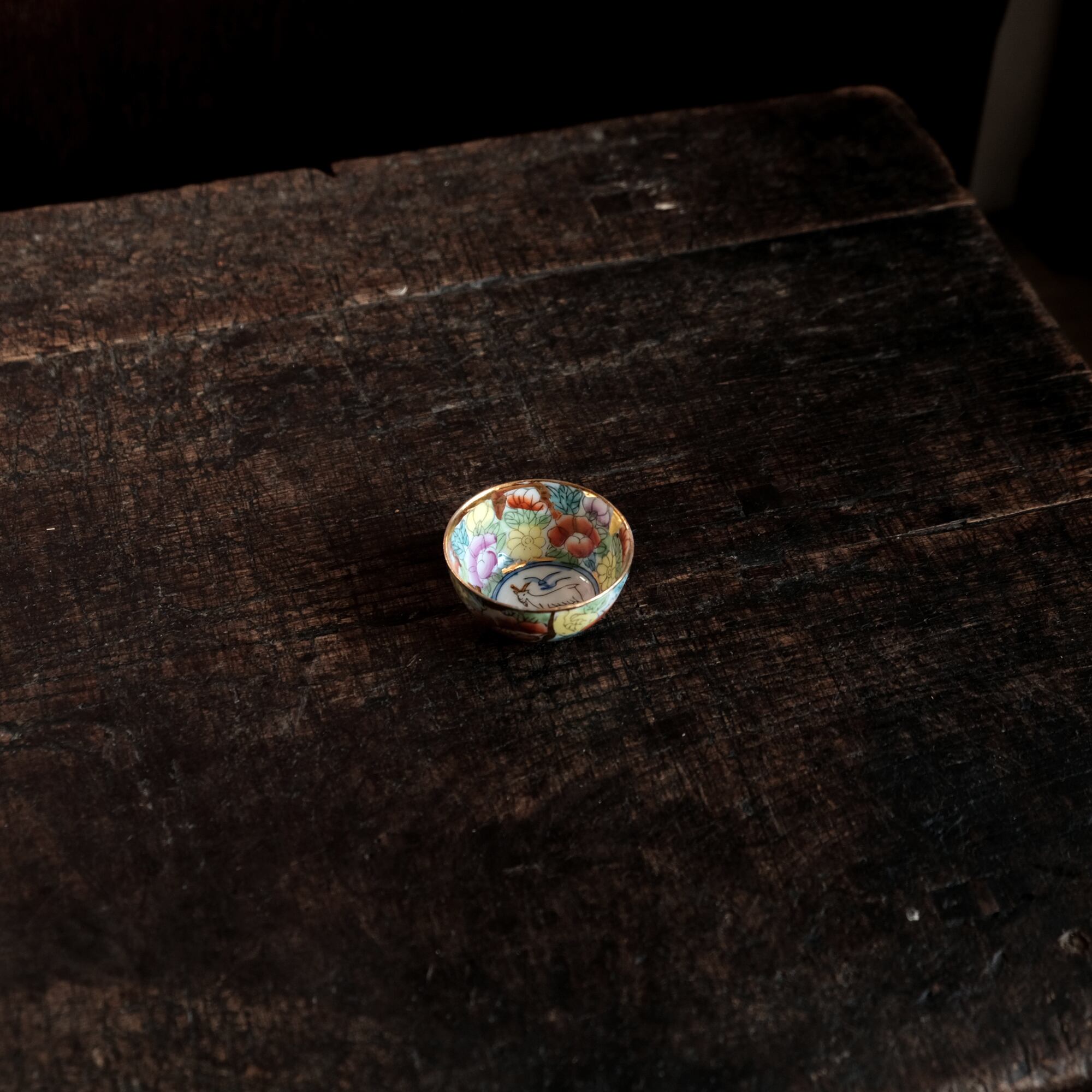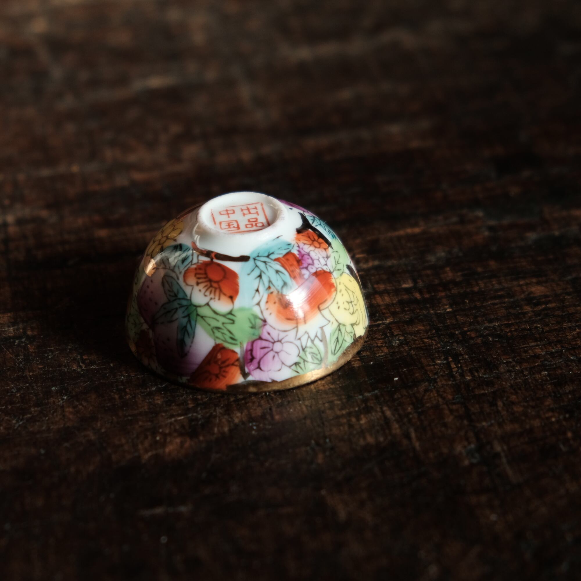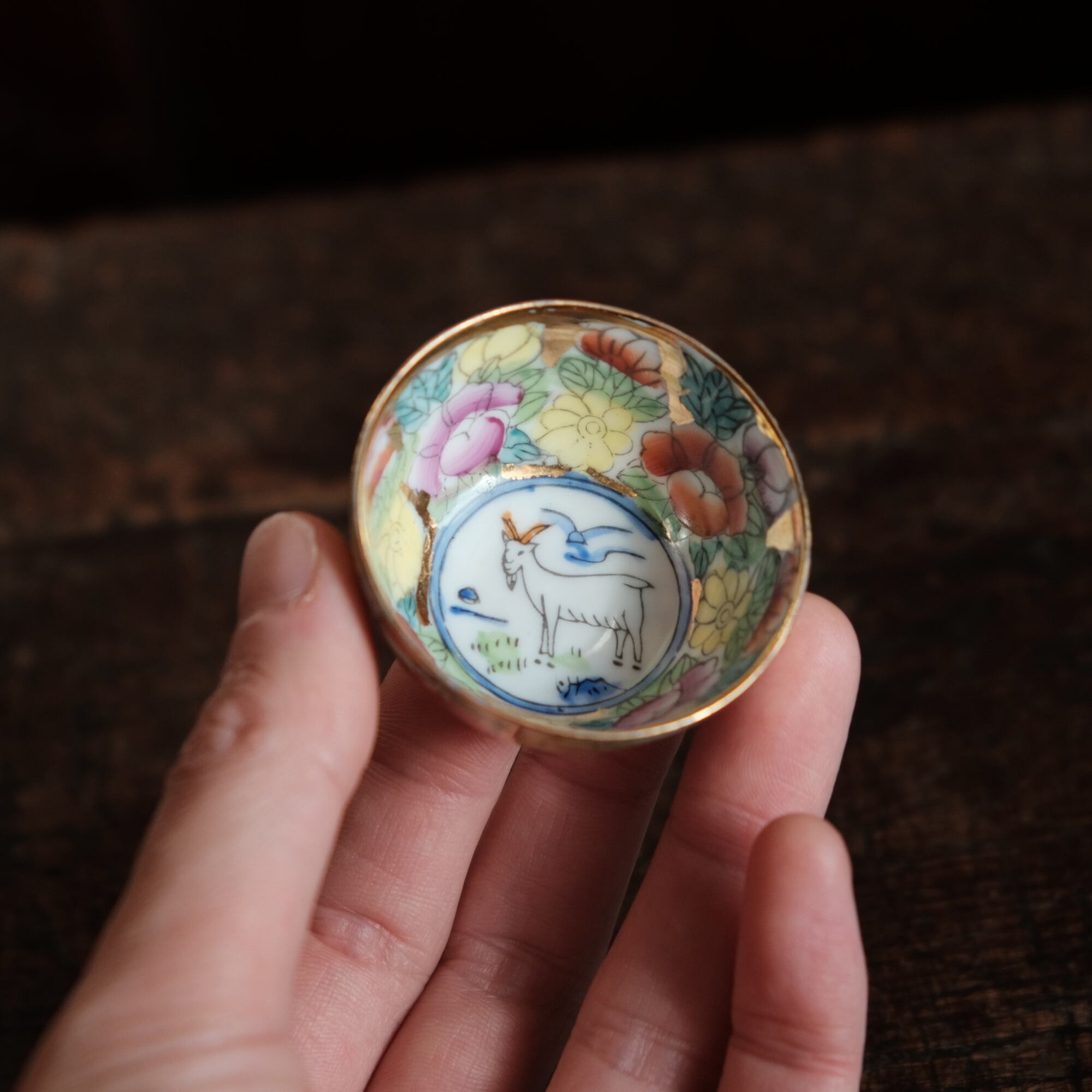 見込みに山羊(未)◆チャイナレトロで可愛い。中国出品 干支 色絵金彩小ぶり猪口 花尽くし。シノワズリ b3