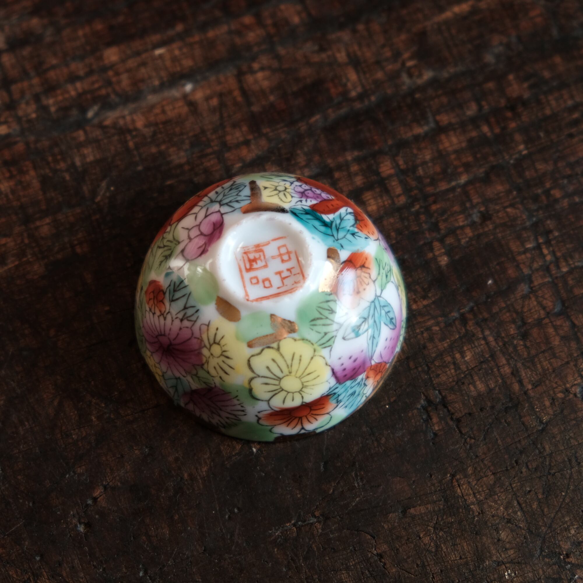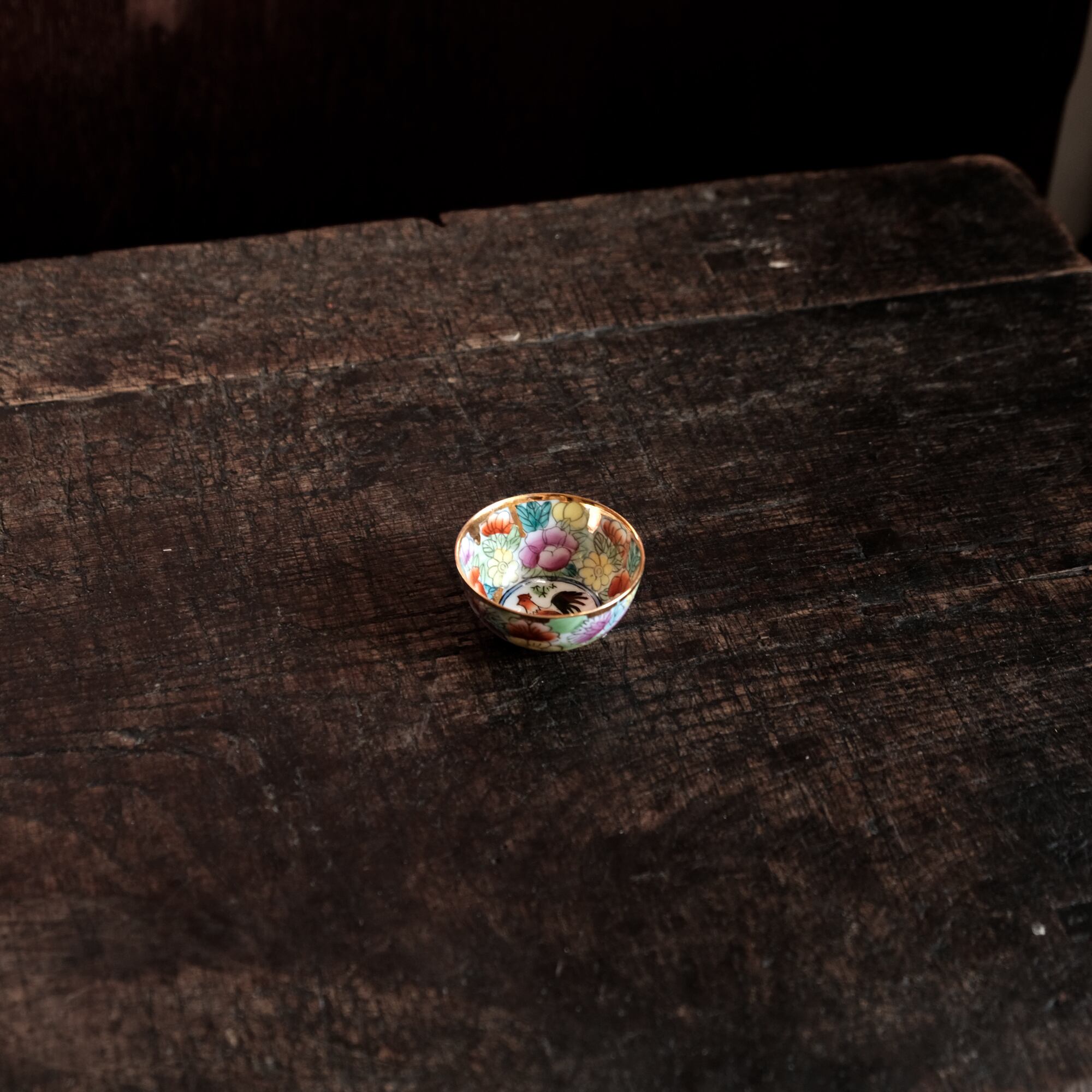 見込みに鶏(酉)◆チャイナレトロで可愛い。中国出品 干支 色絵金彩小ぶり猪口 花尽くし。シノワズリ b3