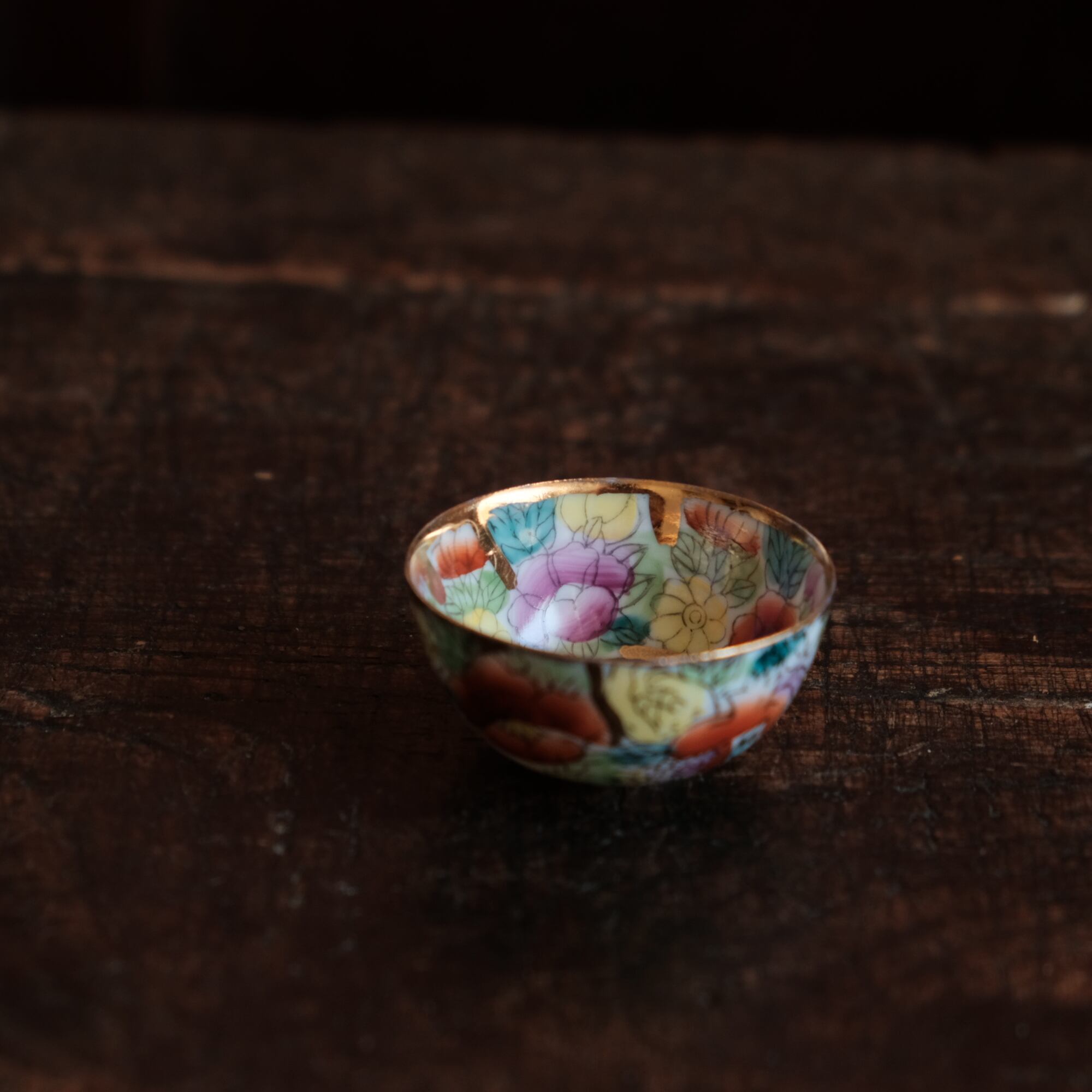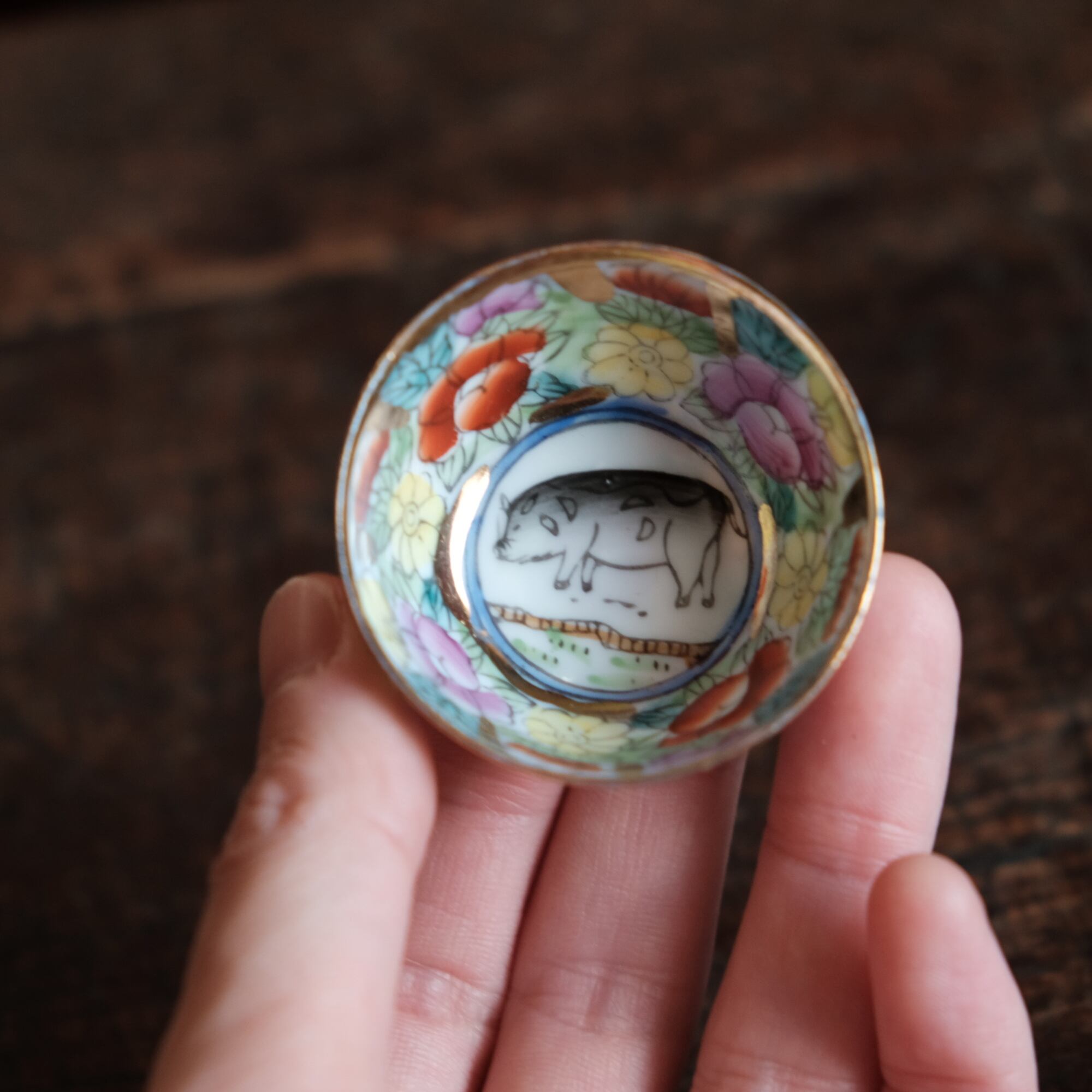 見込みに豚(亥)◆チャイナレトロで可愛い。中国出品 干支 色絵金彩小ぶり猪口 花尽くし。シノワズリ b3