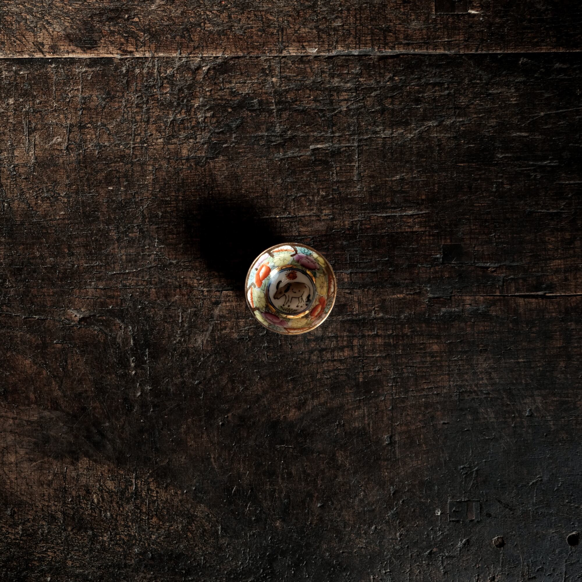 見込みに牛(丑)◆チャイナレトロで可愛い。中国出品 干支 色絵金彩小ぶり猪口 花尽くし。シノワズリ b3