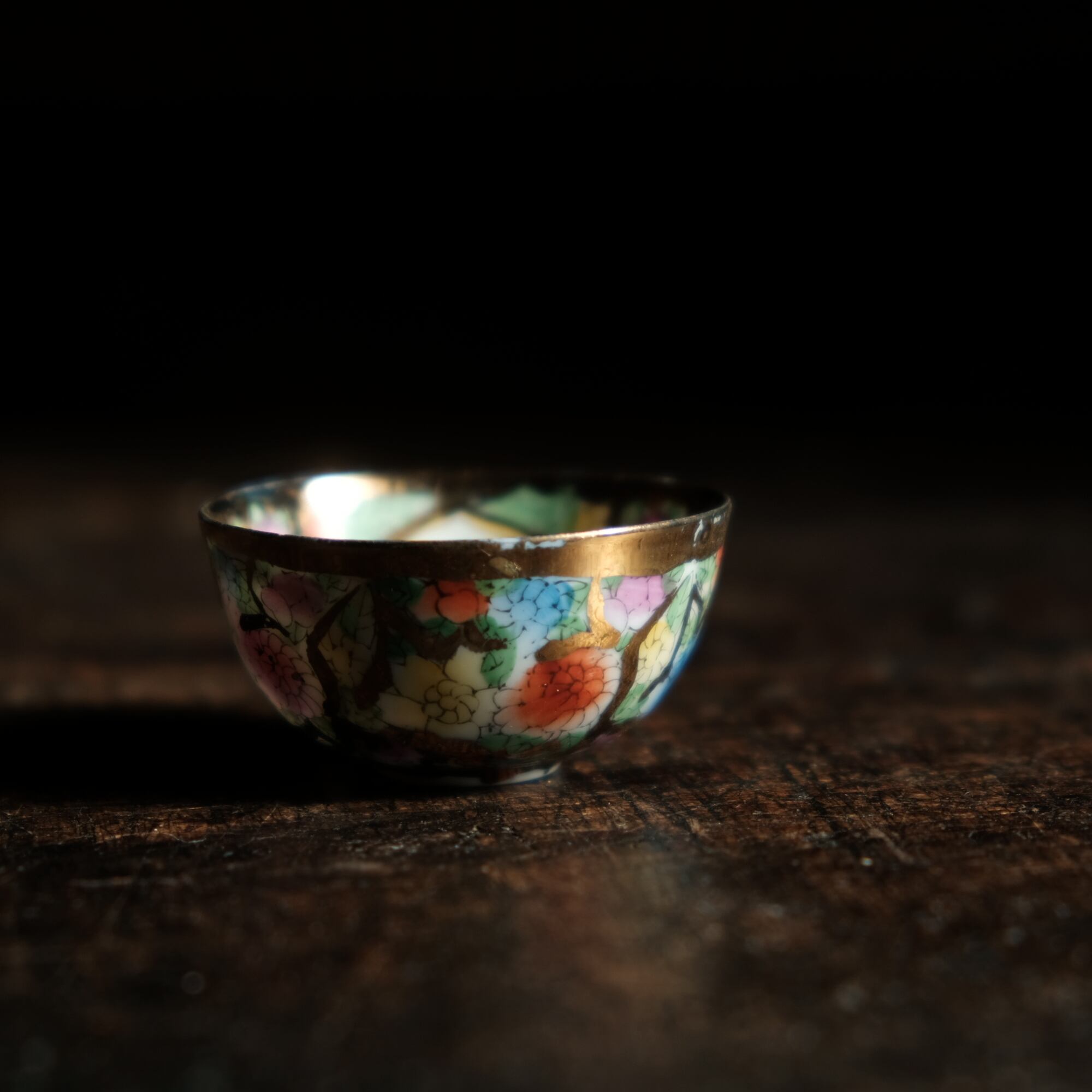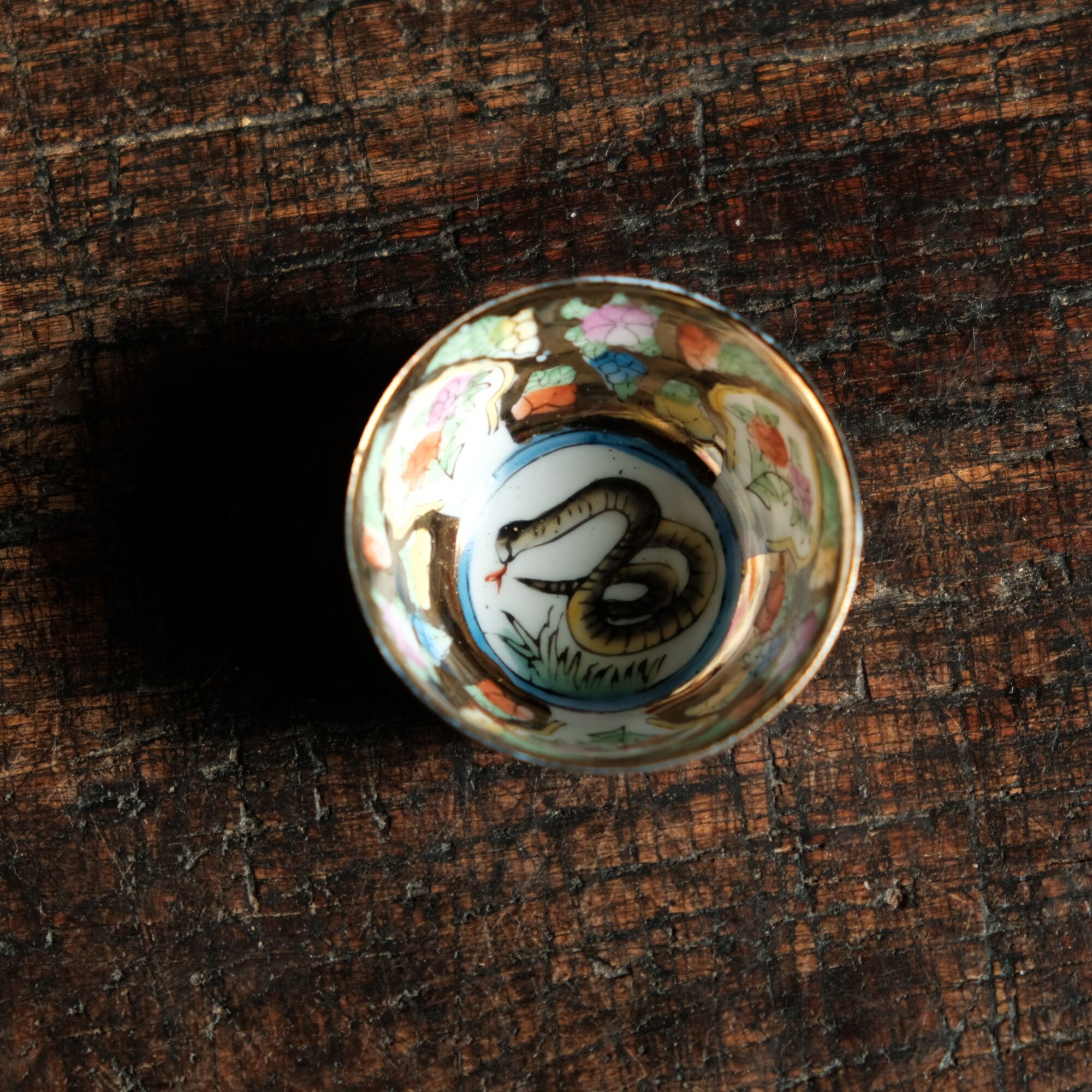 見込みに蛇(巳)◆チャイナレトロで可愛い。中国産 干支 色絵金彩小ぶり猪口 花尽くし。シノワズリ b4
