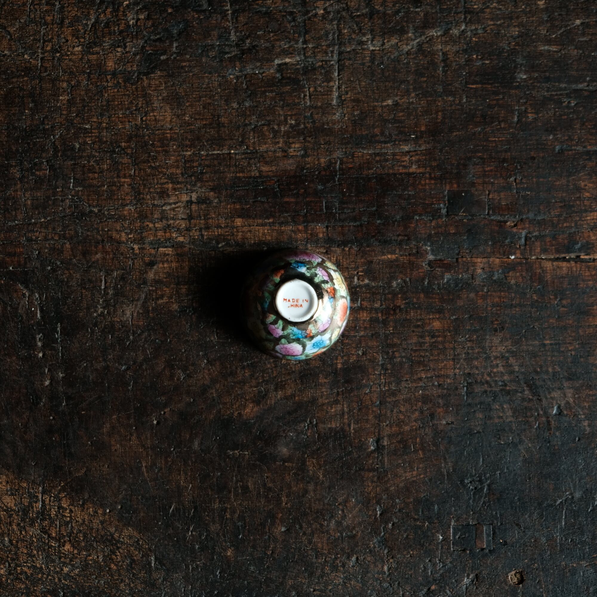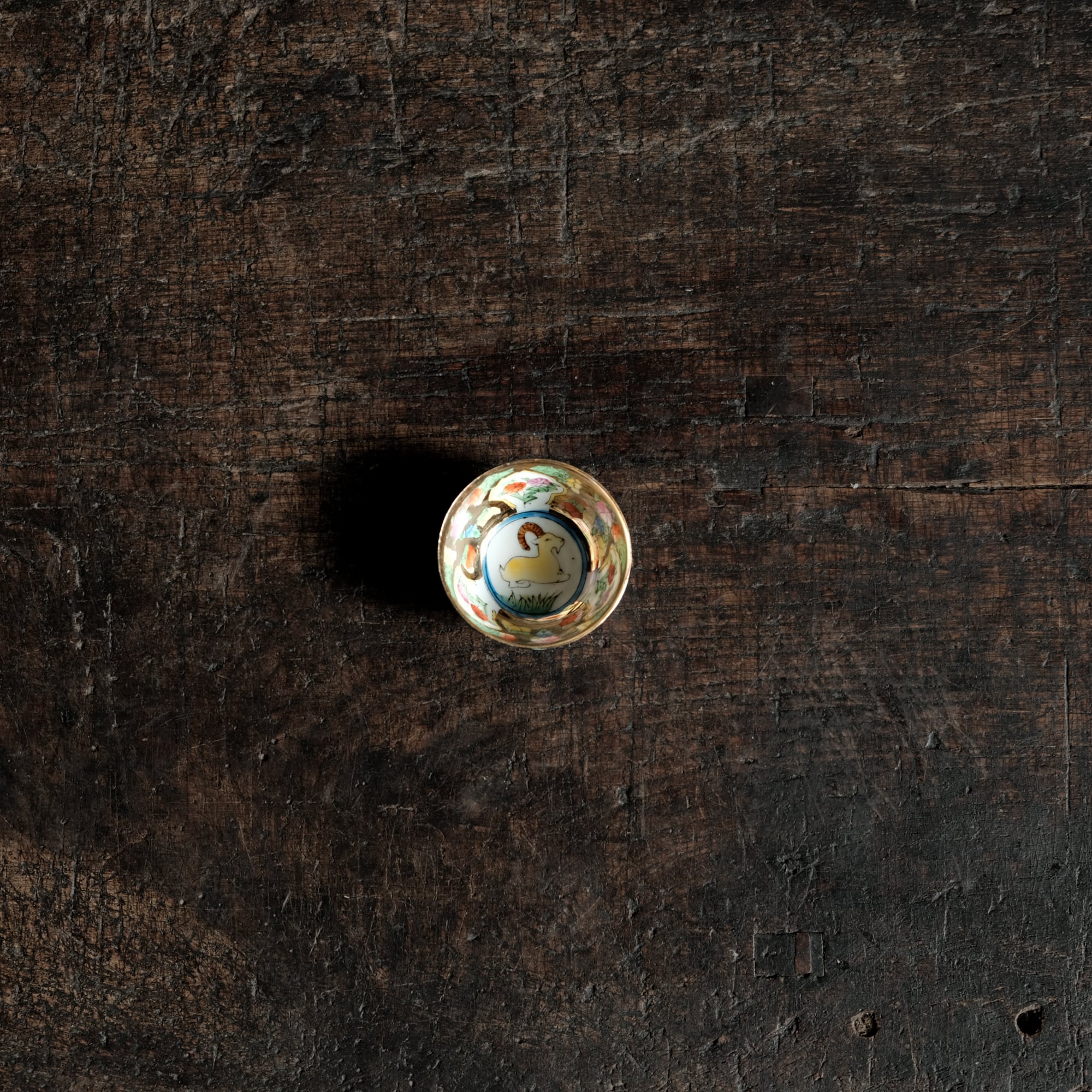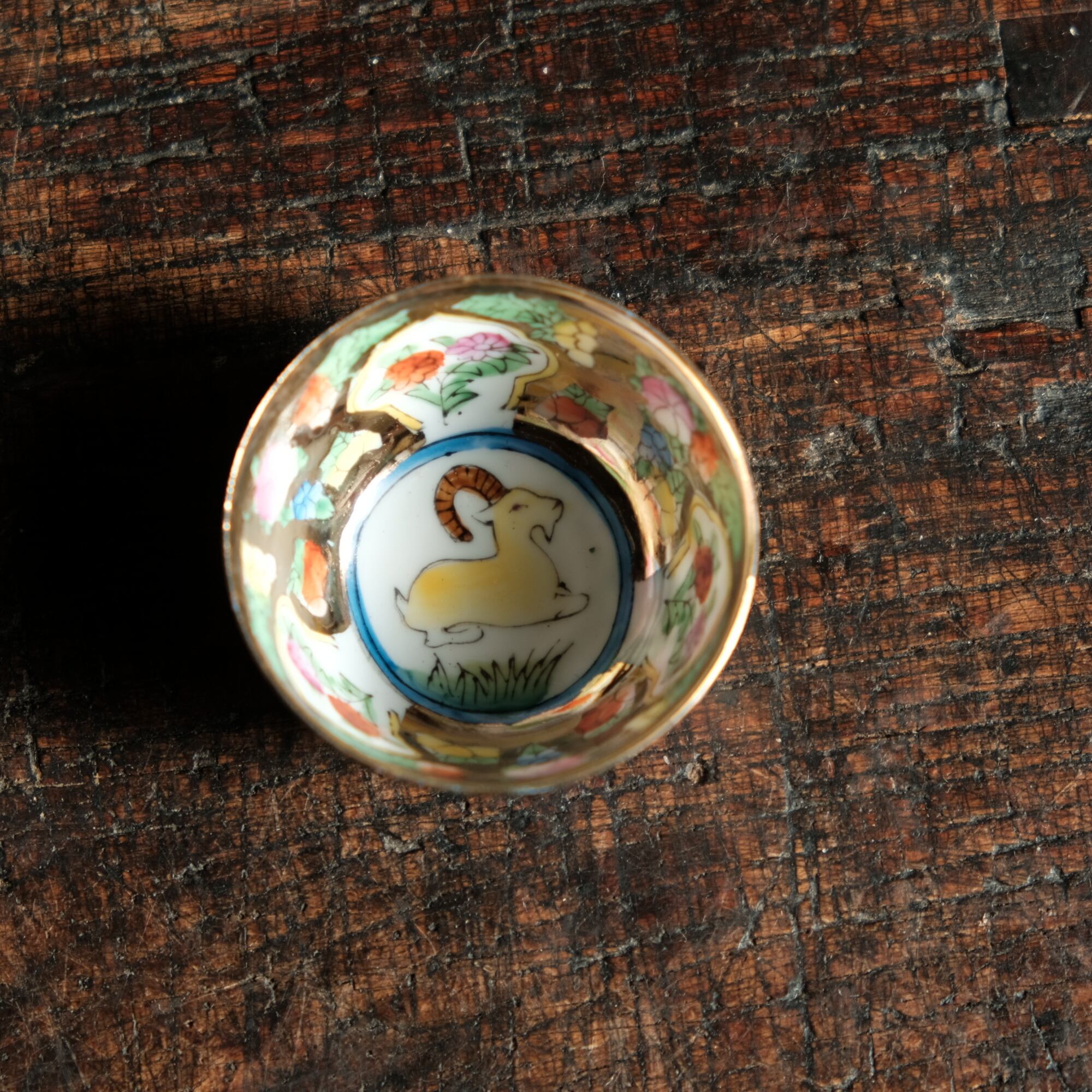 見込みに山羊(未)◆チャイナレトロで可愛い。中国産 干支 色絵金彩小ぶり猪口 花尽くし。シノワズリ b4