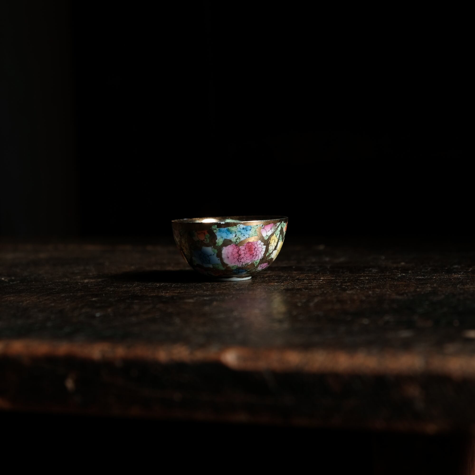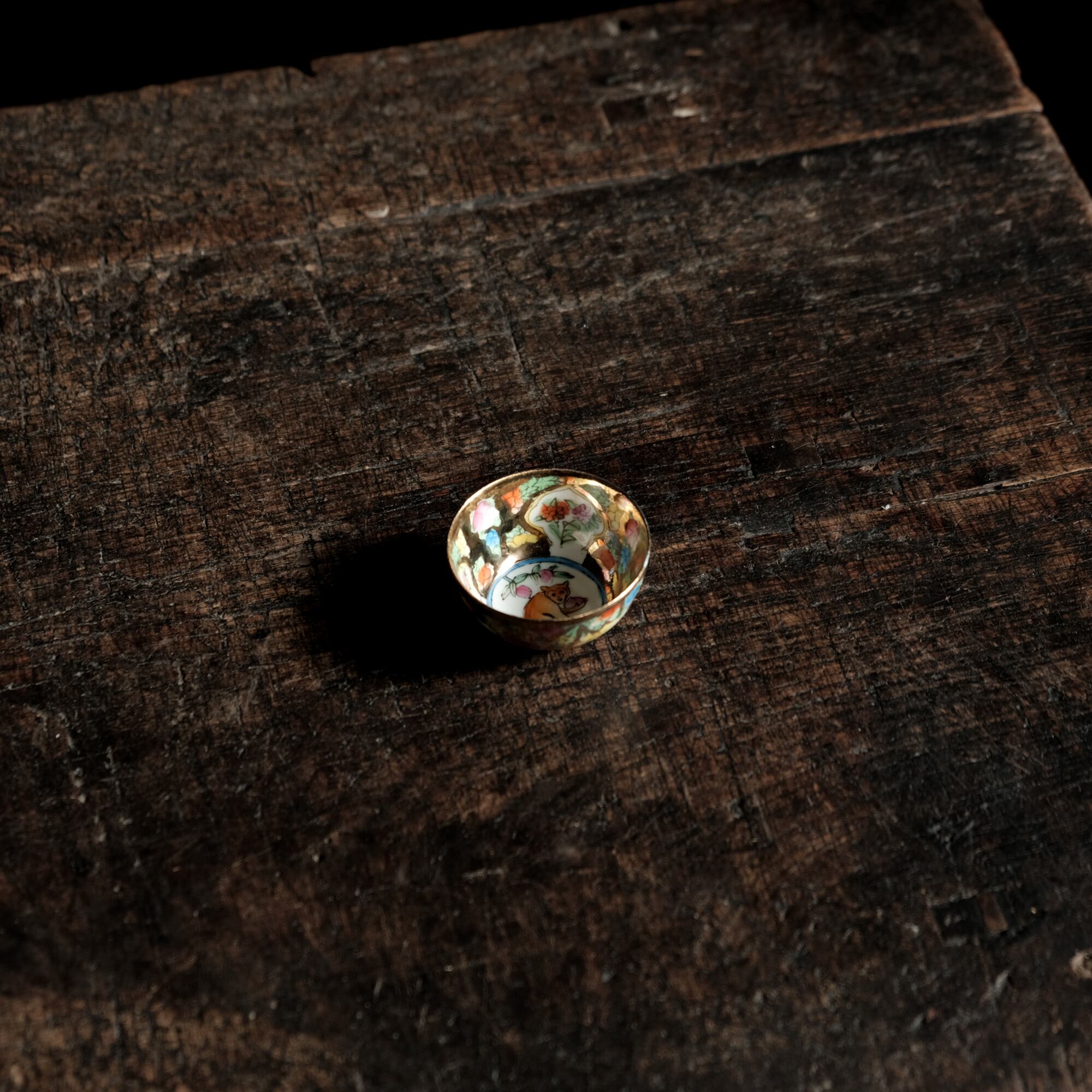 見込みに猿(申)◆チャイナレトロで可愛い。中国産 干支 色絵金彩小ぶり猪口 花尽くし。シノワズリ b4