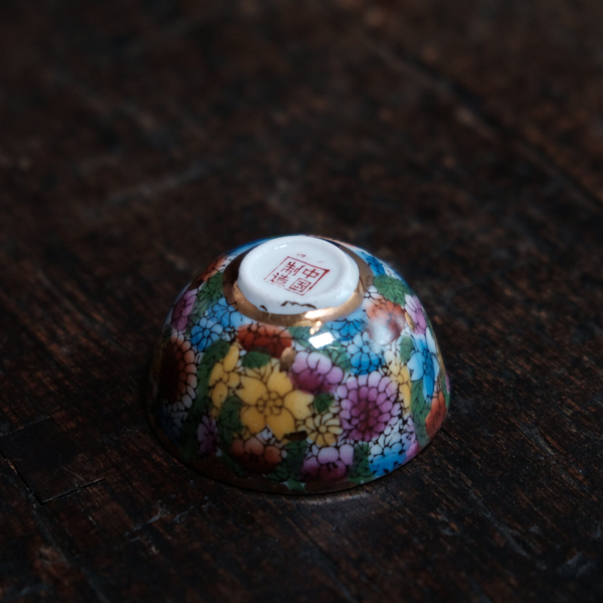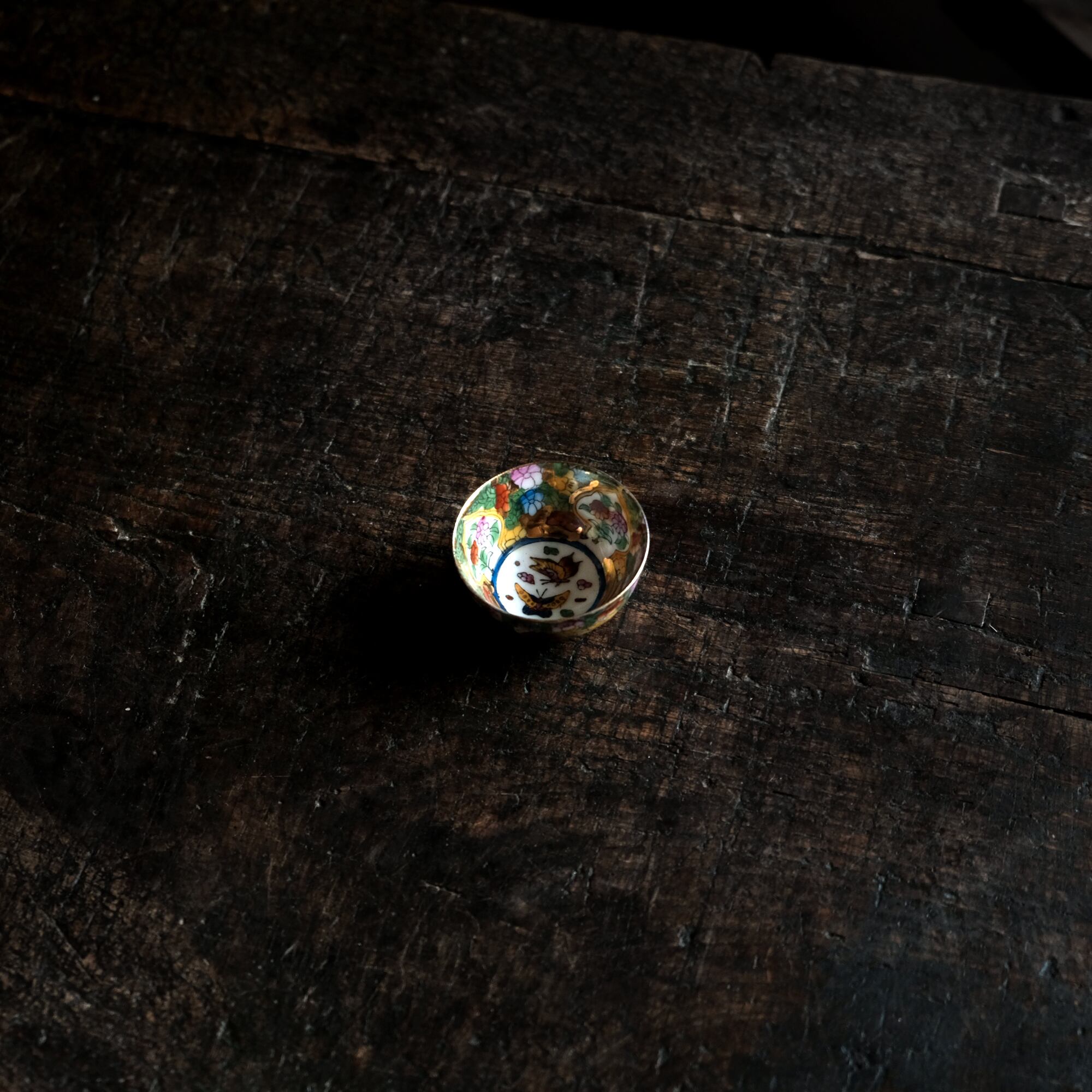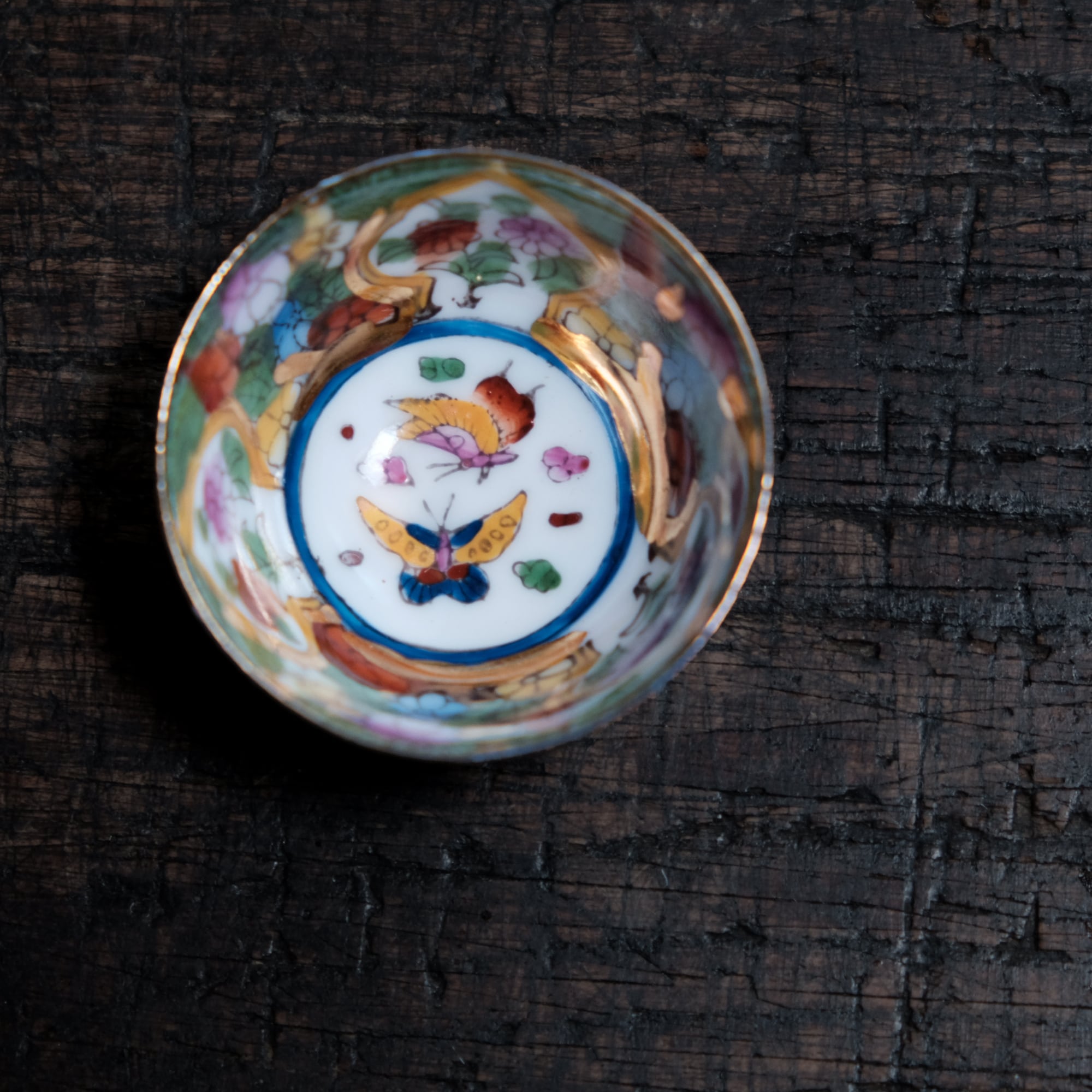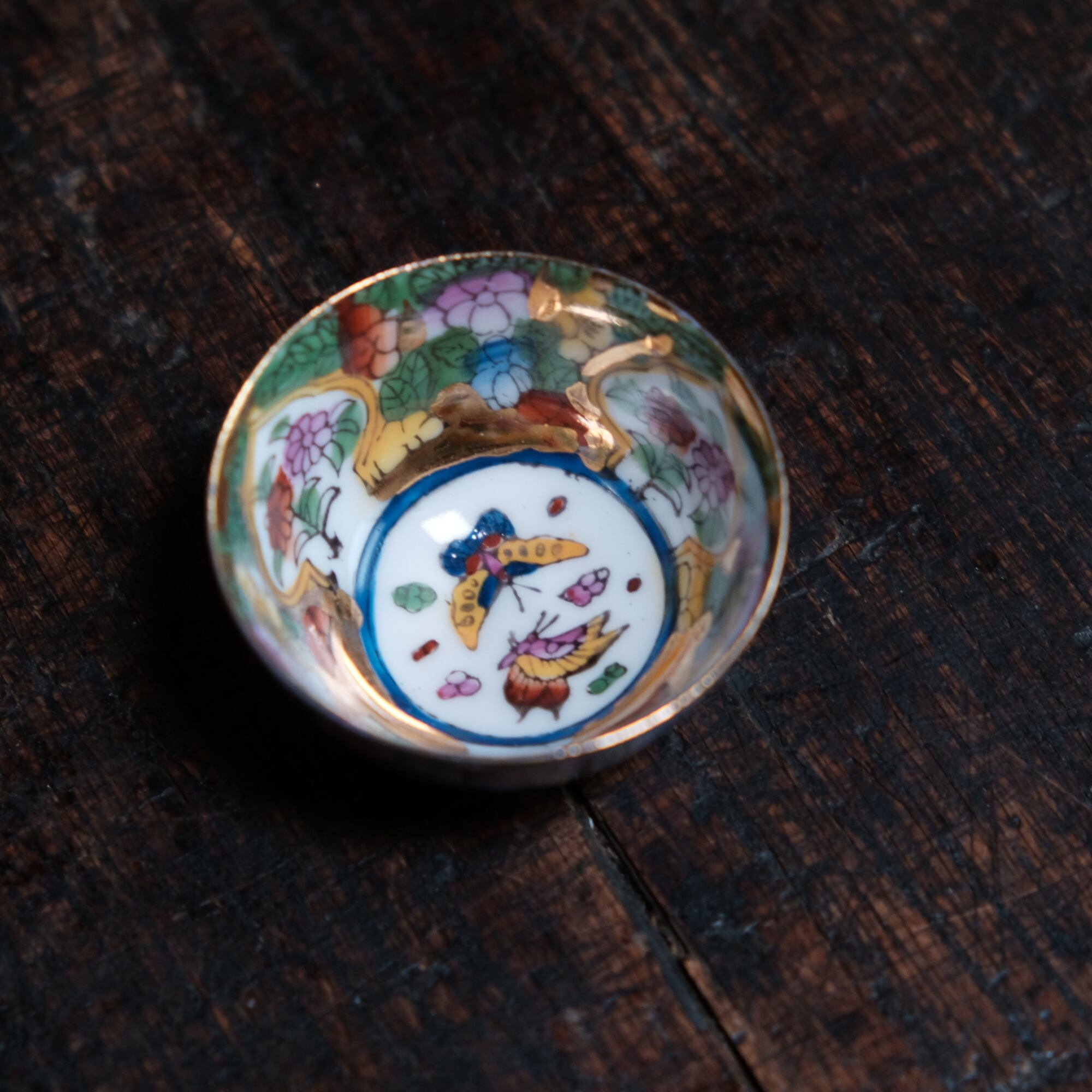 見込みに蝶々◆花や果実。中国景徳鎮 色絵金彩小ぶり猪口 茶杯 カラフル チャイナレトロ シノワズリ 工芸品