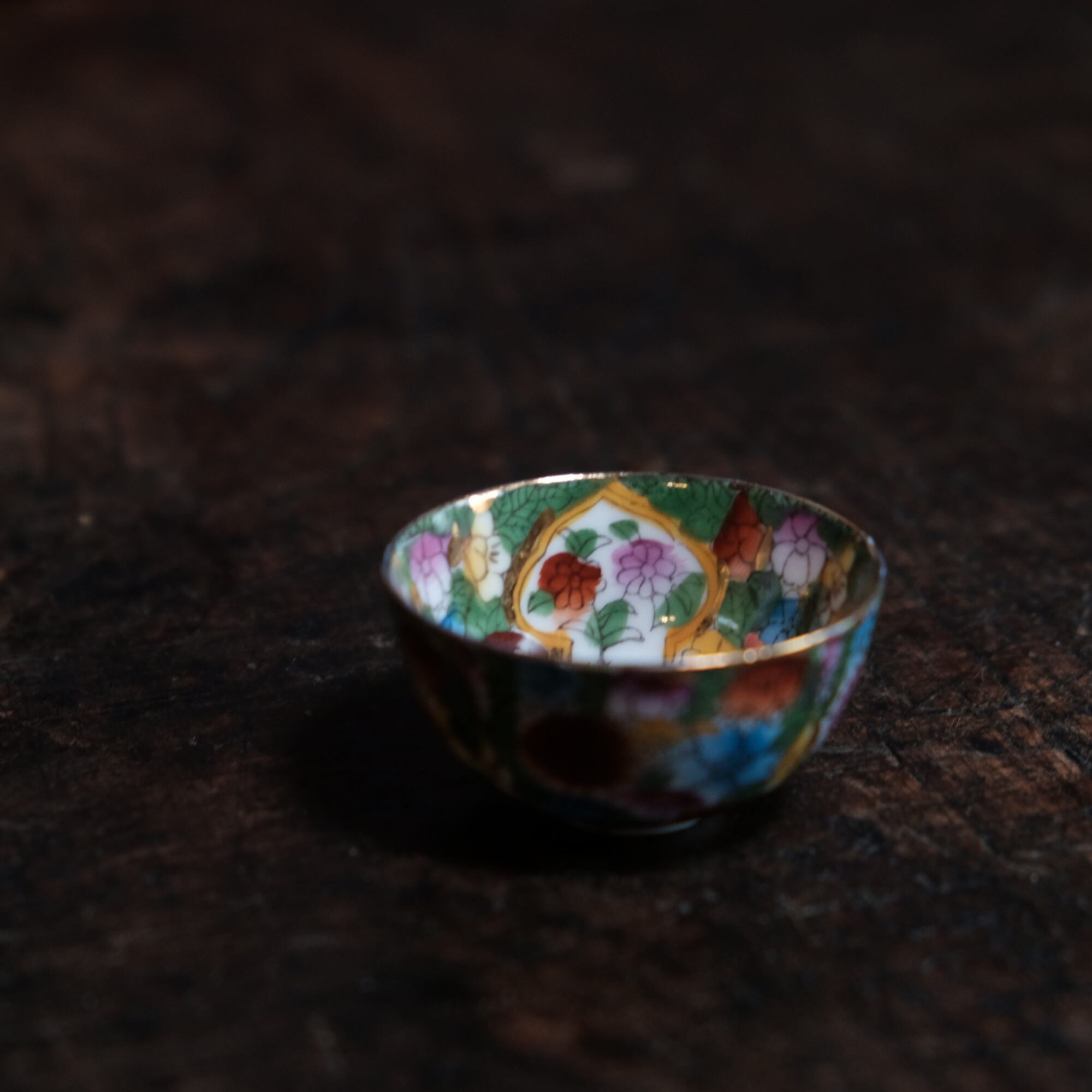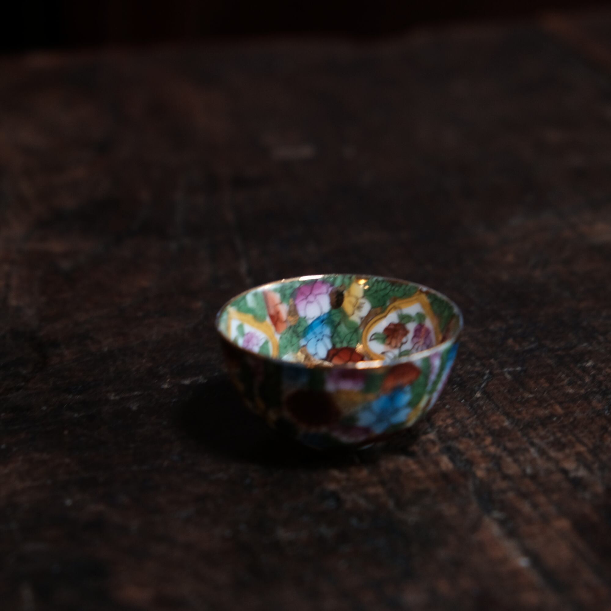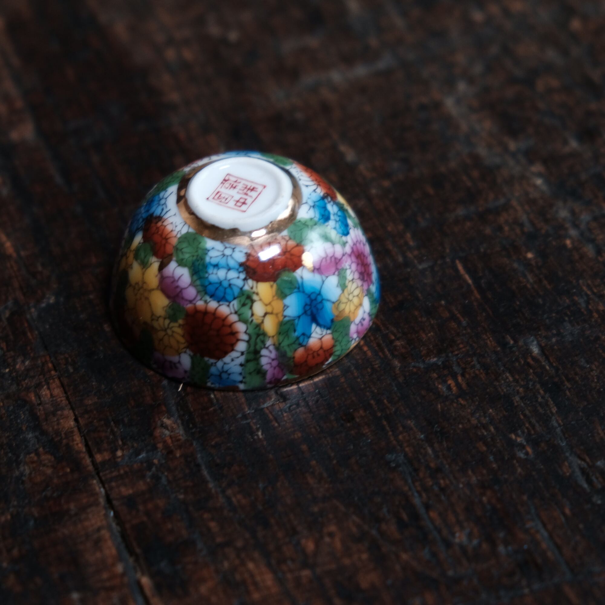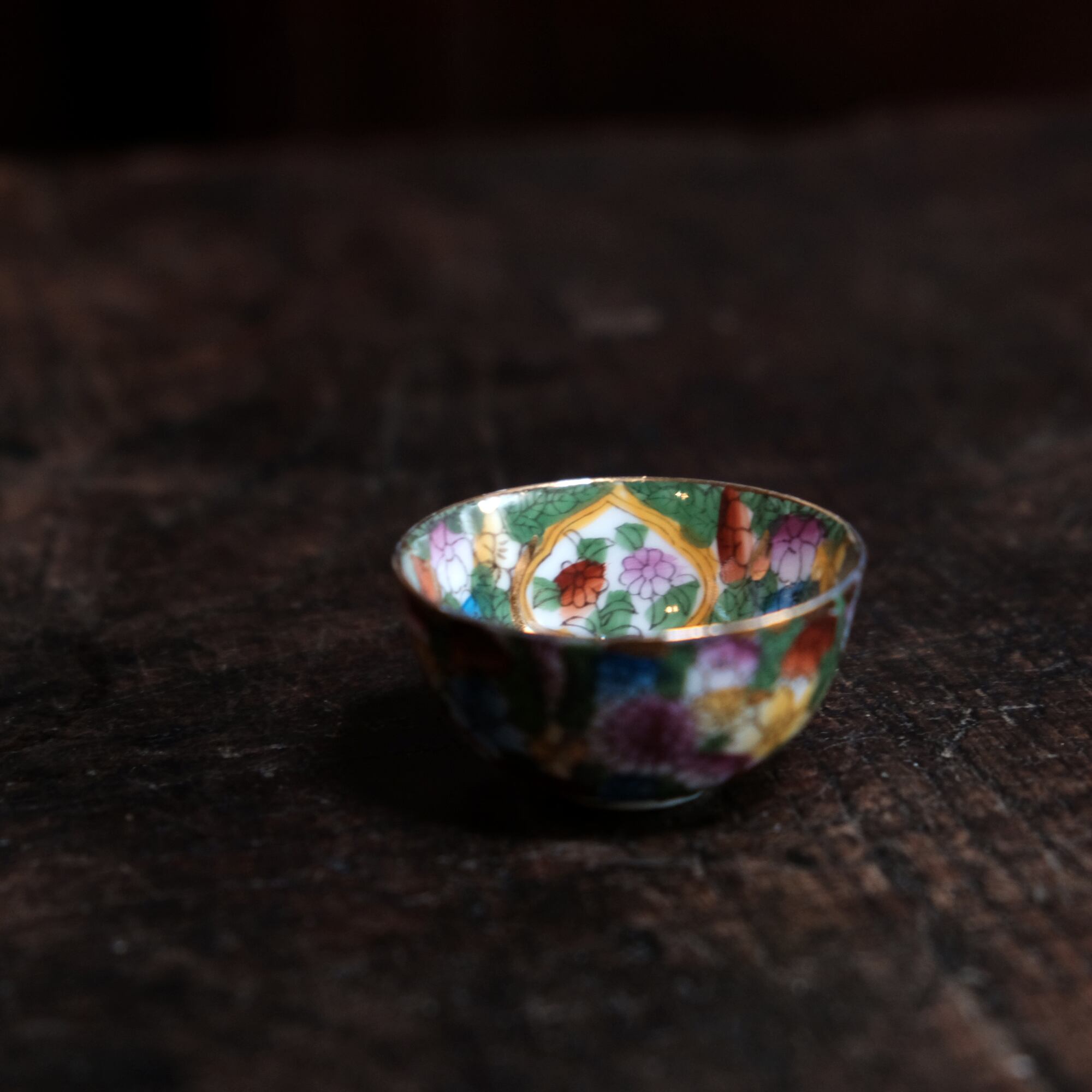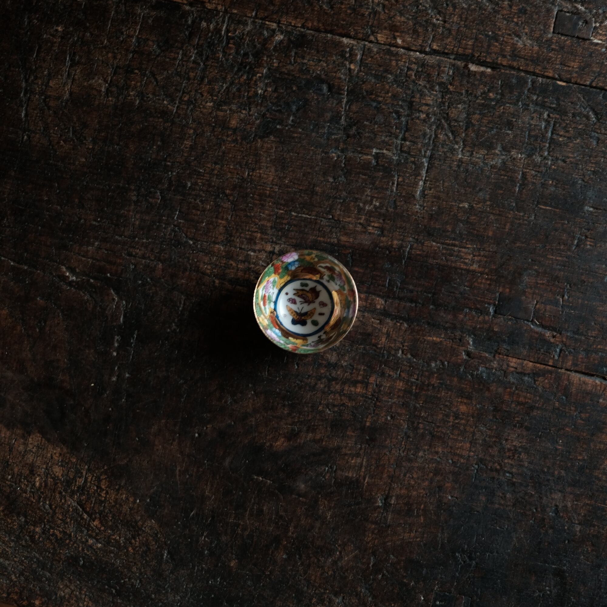 見込みに蝶々◆花や果実。中国景徳鎮 色絵金彩小ぶり猪口 茶杯 カラフル チャイナレトロ シノワズリ 工芸品