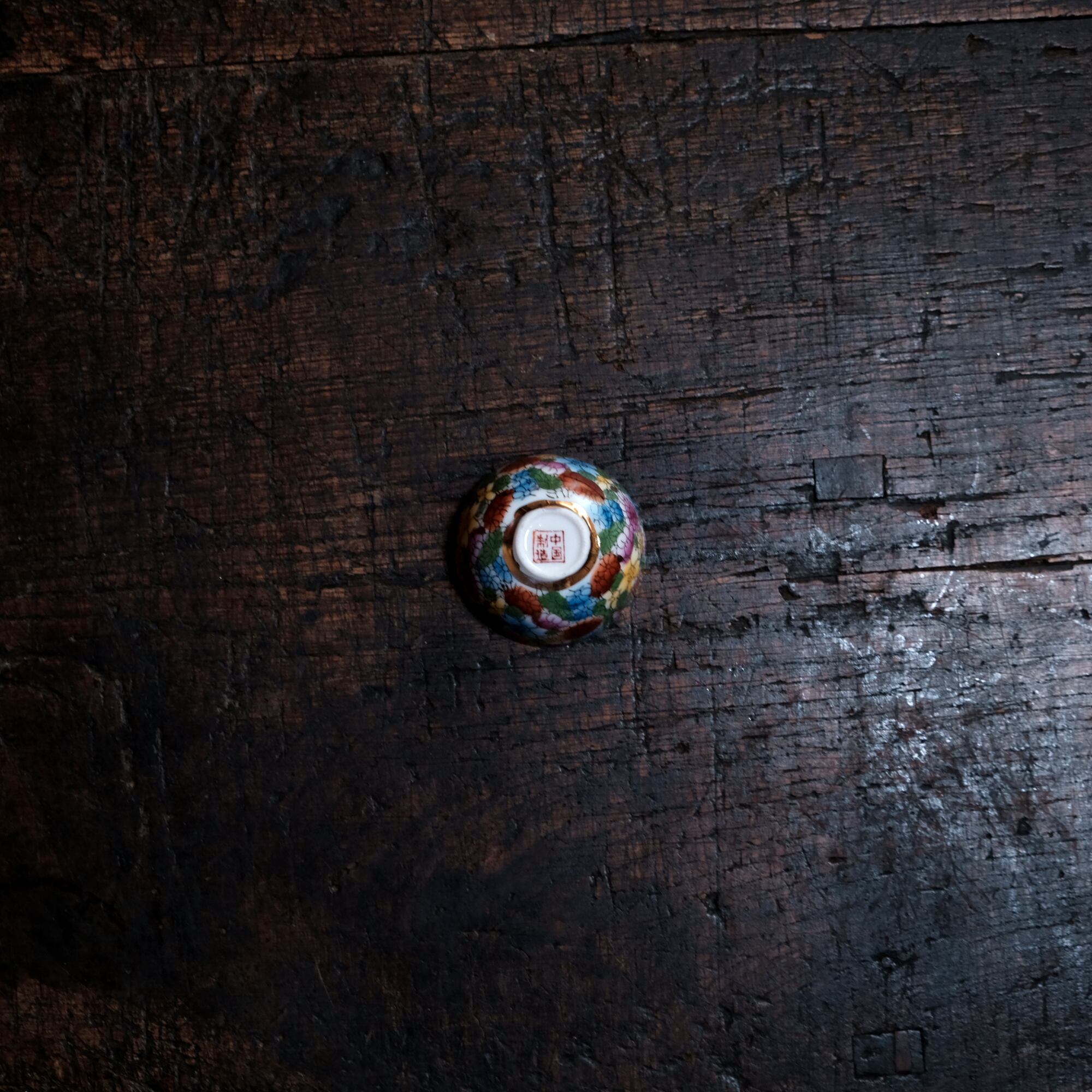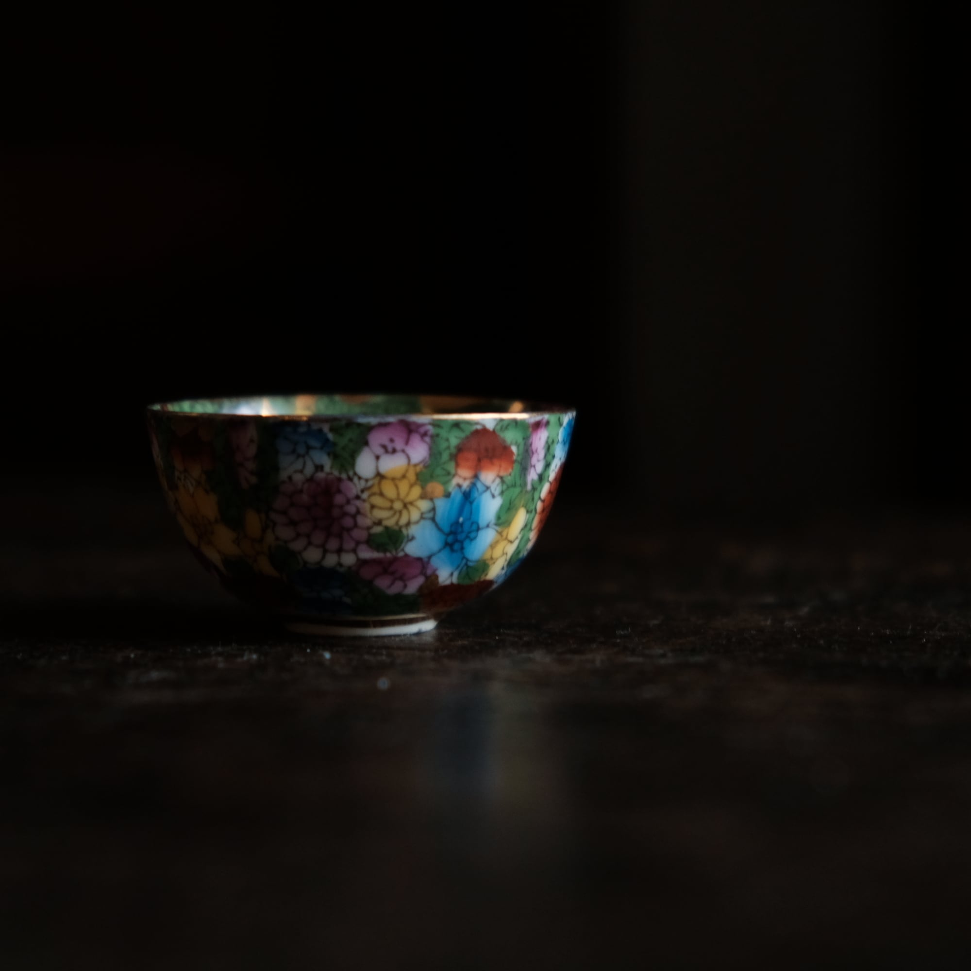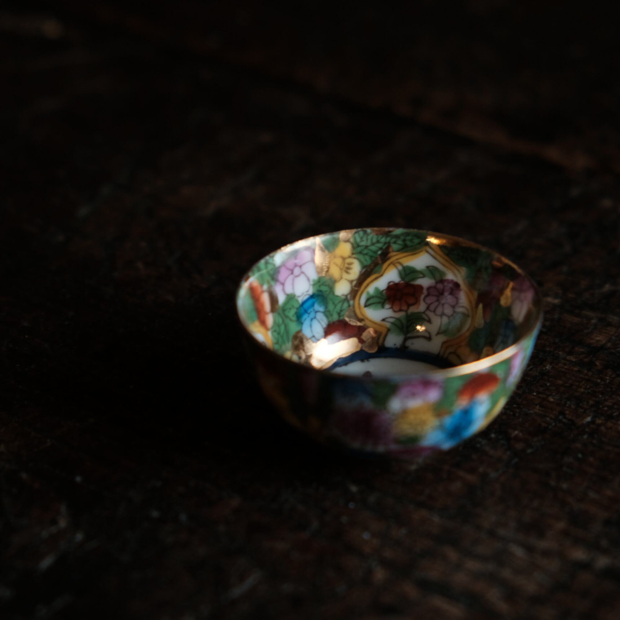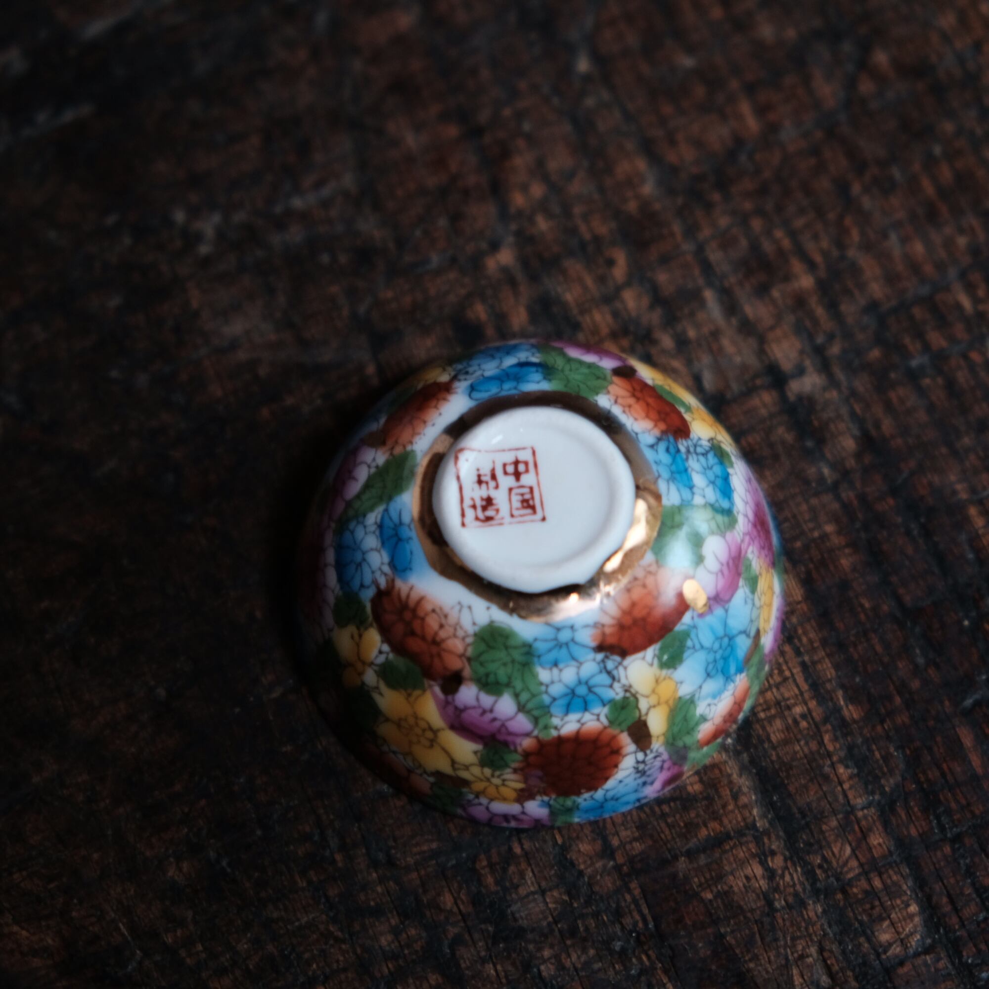 見込みに蝶々◆花や果実。中国景徳鎮 色絵金彩小ぶり猪口 茶杯 カラフル チャイナレトロ シノワズリ 工芸品