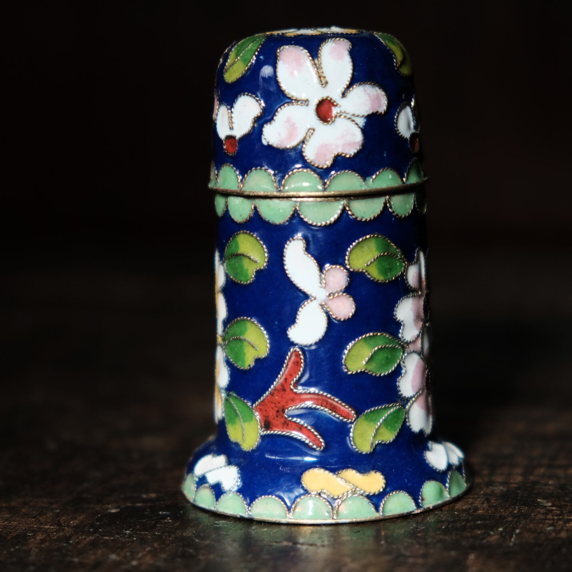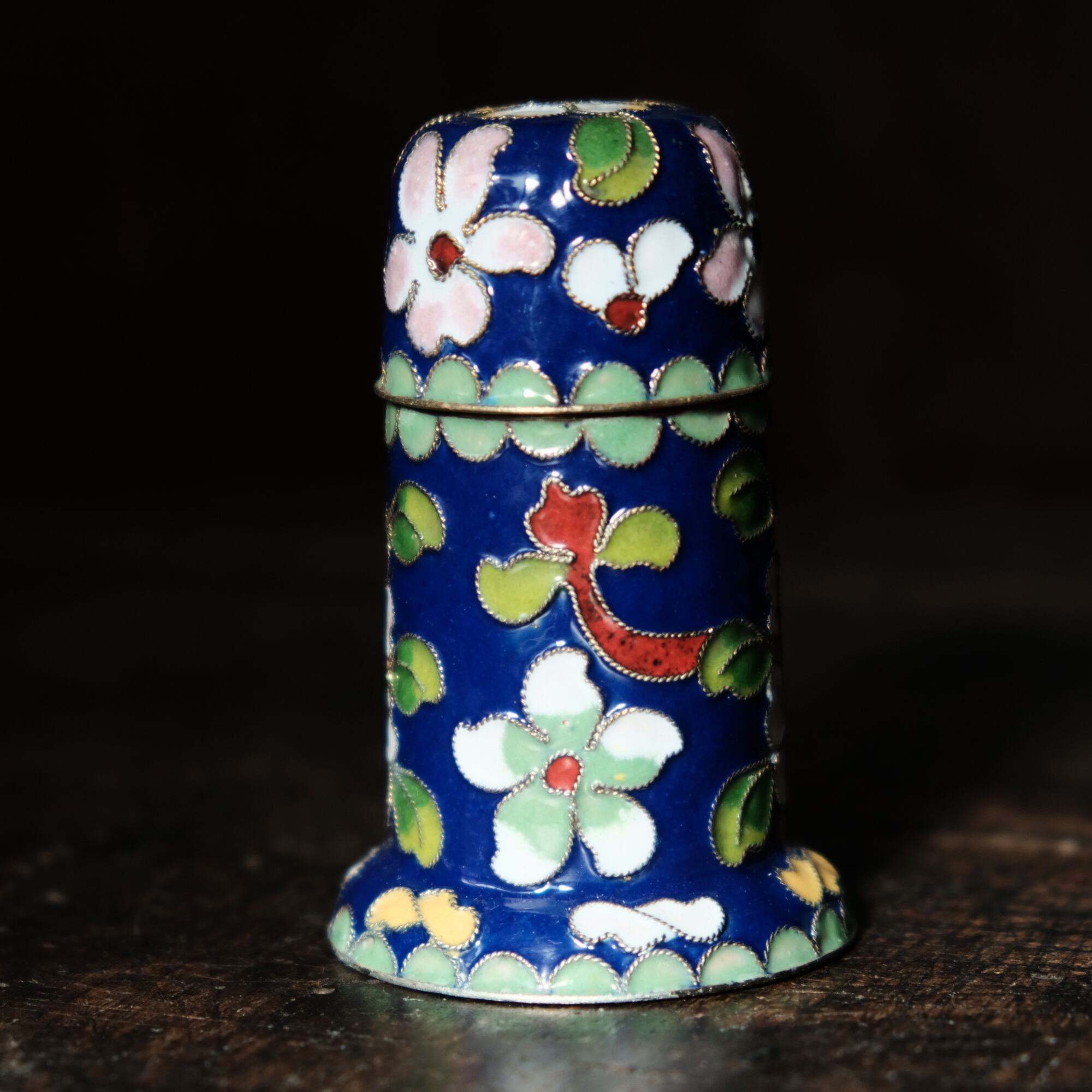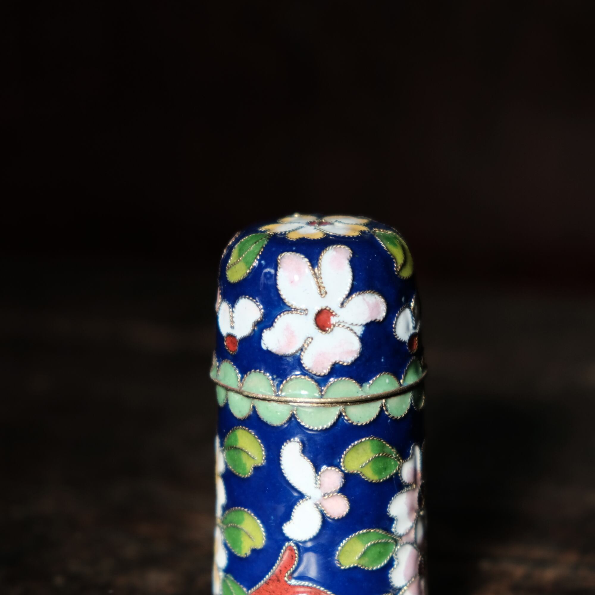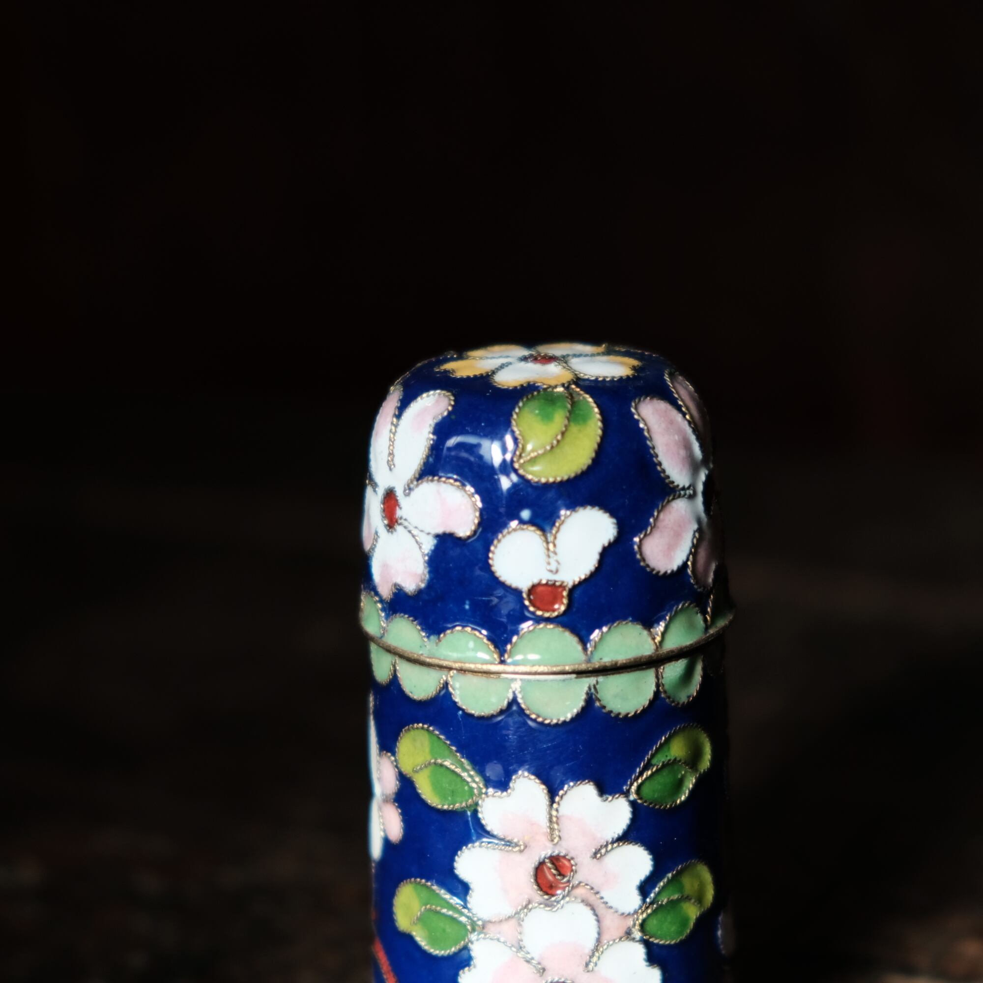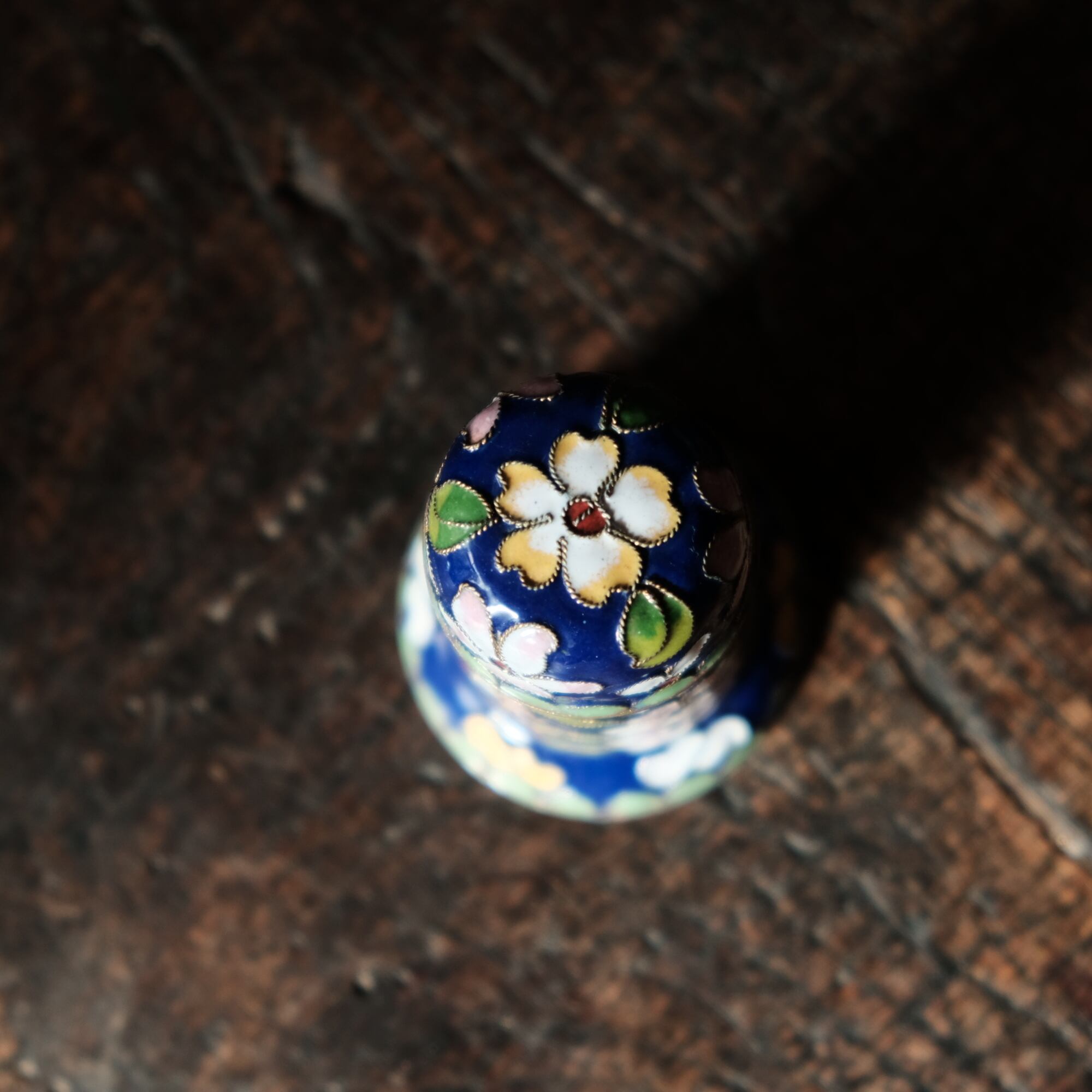 ネイビーに草花◆中国産 七宝焼 小物入れ 楊枝入れ チャイナレトロ シノワズリ インテリアオブジェ