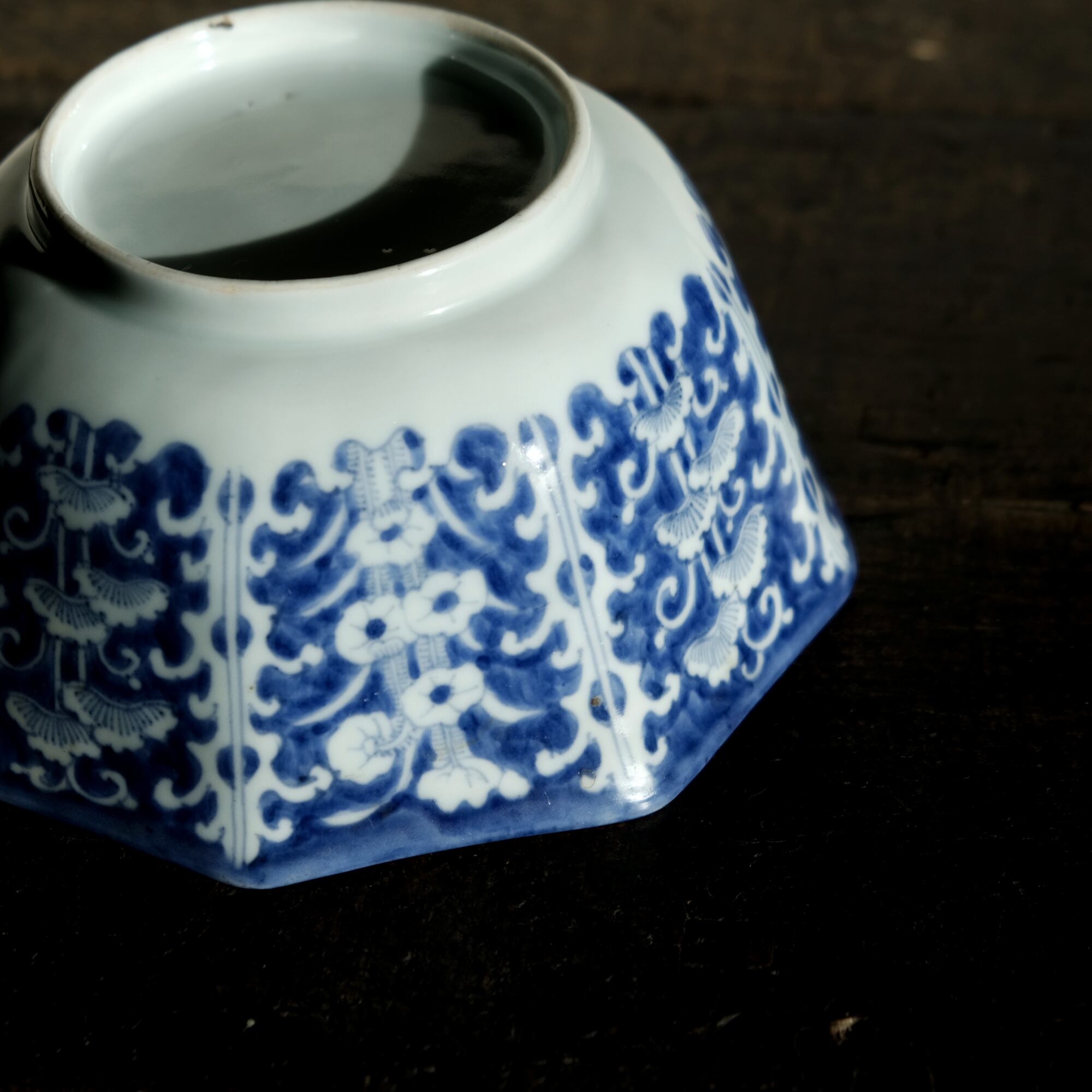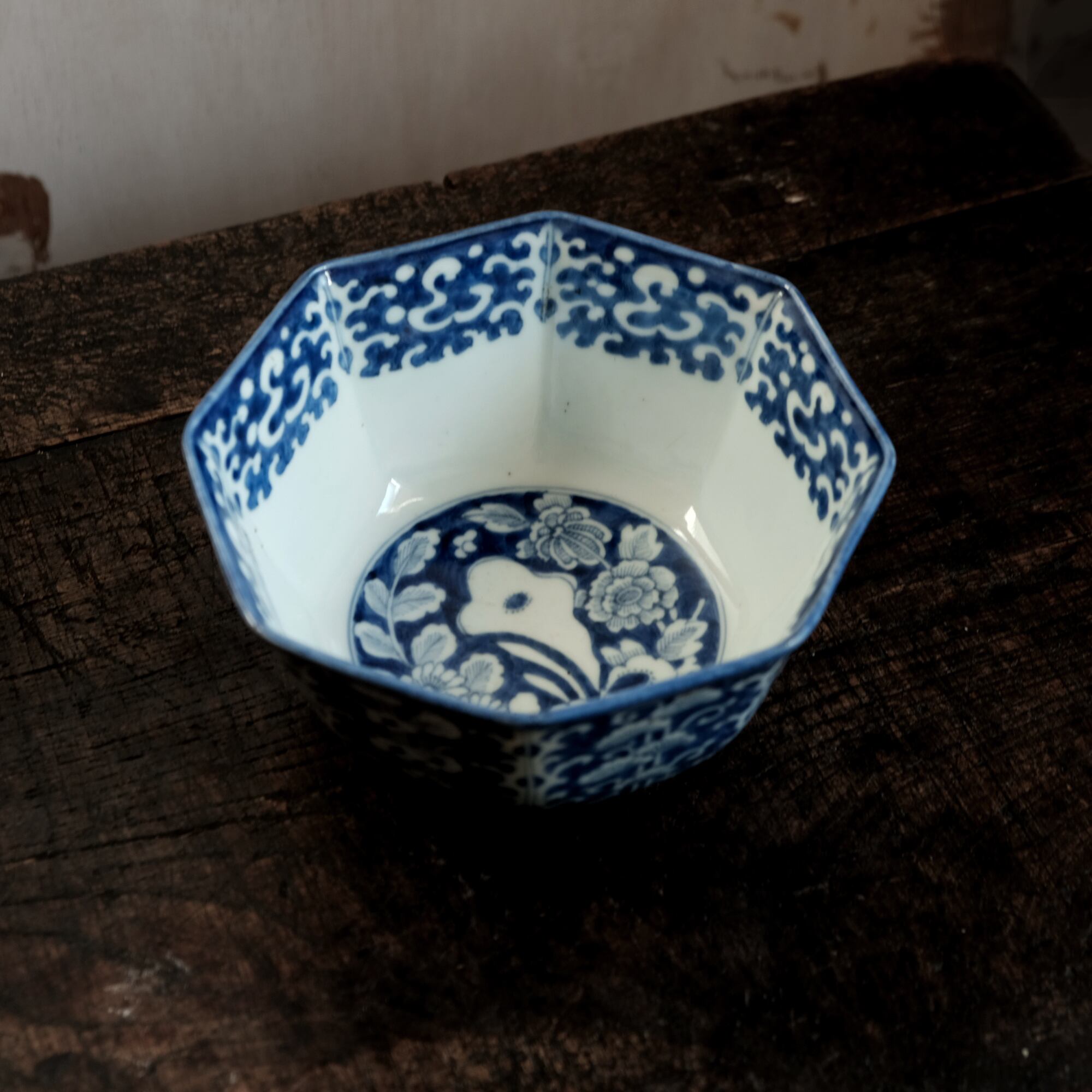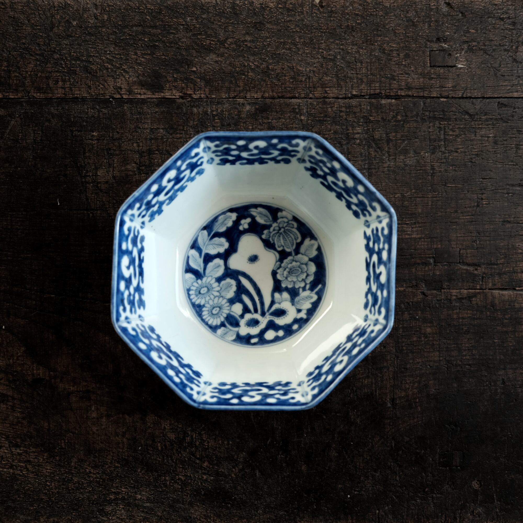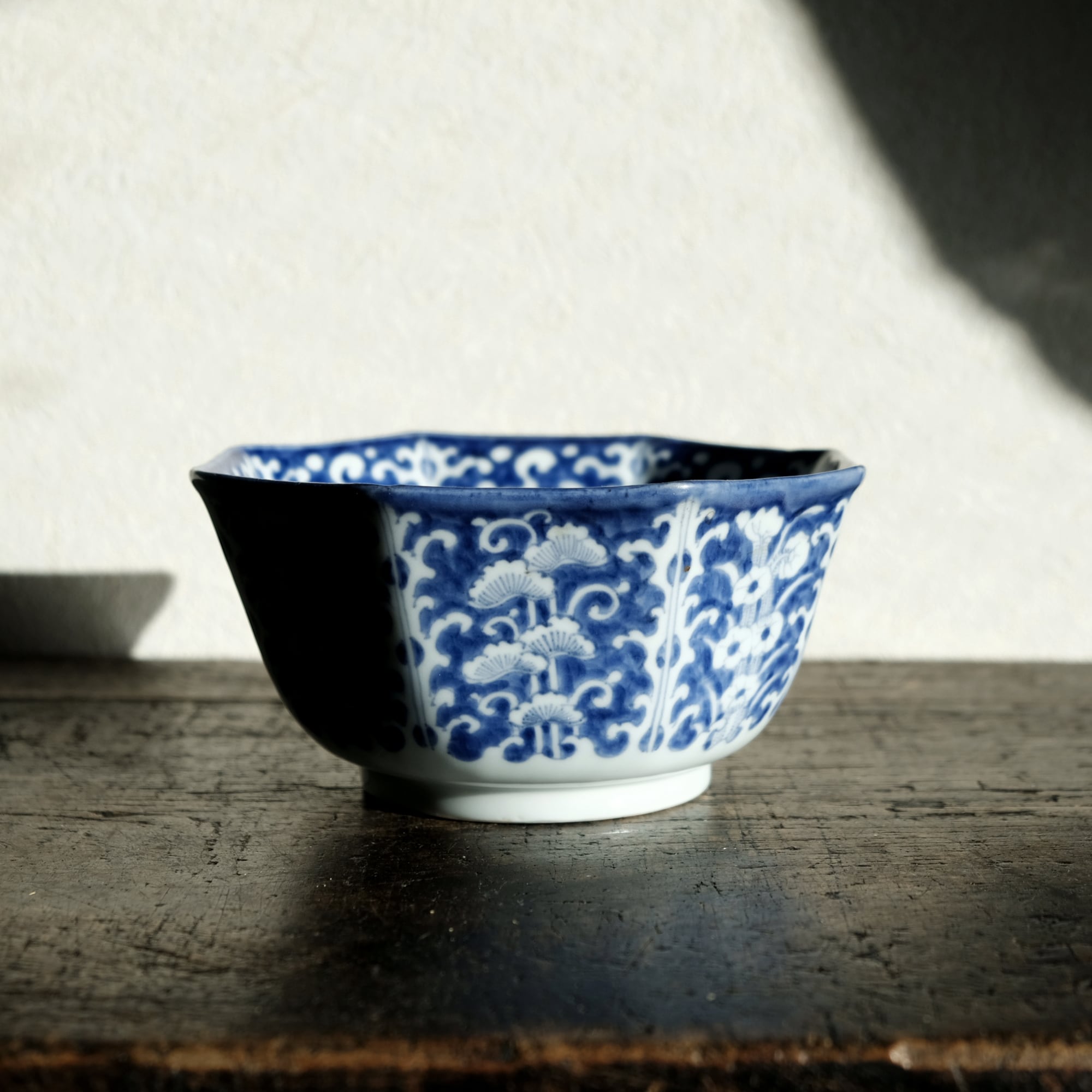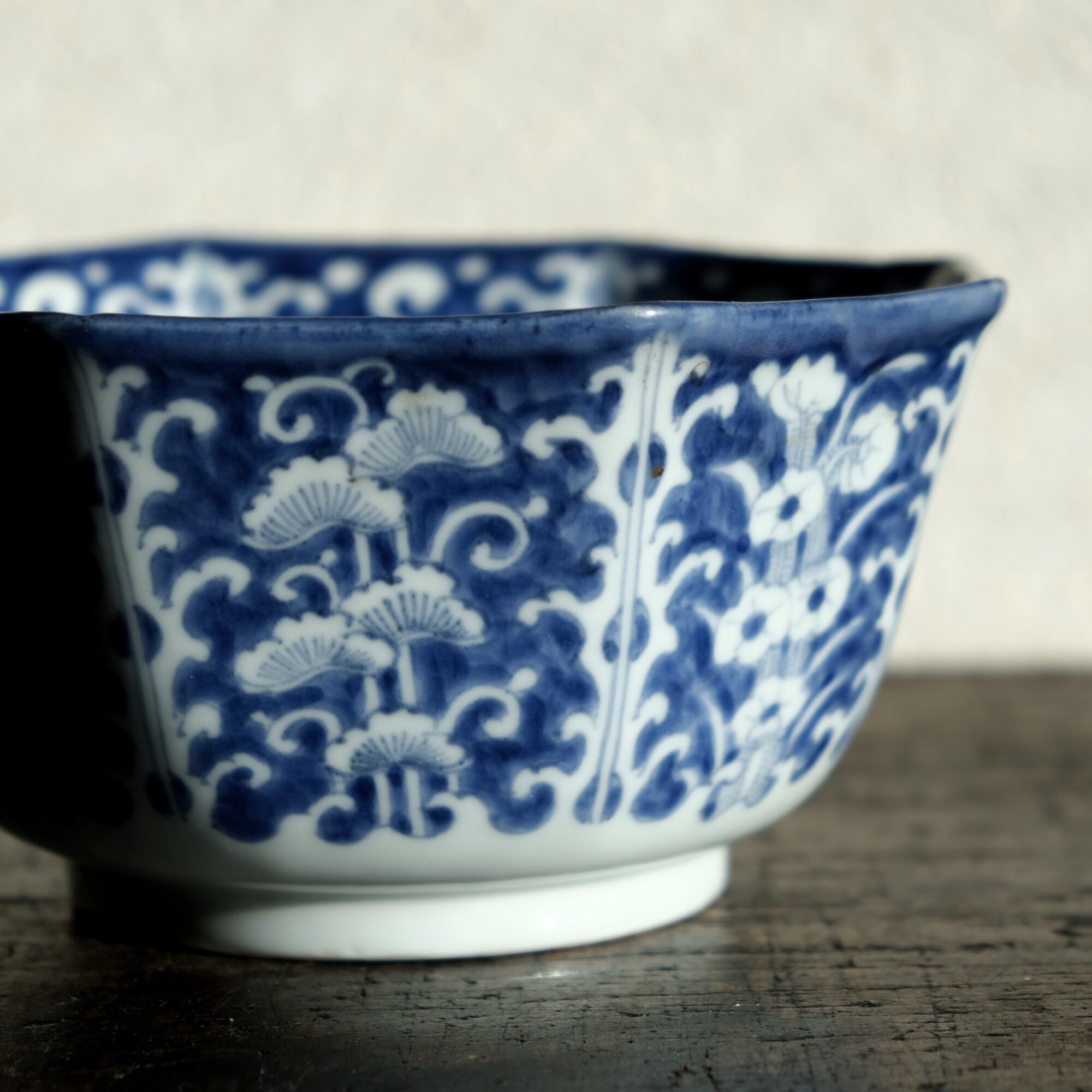 リーフと白波◆八角で素敵。伊万里 草波文染付八角深鉢 骨董・antiques 丁寧な暮らしに。江戸末期