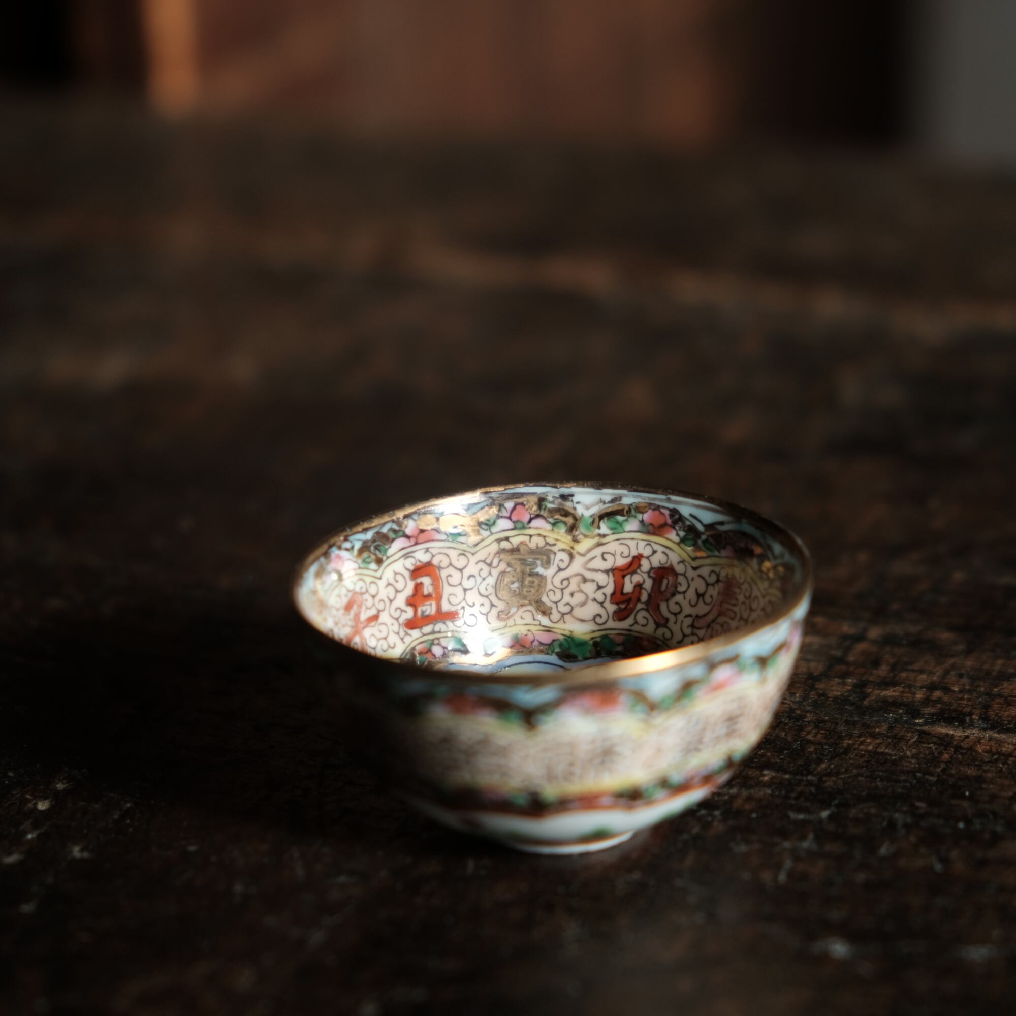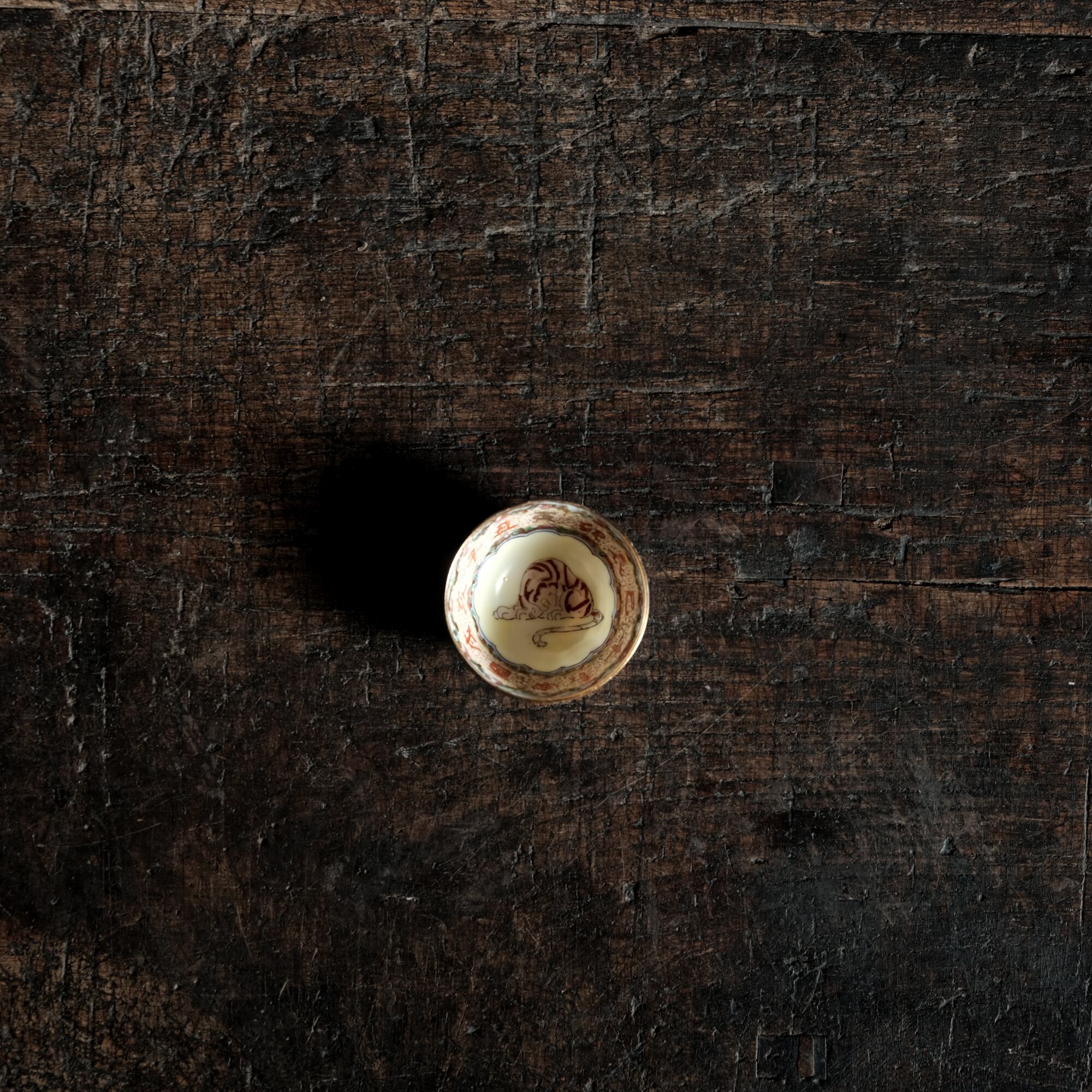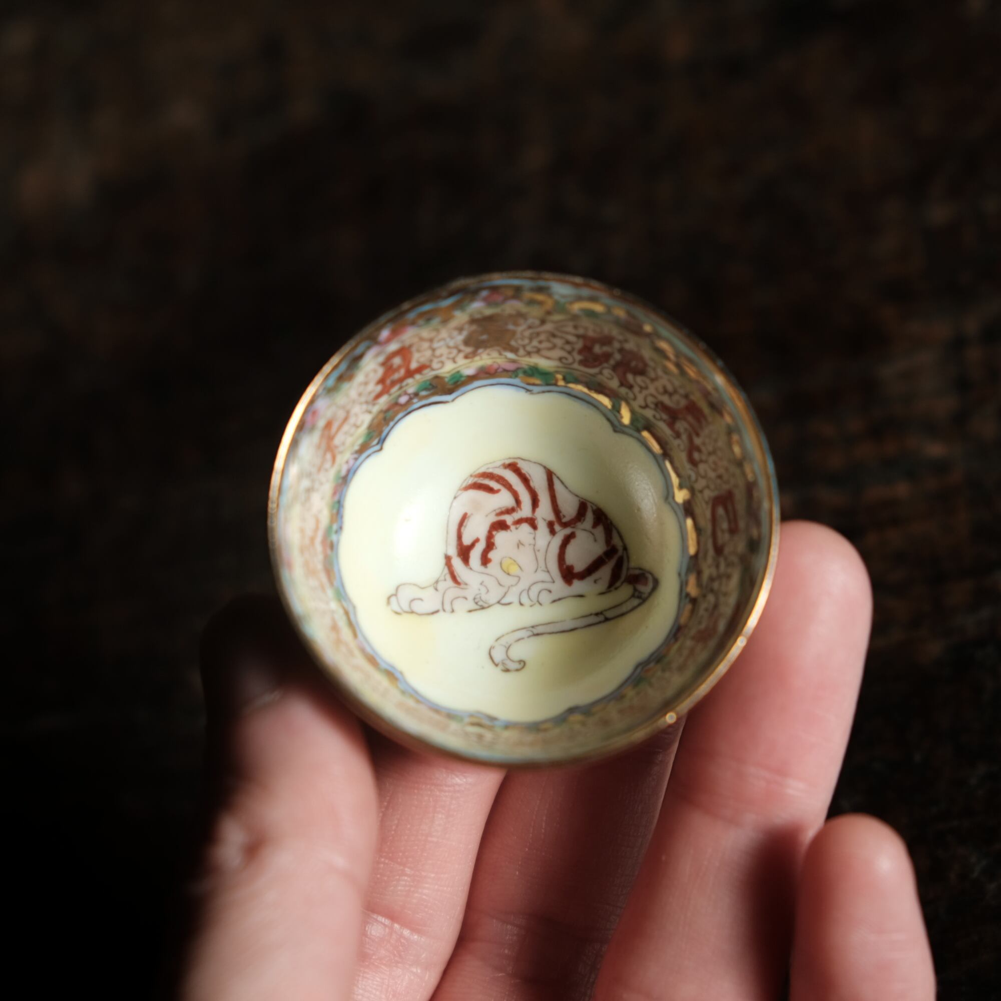 見込みに虎(寅)◆チャイナレトロで可愛い。中国産 干支文赤絵金彩小ぶり猪口 花尽くし。シノワズリ
