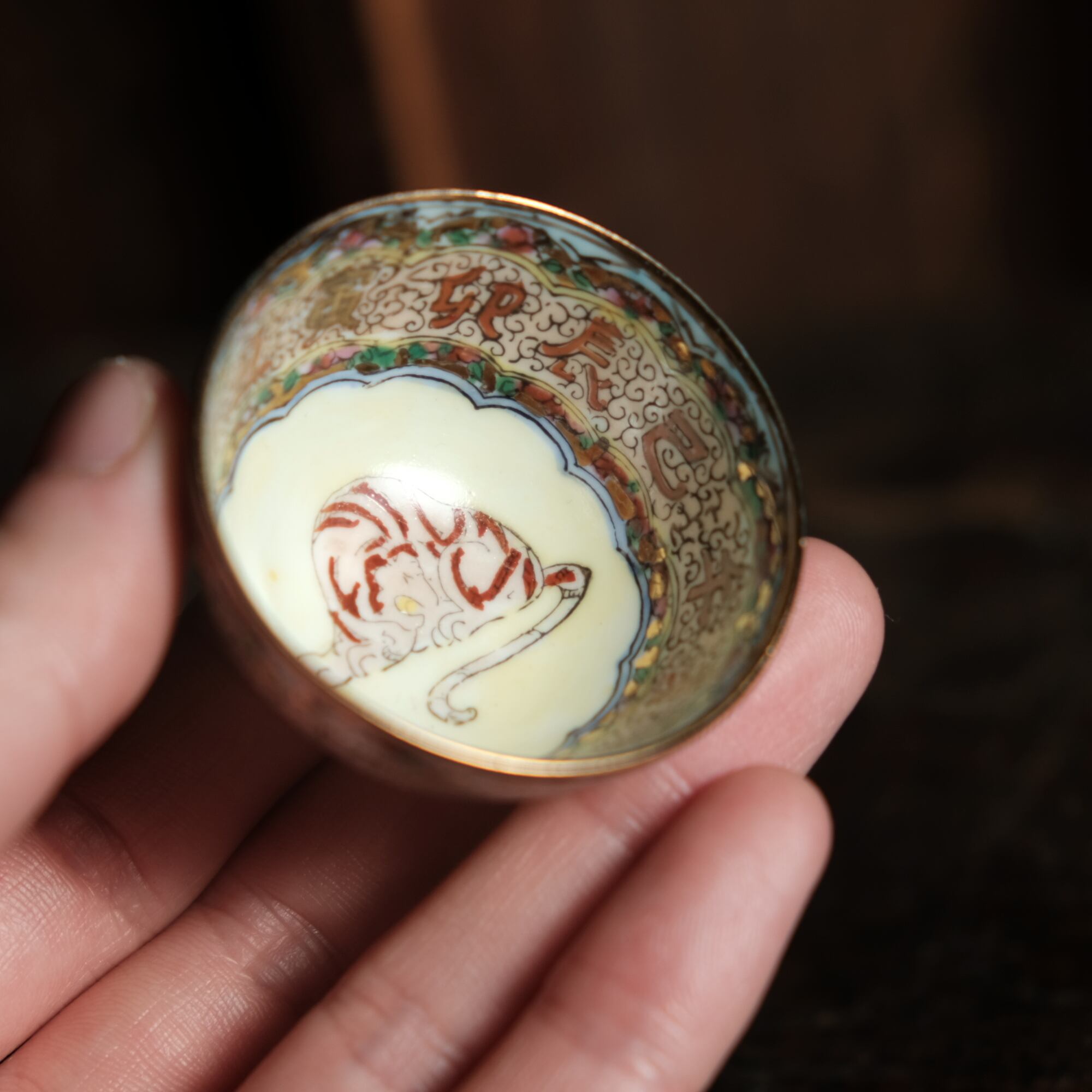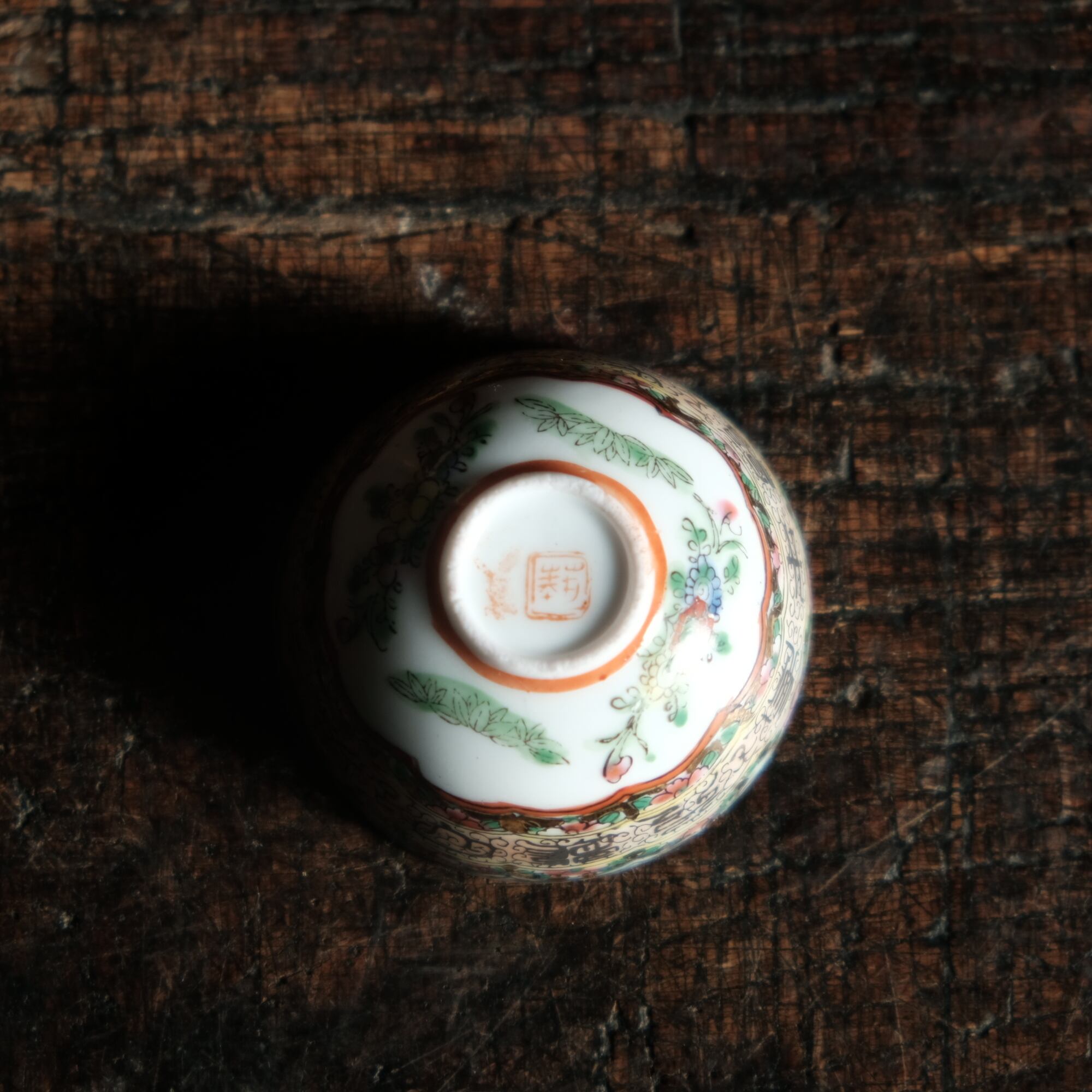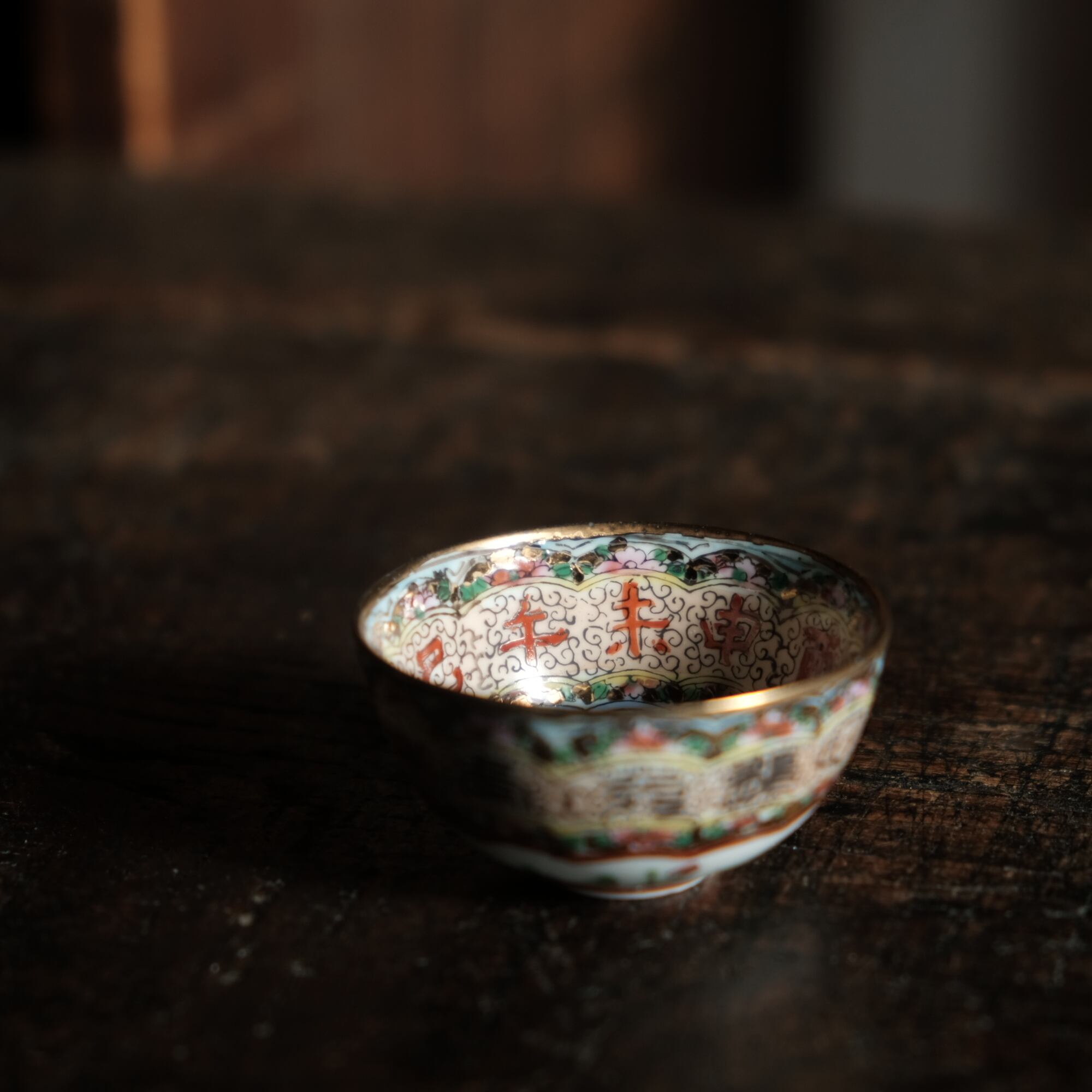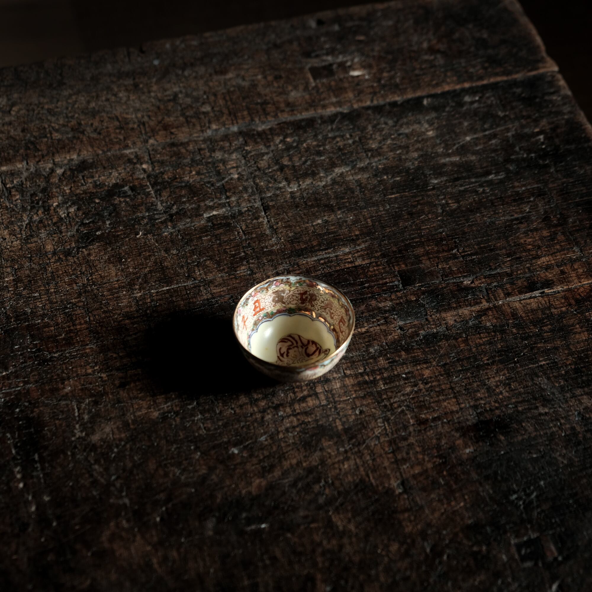 見込みに虎(寅)◆チャイナレトロで可愛い。中国産 干支文赤絵金彩小ぶり猪口 花尽くし。シノワズリ