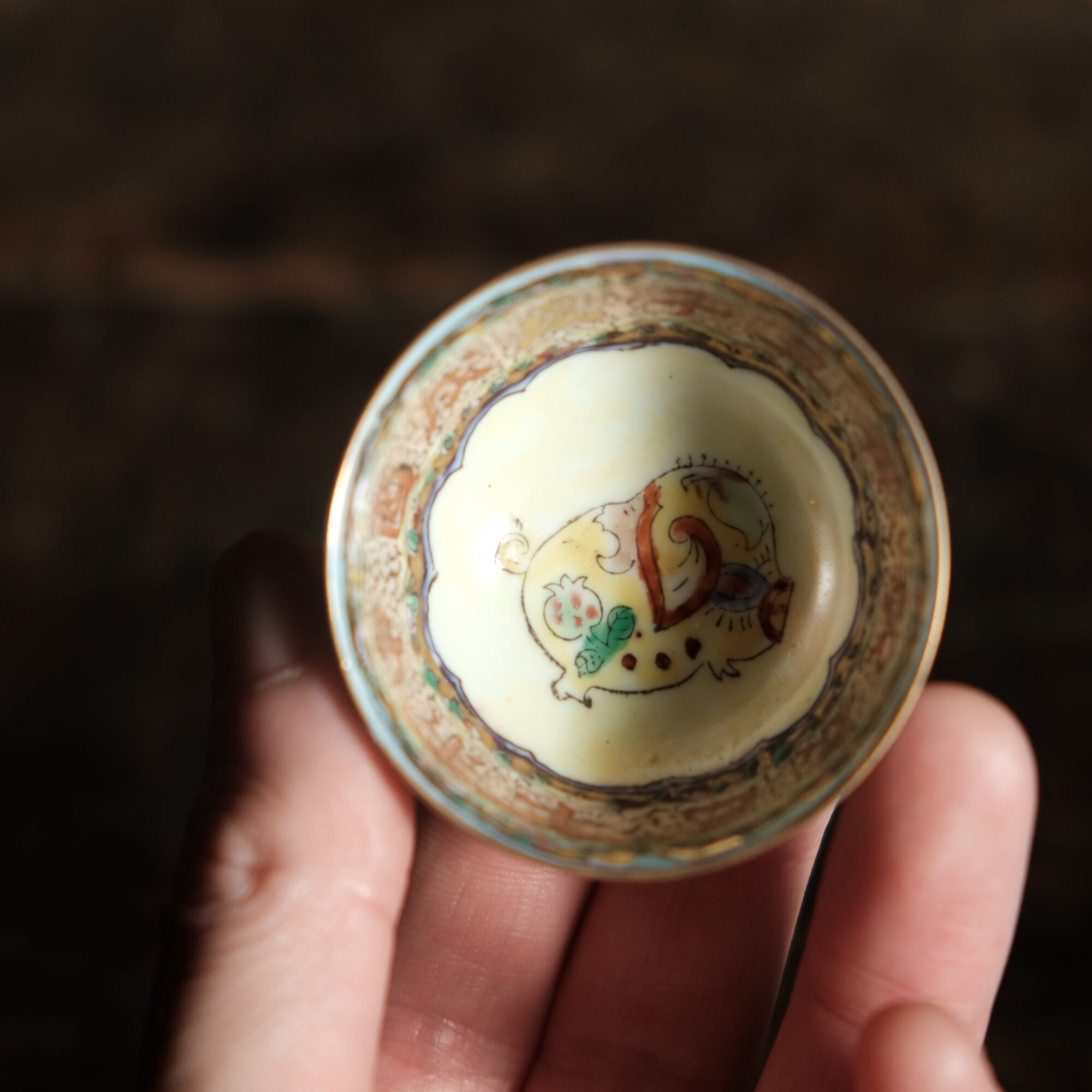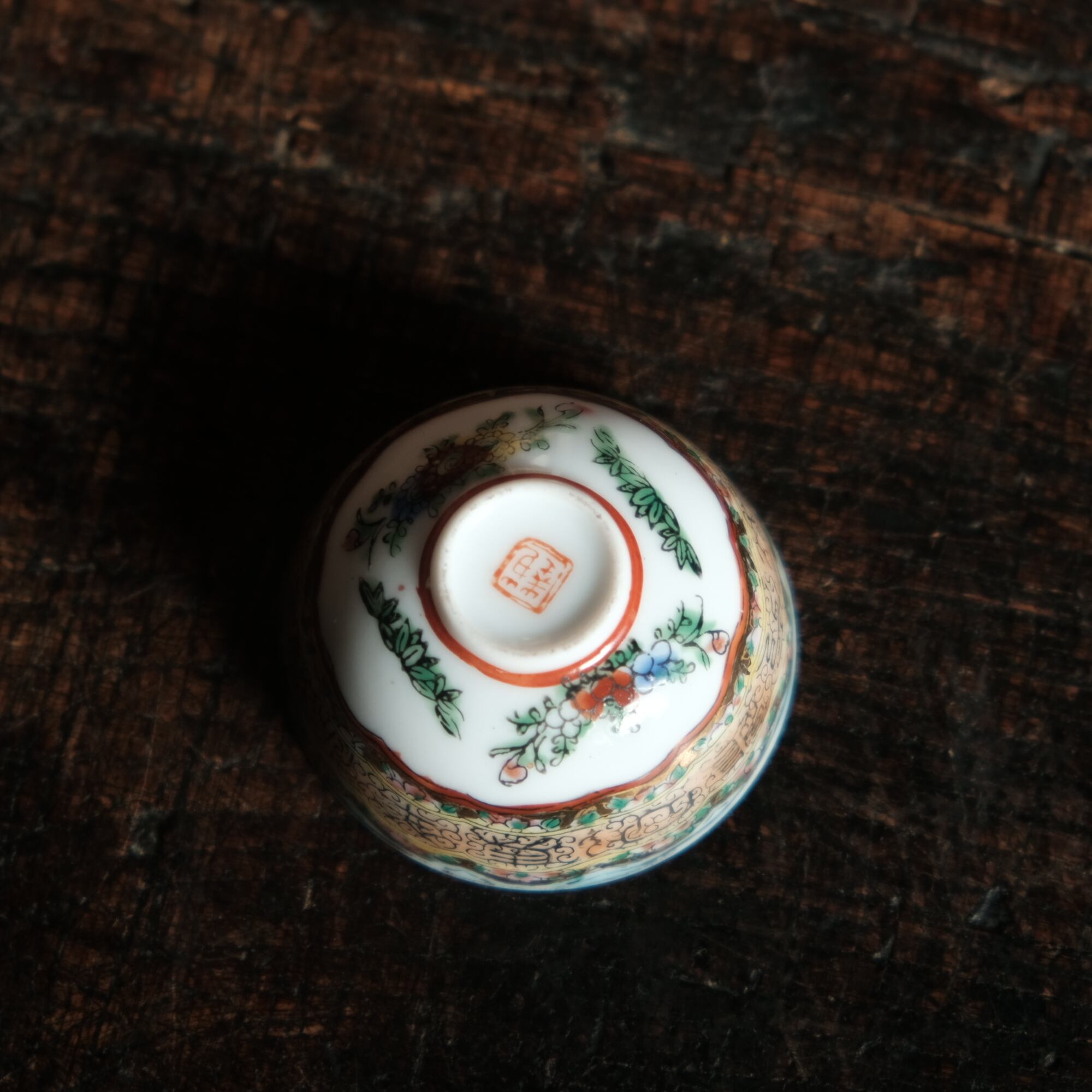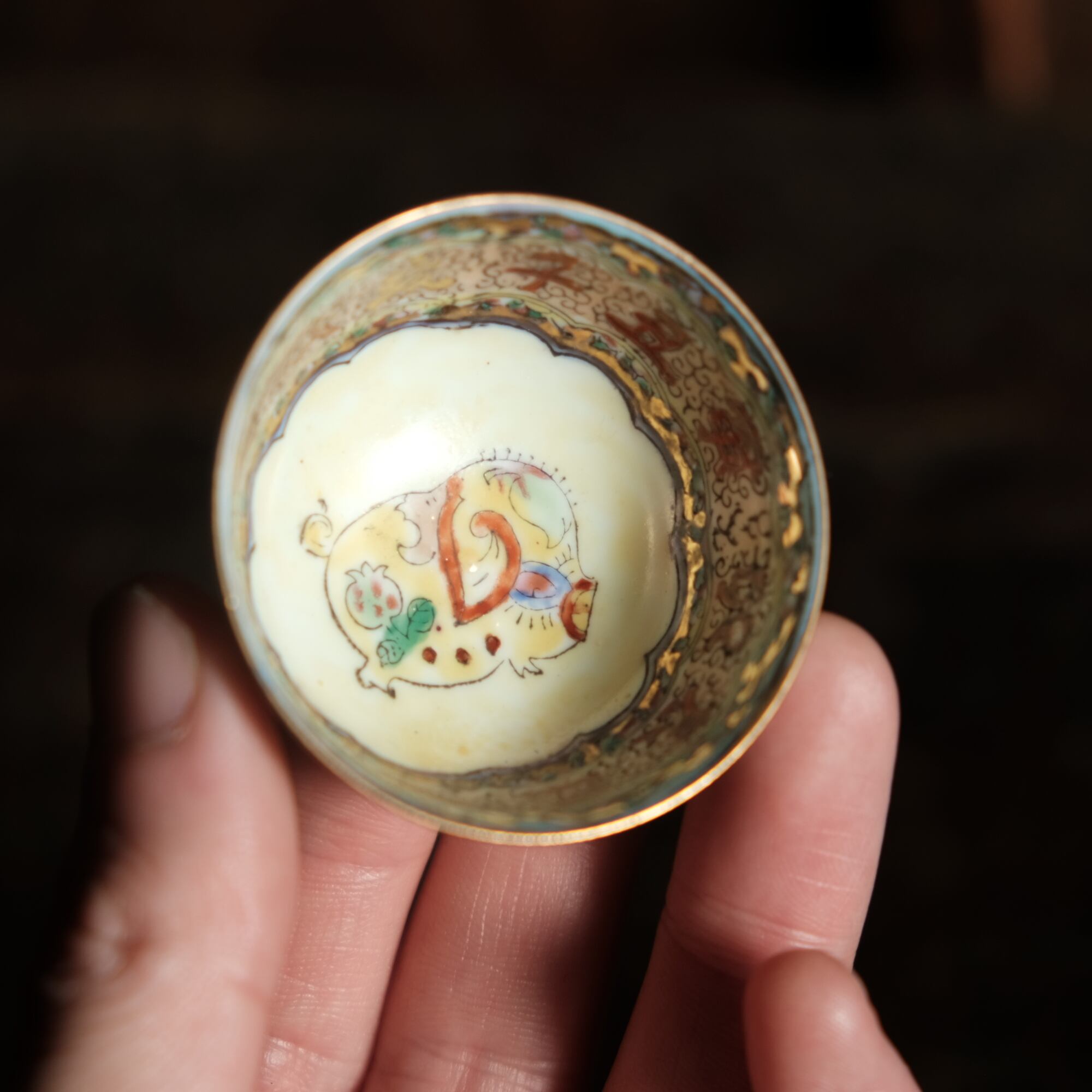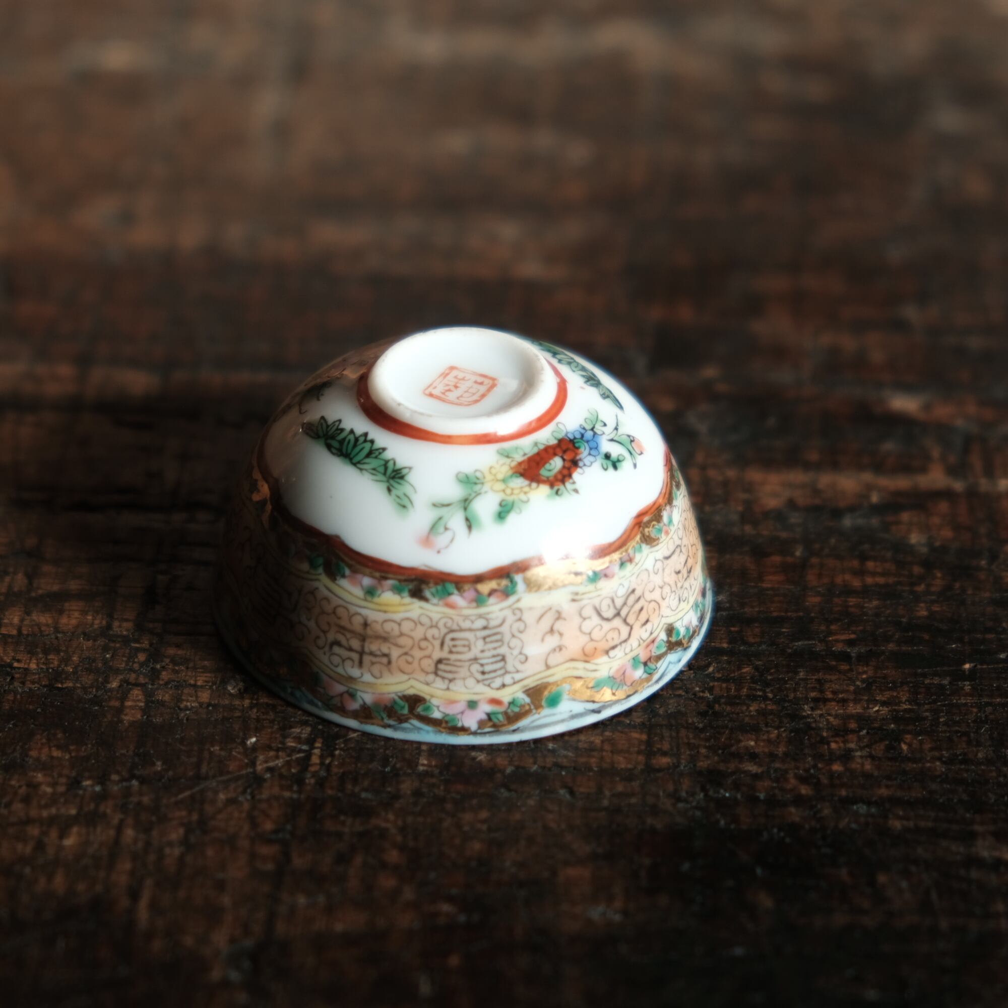 見込みに豚(亥)◆チャイナレトロで可愛い。中国産 干支文赤絵金彩小ぶり猪口 花尽くし。シノワズリ