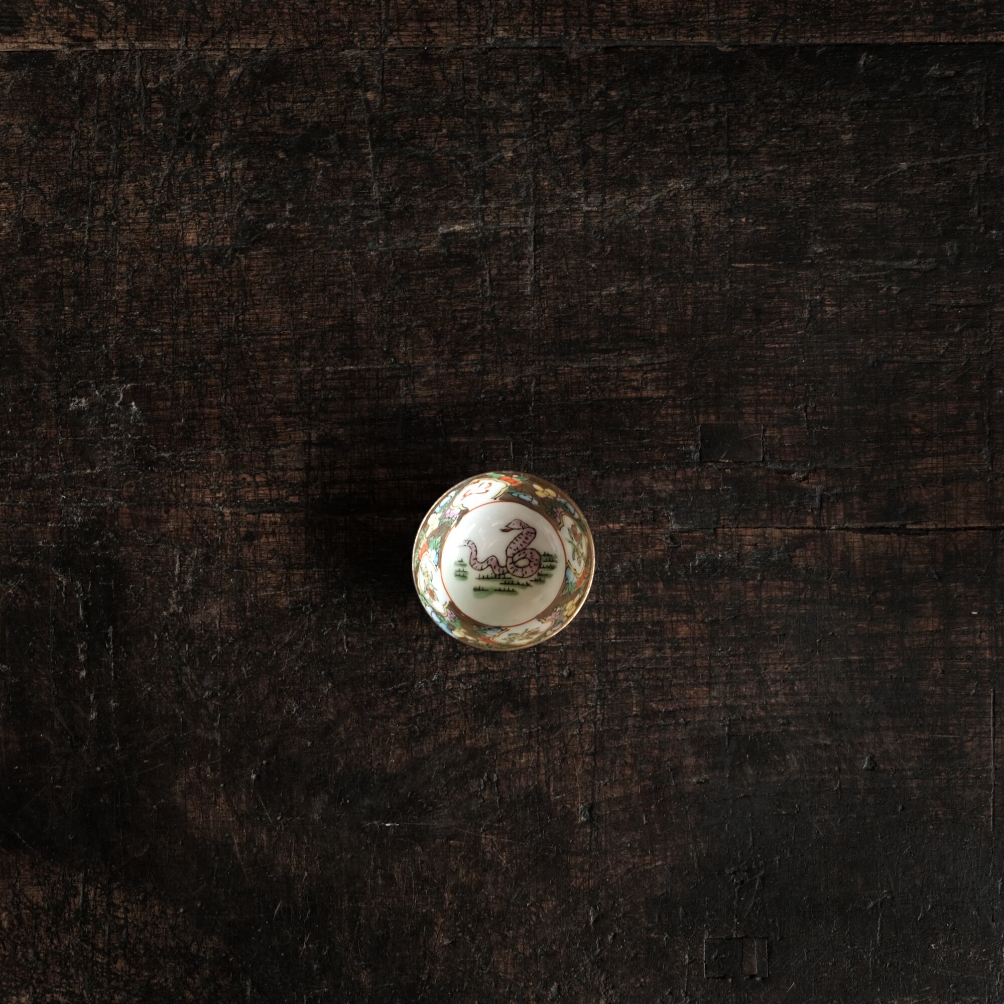 見込みに蛇(巳)◆草花と果実と漢字。中国景徳鎮 干支文色絵金彩小ぶり猪口 チャイナレトロ シノワズリ
