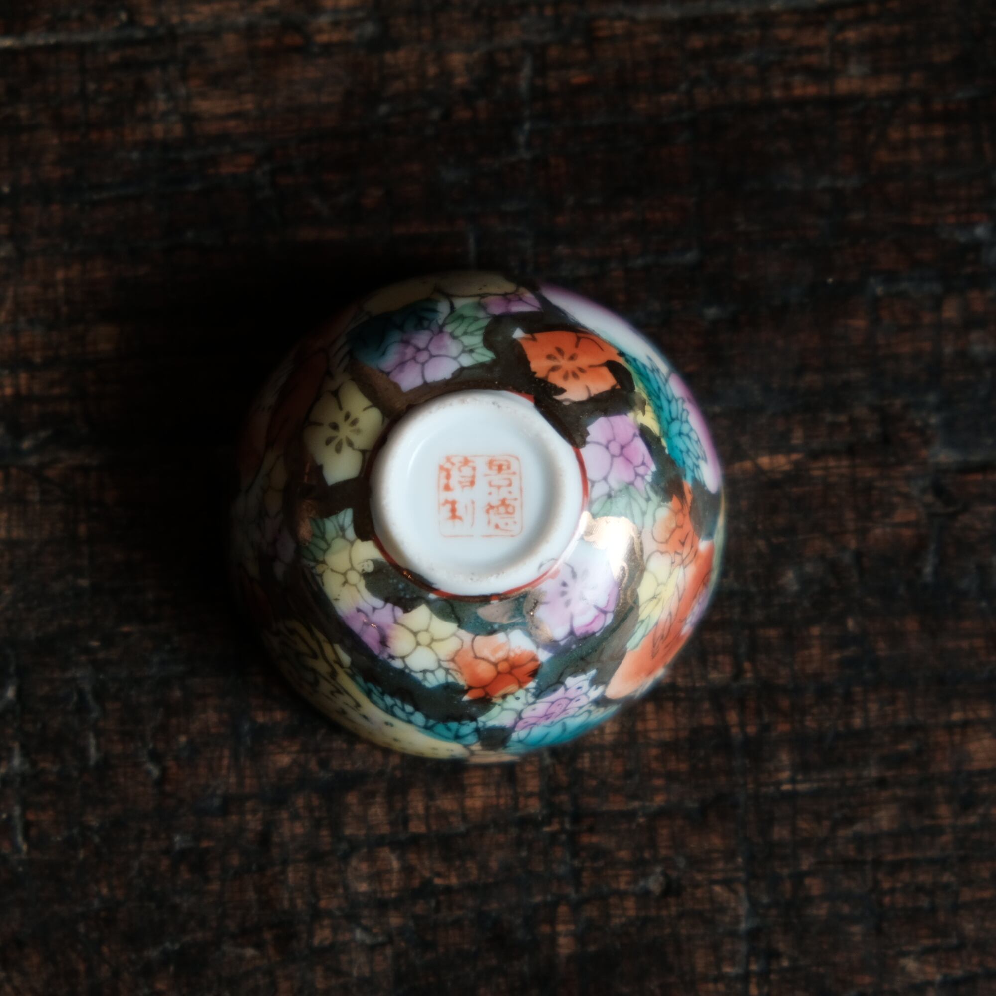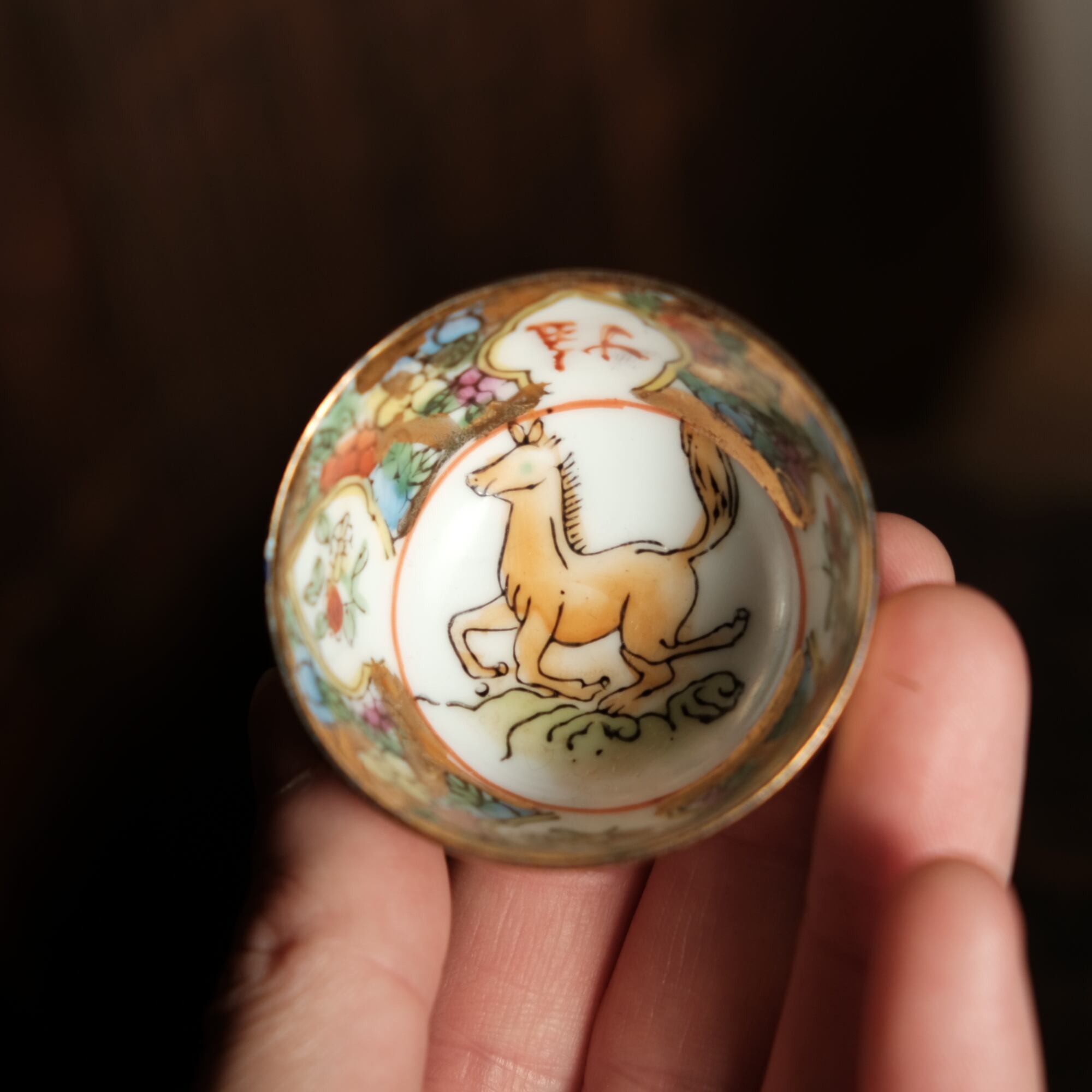 見込みに馬(午)◆草花と果実と漢字。中国景徳鎮 干支文色絵金彩小ぶり猪口 チャイナレトロ シノワズリ