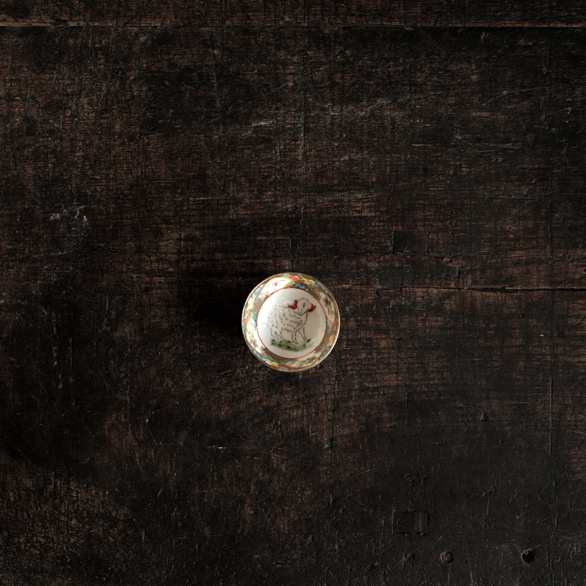 見込みに羊(未)◆草花と果実と漢字。中国景徳鎮 干支文色絵金彩小ぶり猪口 チャイナレトロ シノワズリ