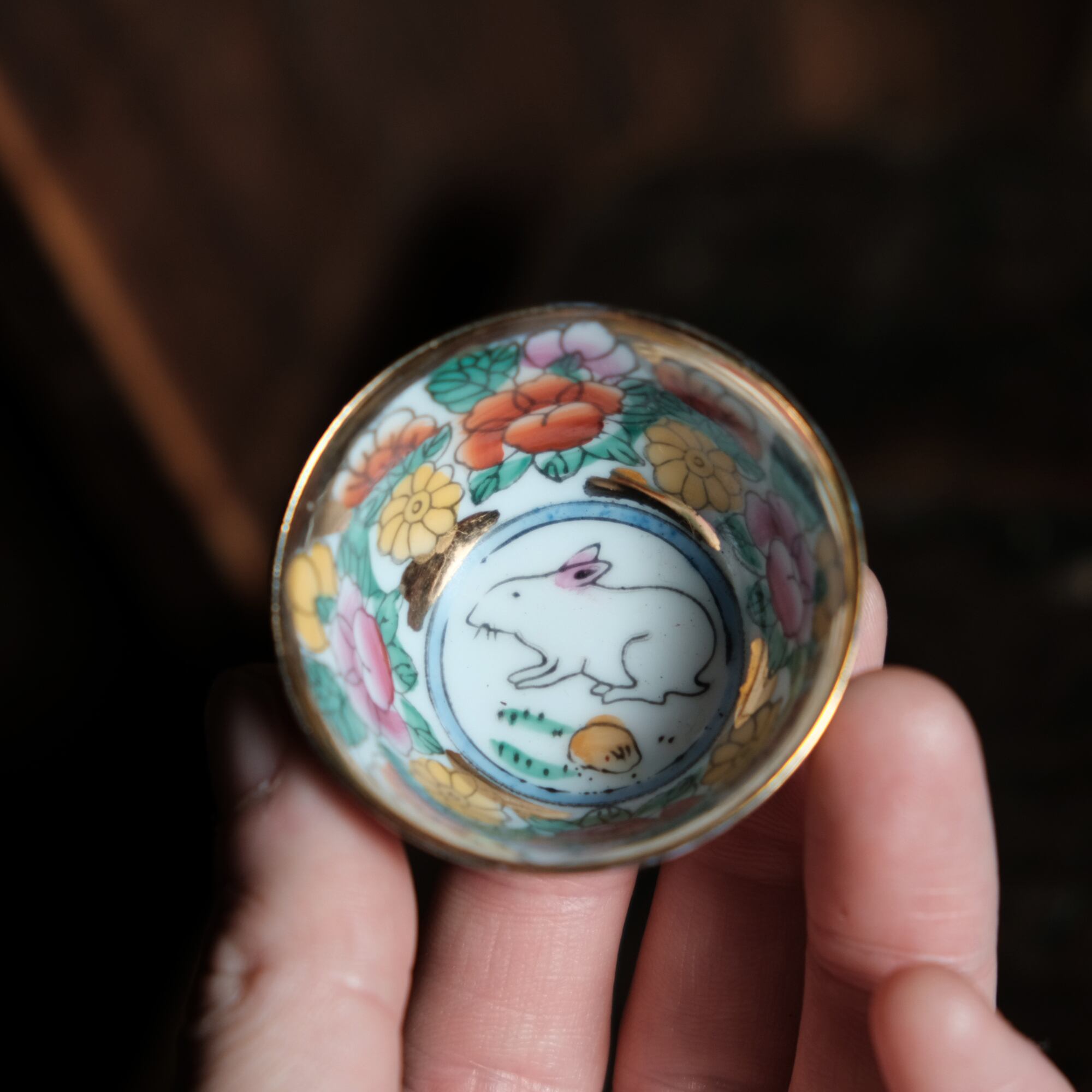 見込みに兎(卯)◆草花と果実。中国景徳鎮 干支文色絵金彩小ぶり猪口 チャイナレトロ シノワズリ b5