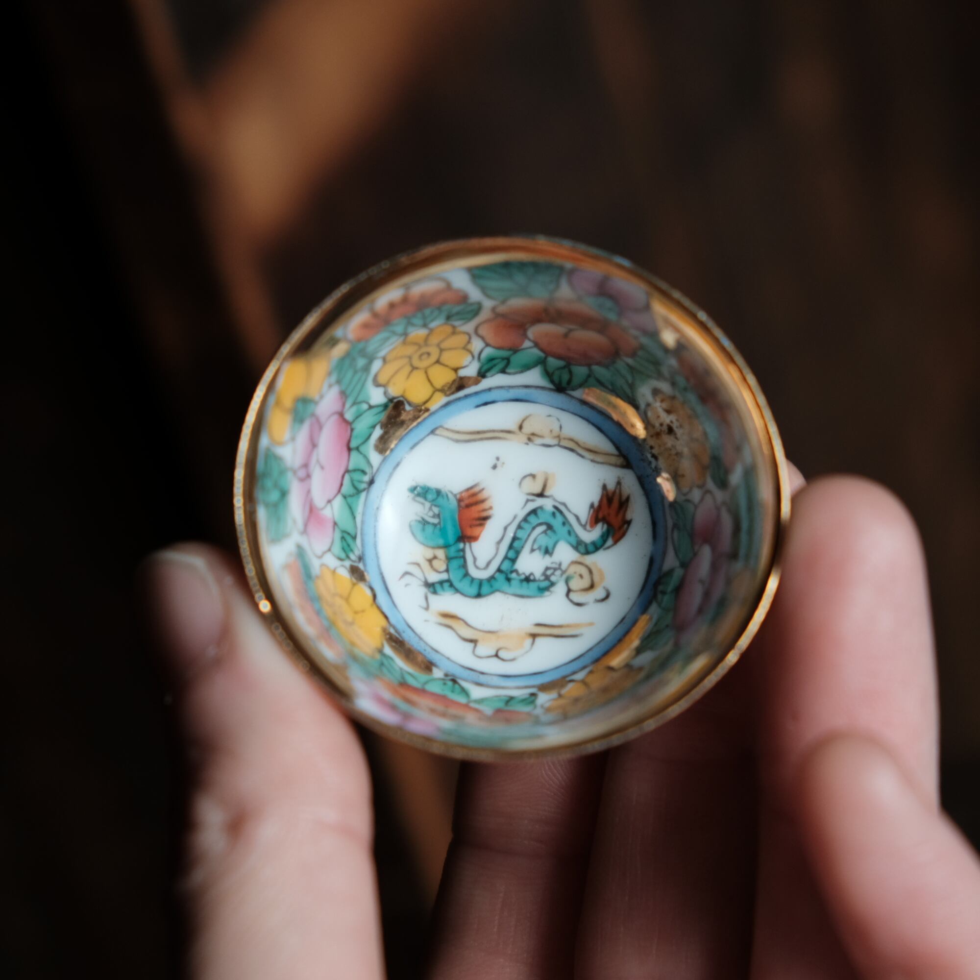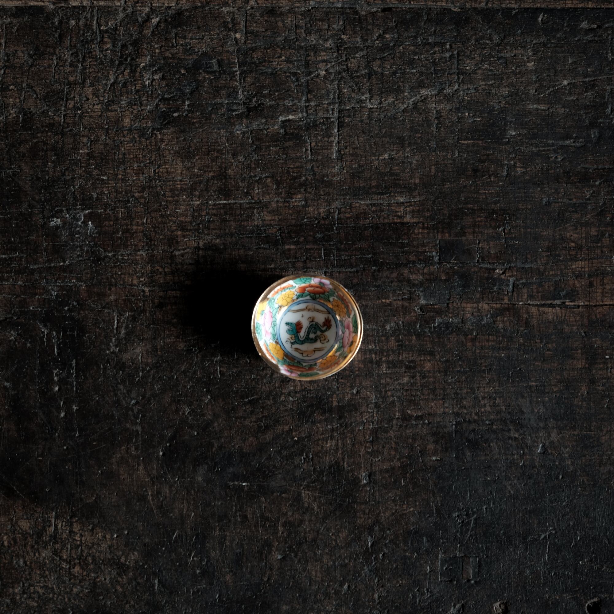 見込みに龍(辰)◆草花と果実。中国景徳鎮 干支文色絵金彩小ぶり猪口 チャイナレトロ シノワズリ b5