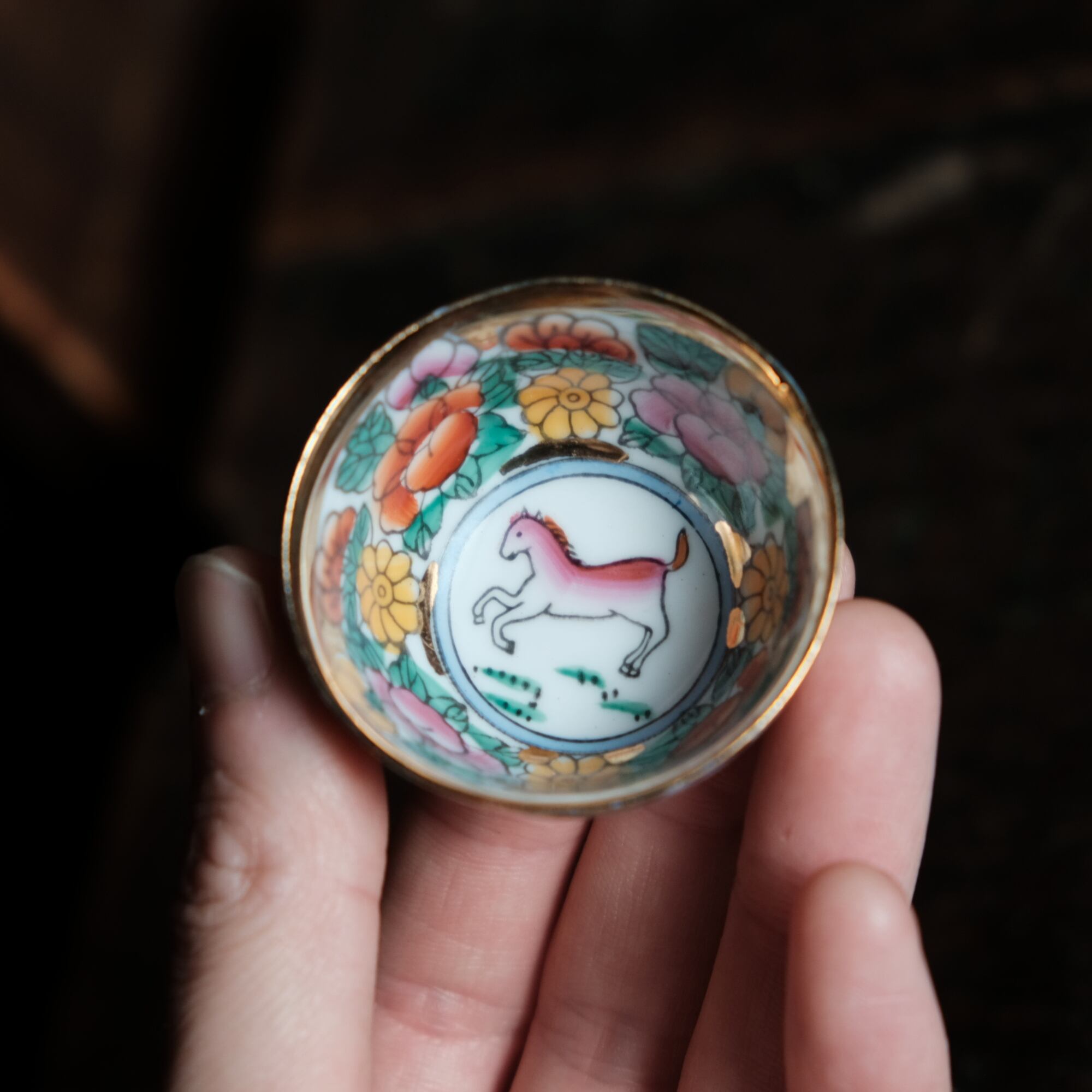見込みに馬(午)◆草花と果実。中国景徳鎮 干支文色絵金彩小ぶり猪口 チャイナレトロ シノワズリ b5