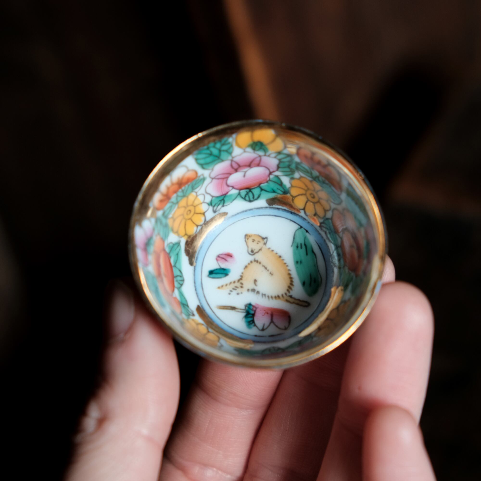 見込みに猿(申)◆草花と果実。中国景徳鎮 干支文色絵金彩小ぶり猪口 チャイナレトロ シノワズリ b5